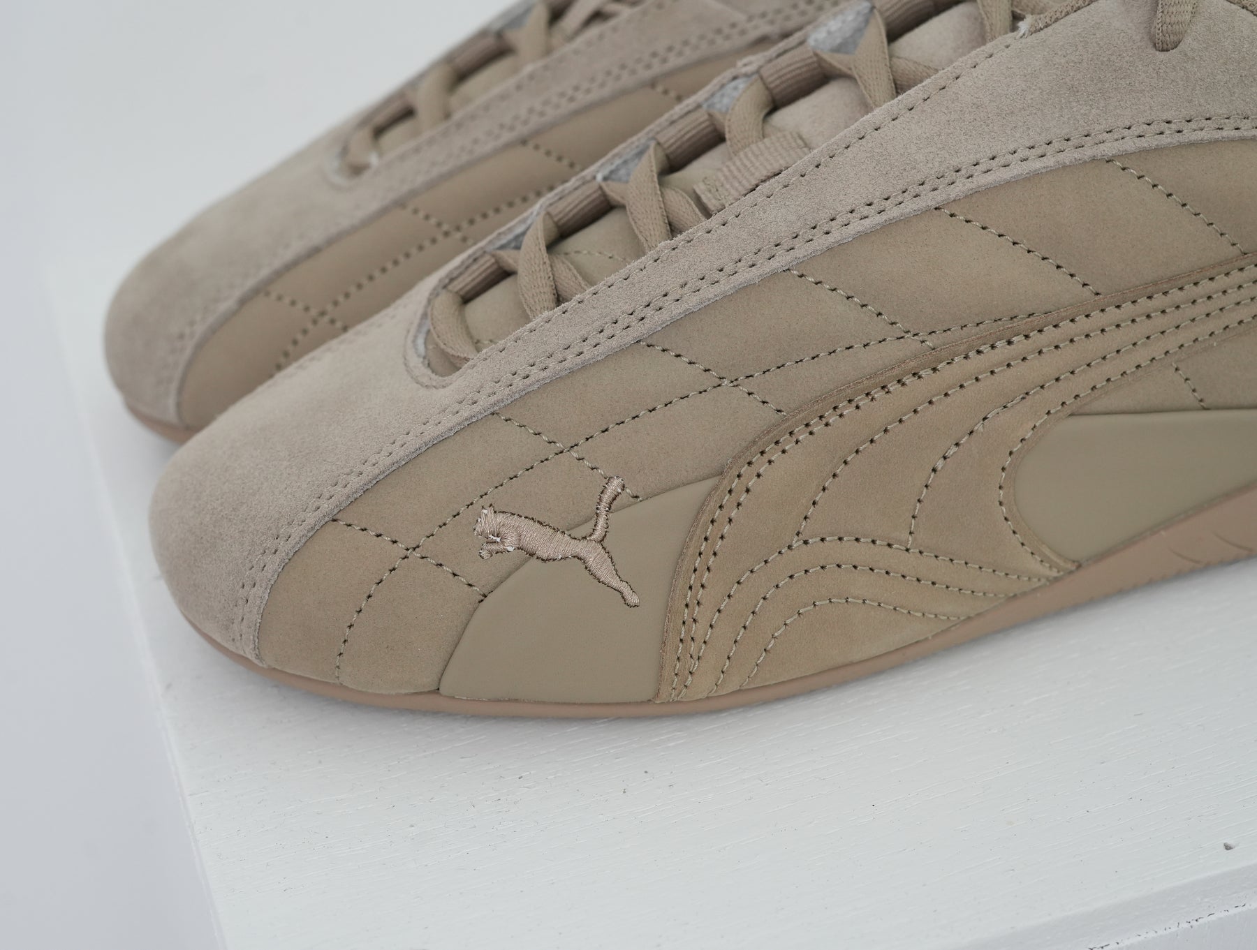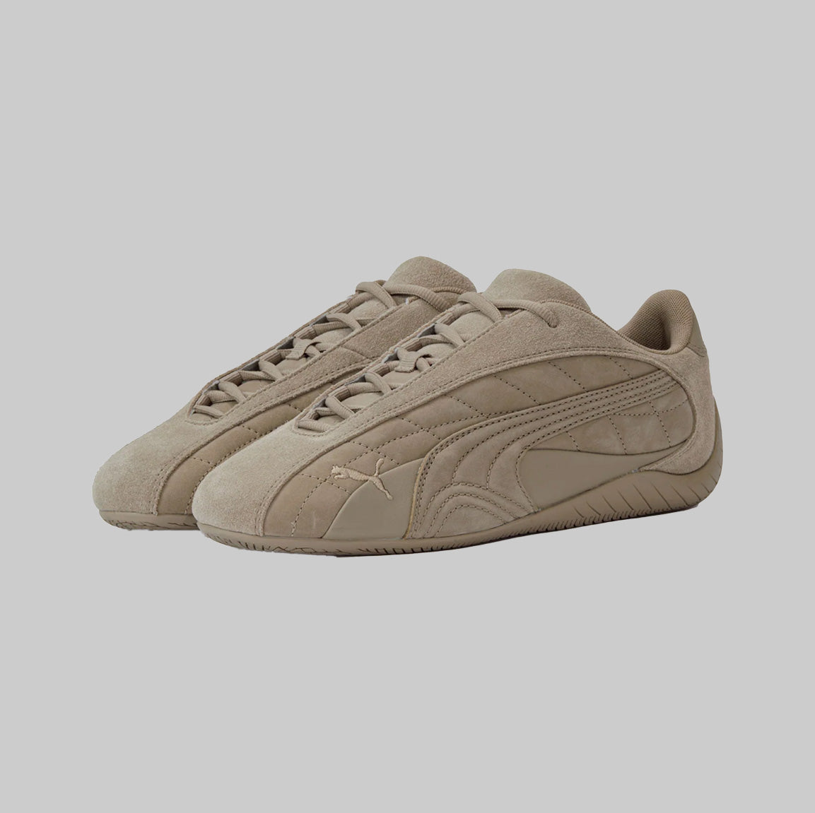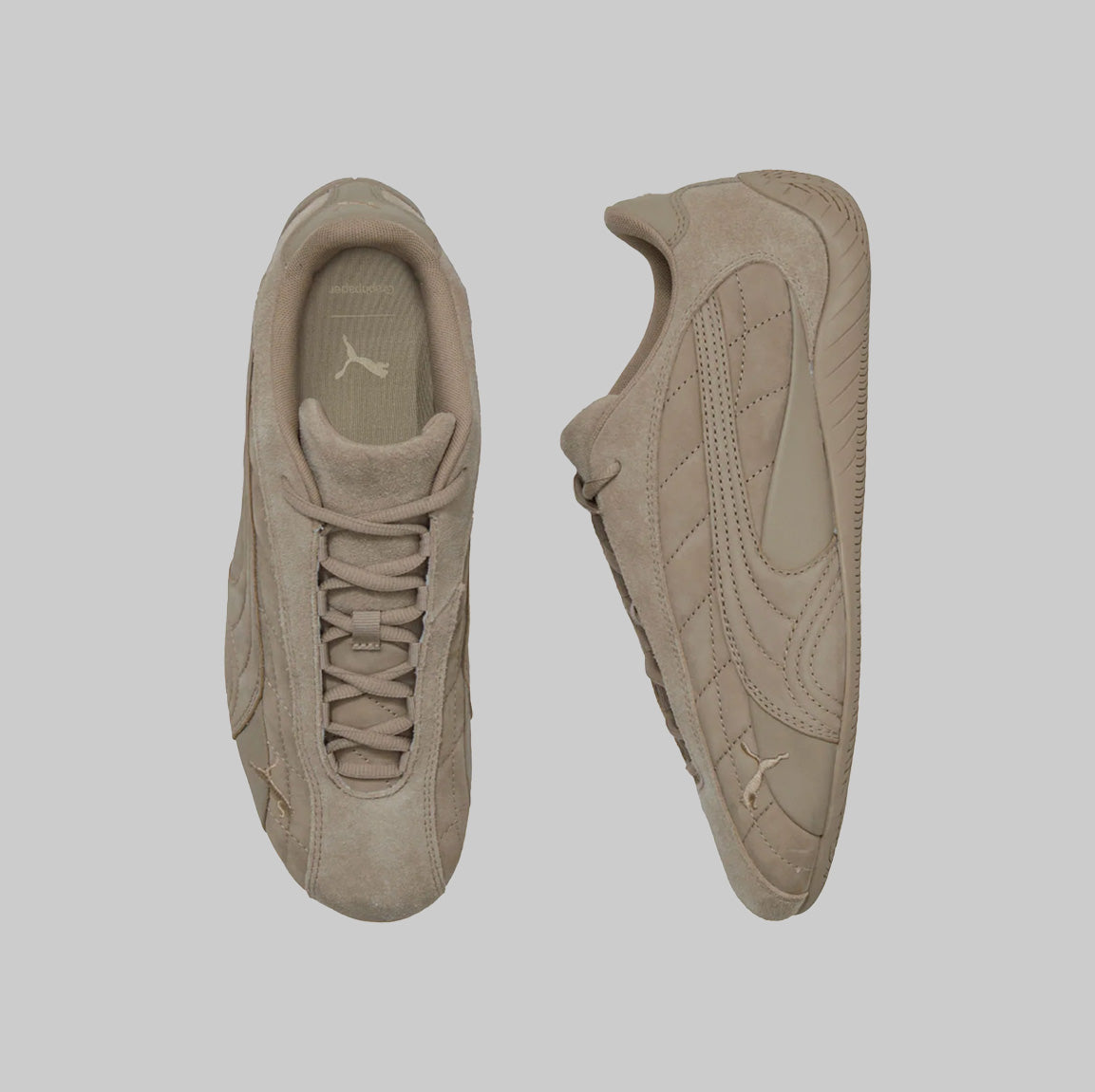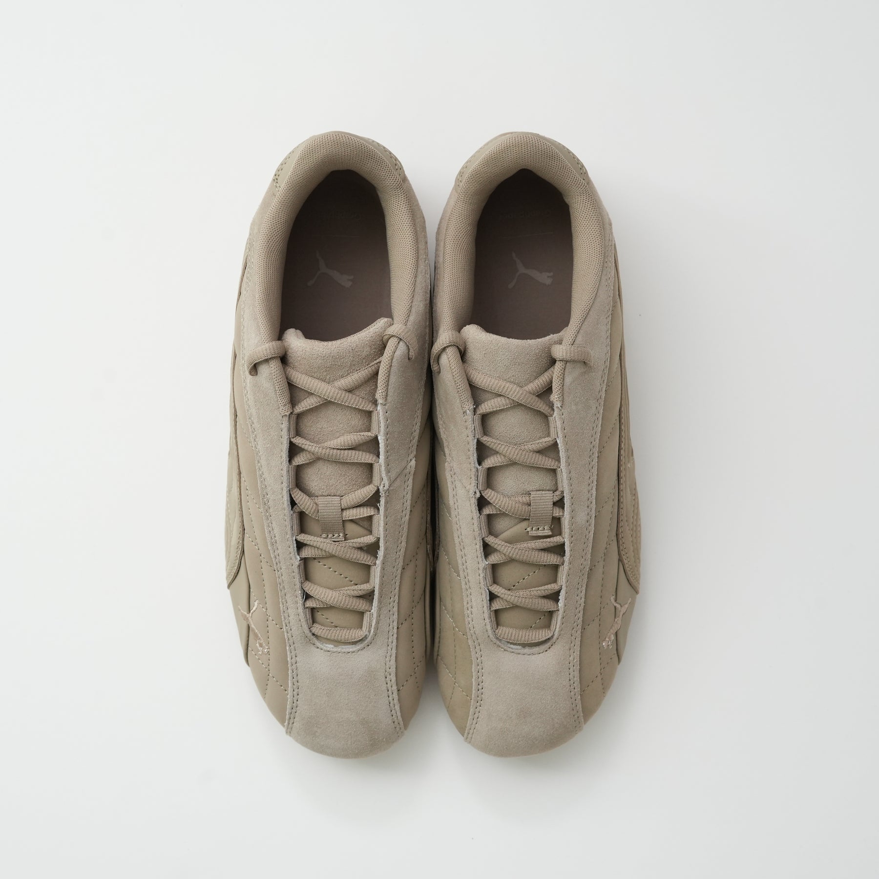 1999年に誕生し、80年代から90年代にかけてF1グランプリのドライバーが履いていた耐熱レーシングシューズをベースにしたライフスタイルシューズ。レーシングにインスパイアされたなめらかなラインと空気力学に基づいたデザインにより、ファッションやスニーカーカルチャーに衝撃を与えてきました。アイレットを隠したミニマルなSPEEDCAT PLUSをベースに、25AWのテーマを表現する様、アッパーにはスムース、ショートスエード、ヌバックの3つの革を使用し、ソール、刺繍すべてを同色で統一したモダンな仕上がりに。