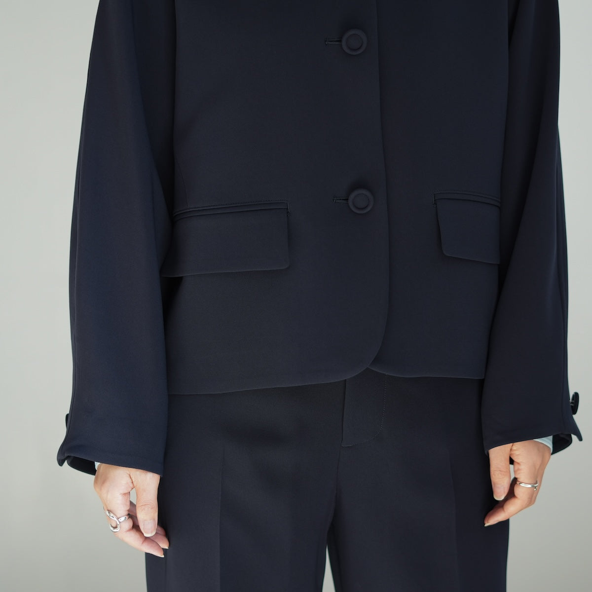 トリアセテート特有のさらりとした質感に、ストレッチポリエステルを組み合わせたダブルクロス生地は、上品な光沢と美しいドレープが魅力。