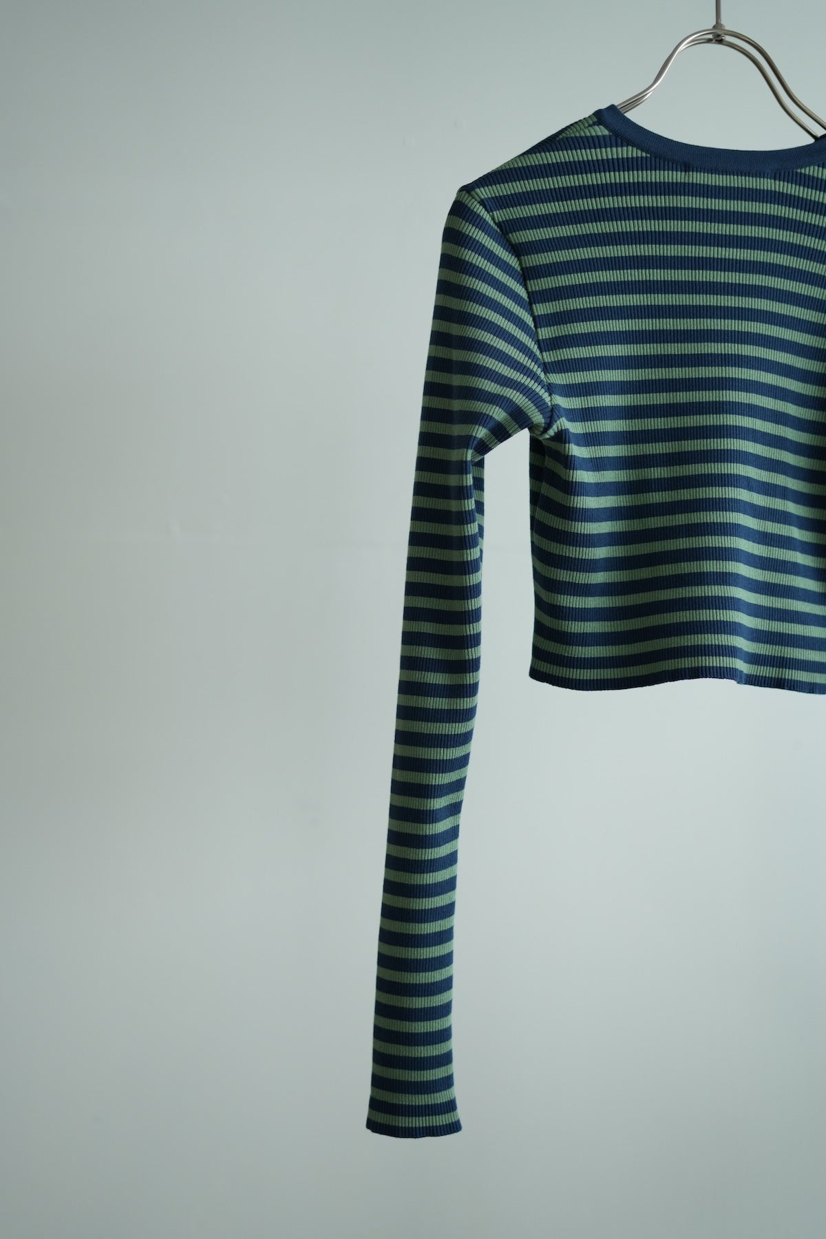 エジプト産の超長綿・ギザコットンを使用し、20ゲージで限界まで度目を詰めて丁寧に編み立てたリブニットです。
