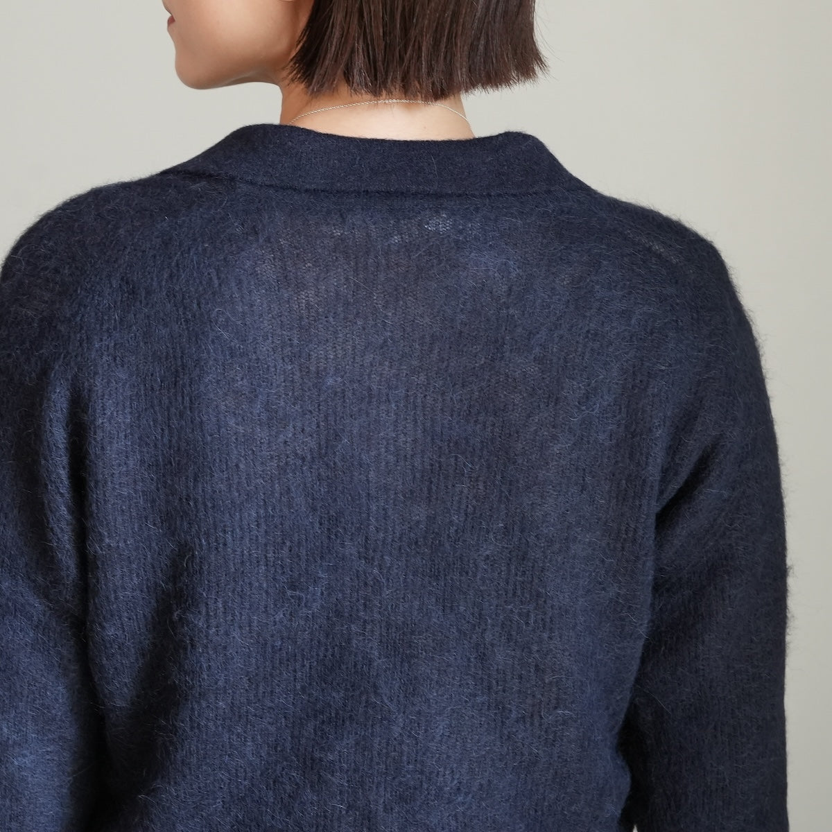 襟元はスキッパーポロタイプの程良くゆとりのあるニット。