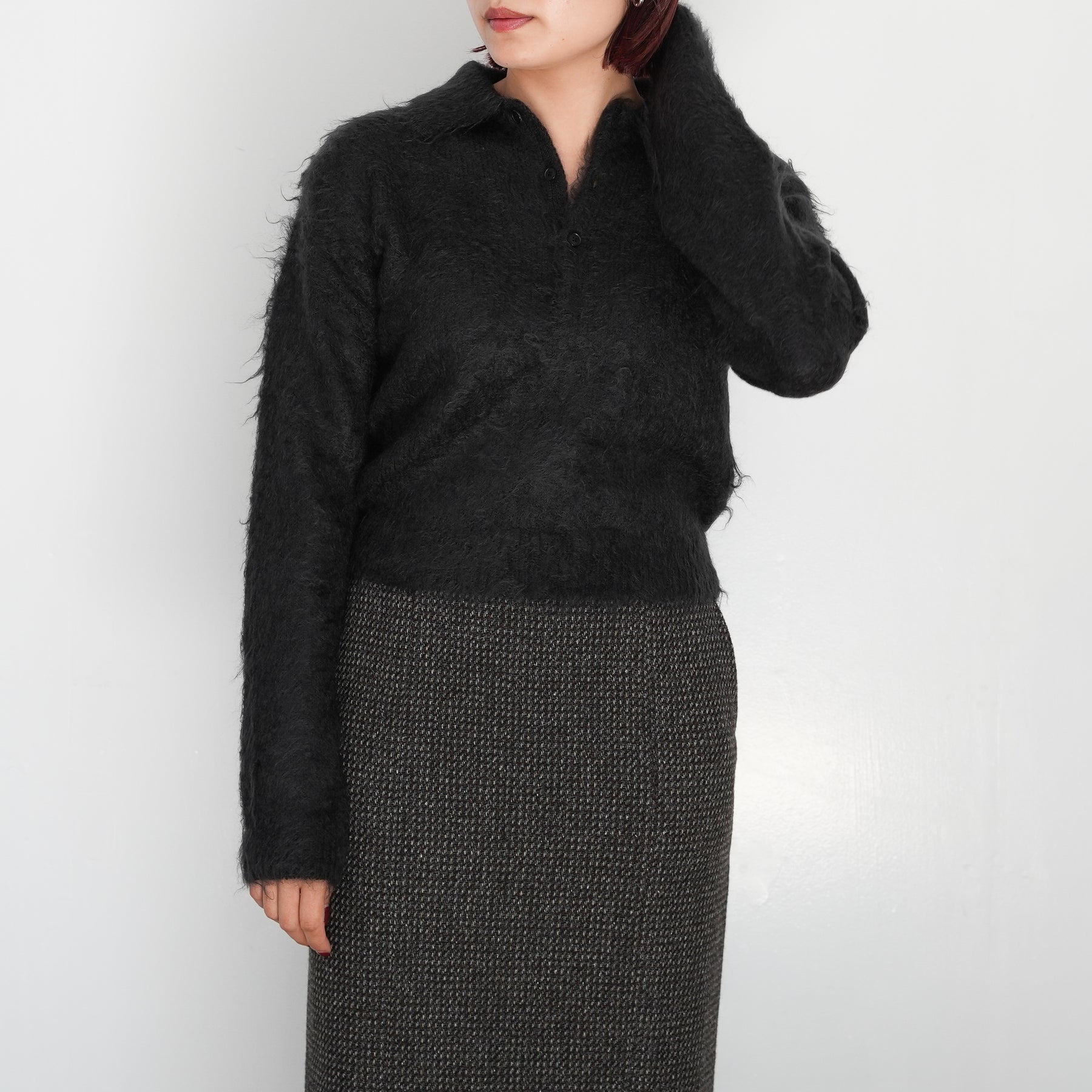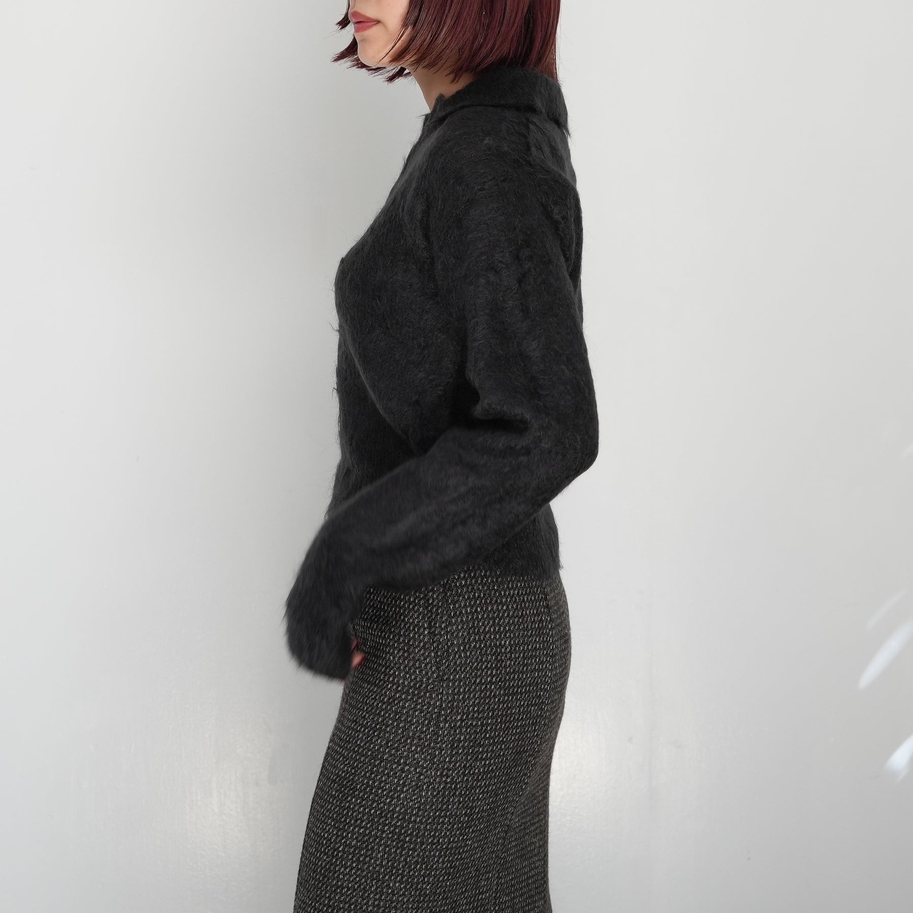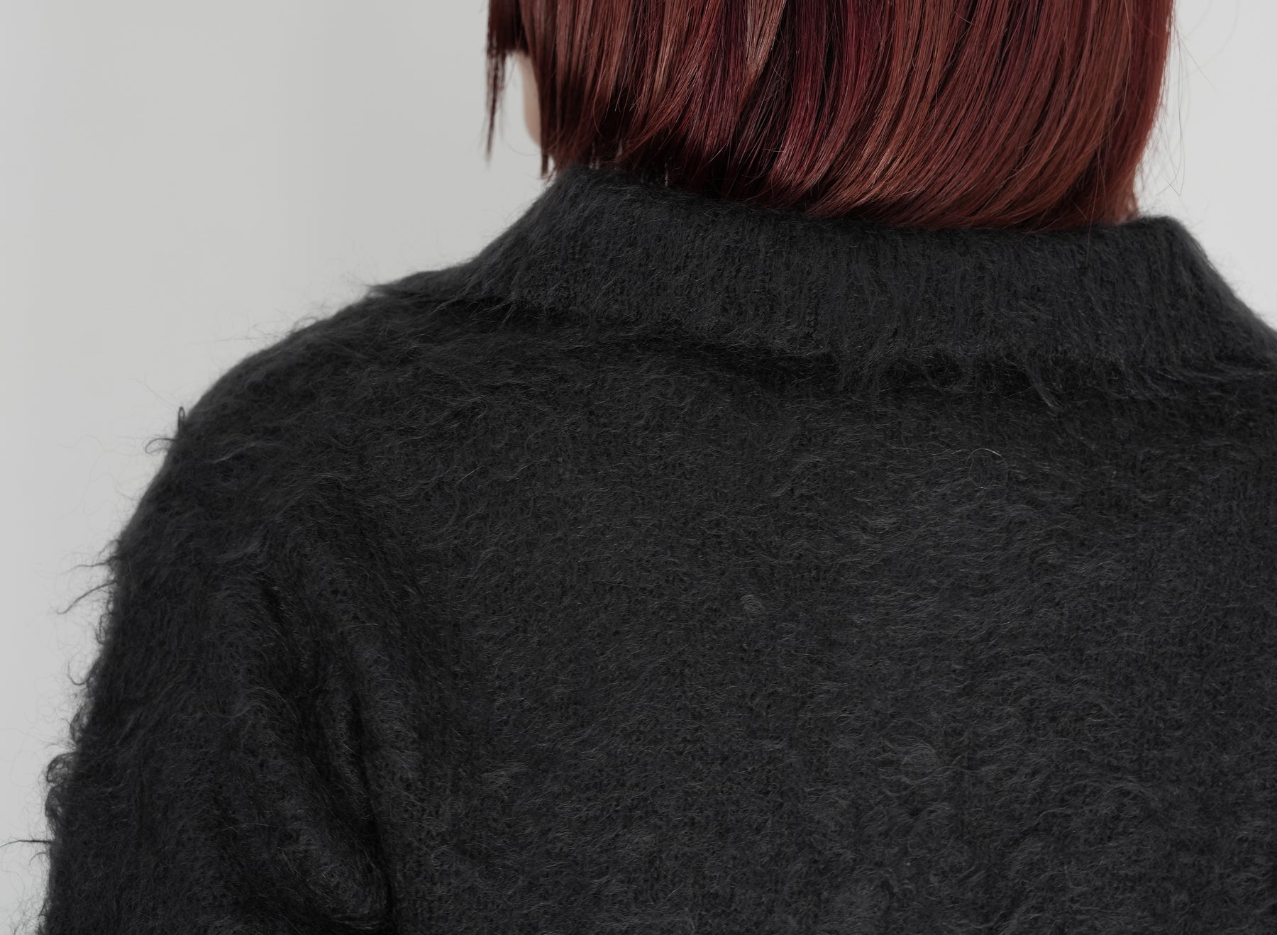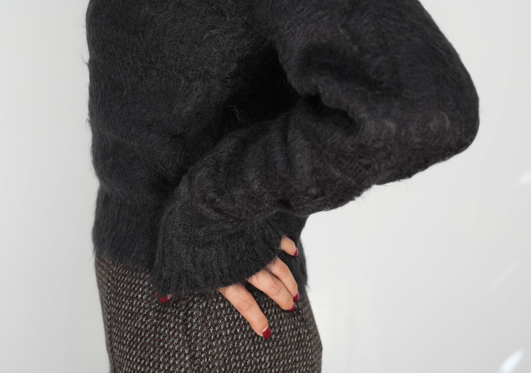 南アフリカ産の柔らかなスーパーキッドモヘヤを甘撚りに紡績し、芯糸には柔らかな天然ウールを使用して編み上げた、ふんわりとした温かみを感じる極上のモヘヤニットです。