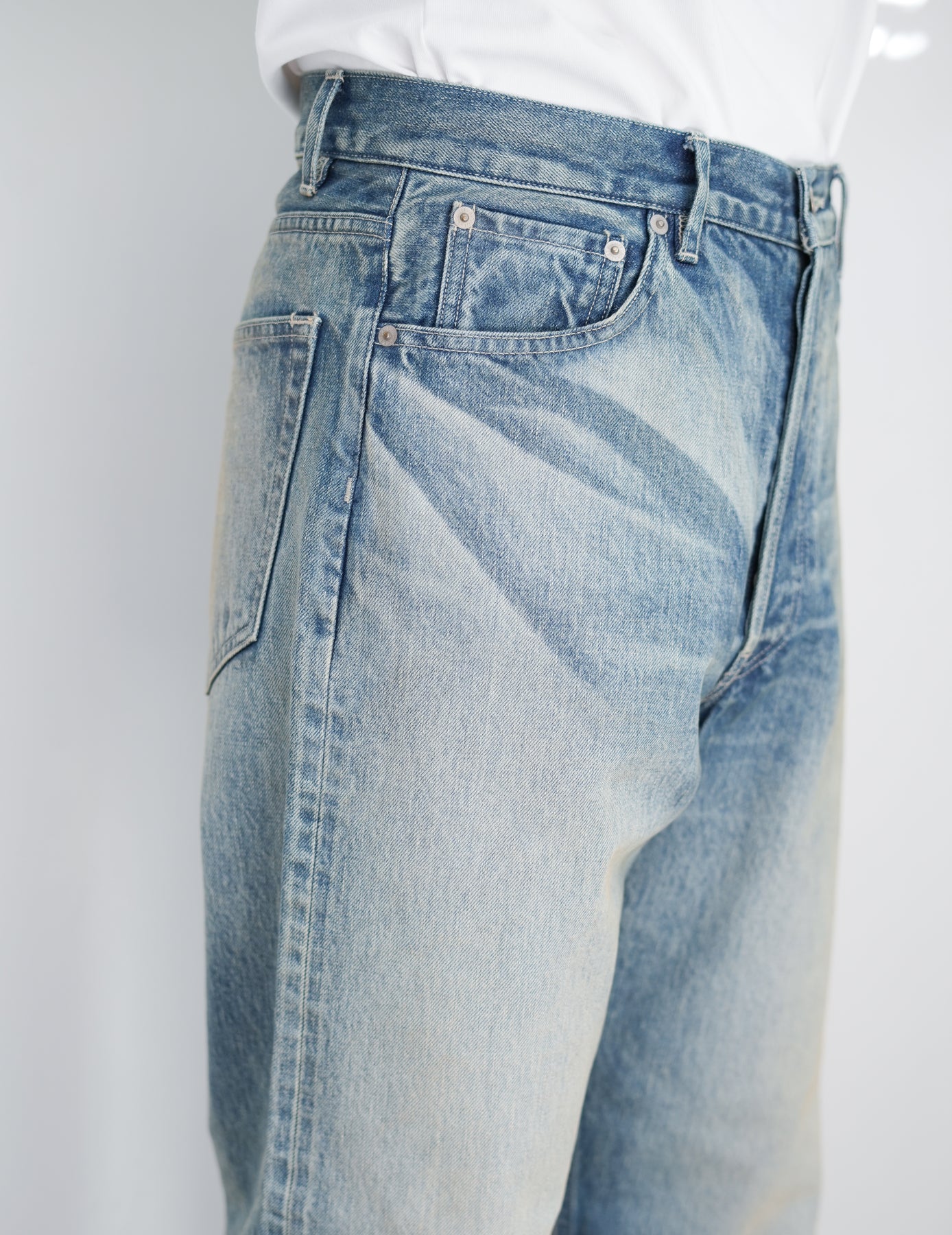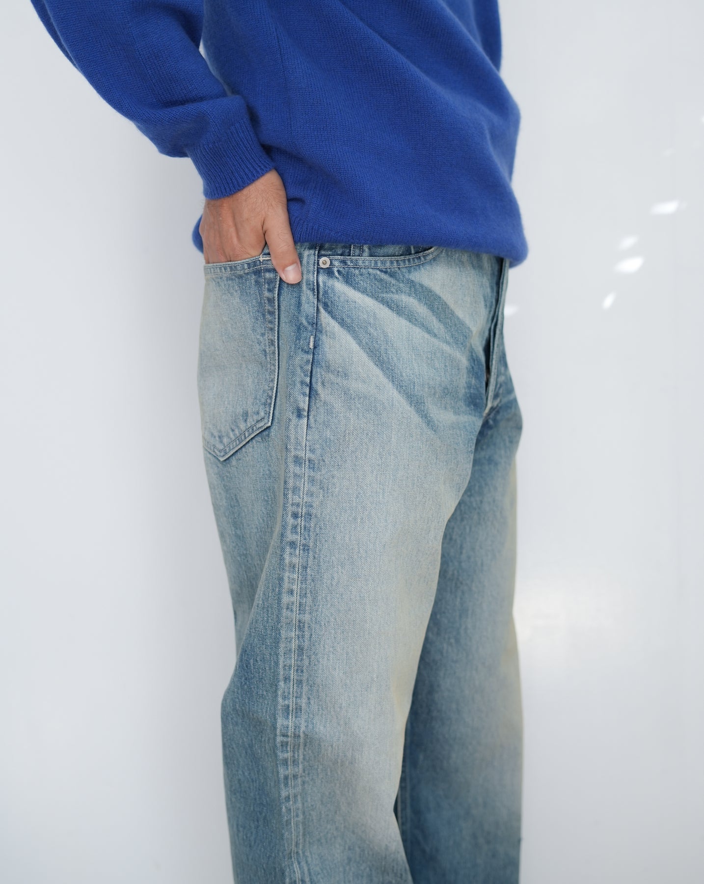 ビンテージデニムの風合いを追求し、シャトル織機を使用してじっくりと時間をかけて織り上げた、やや厚手のデニム素材です。