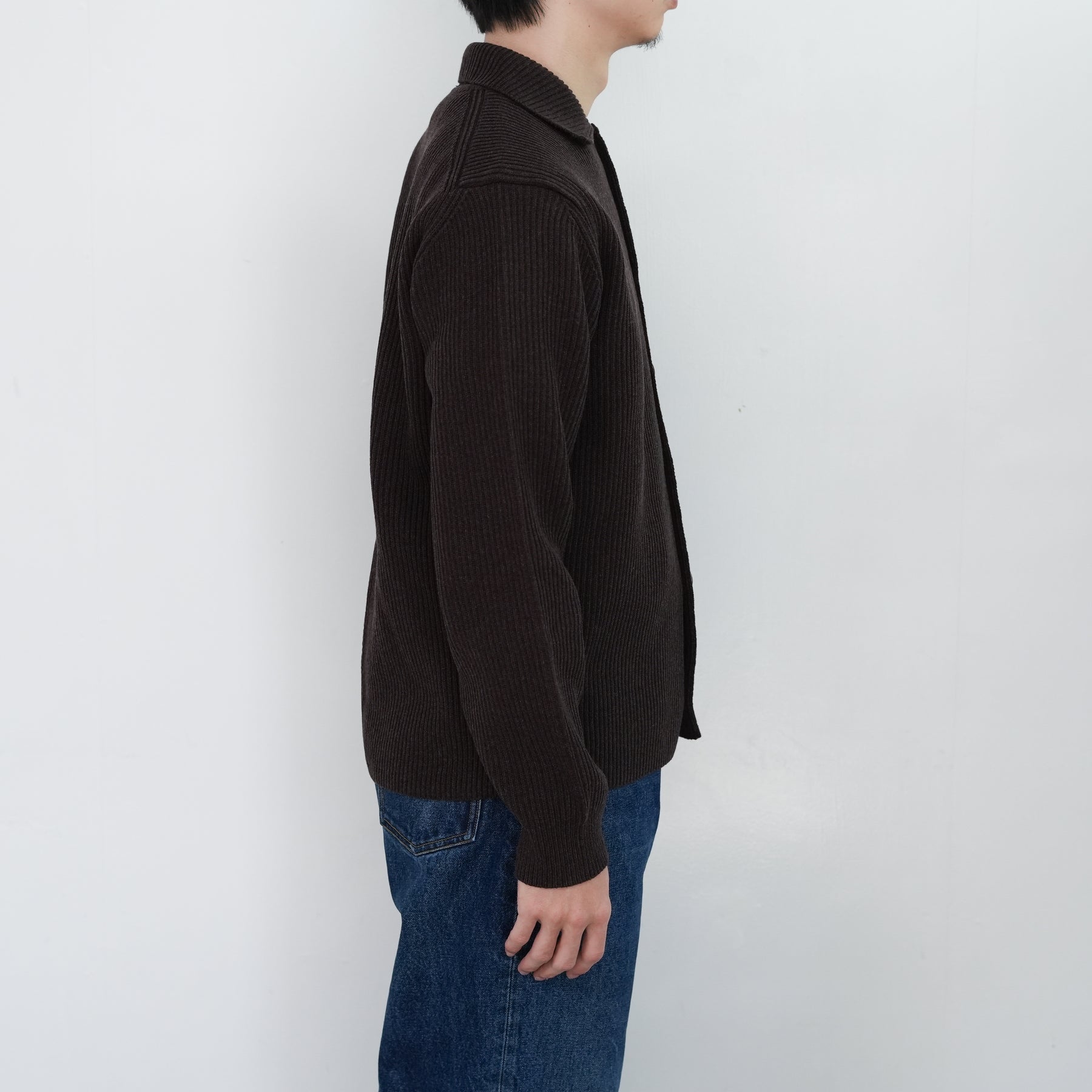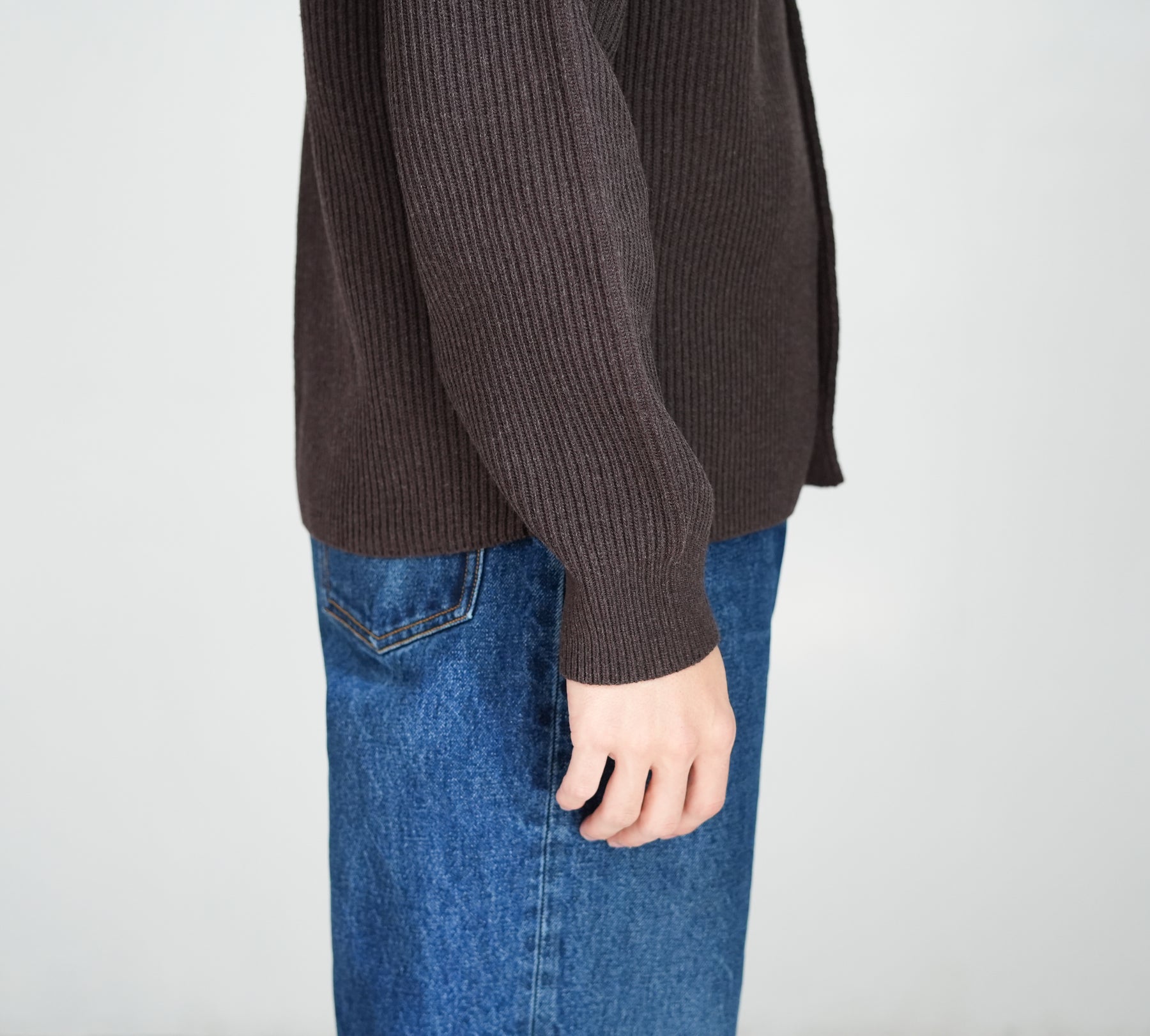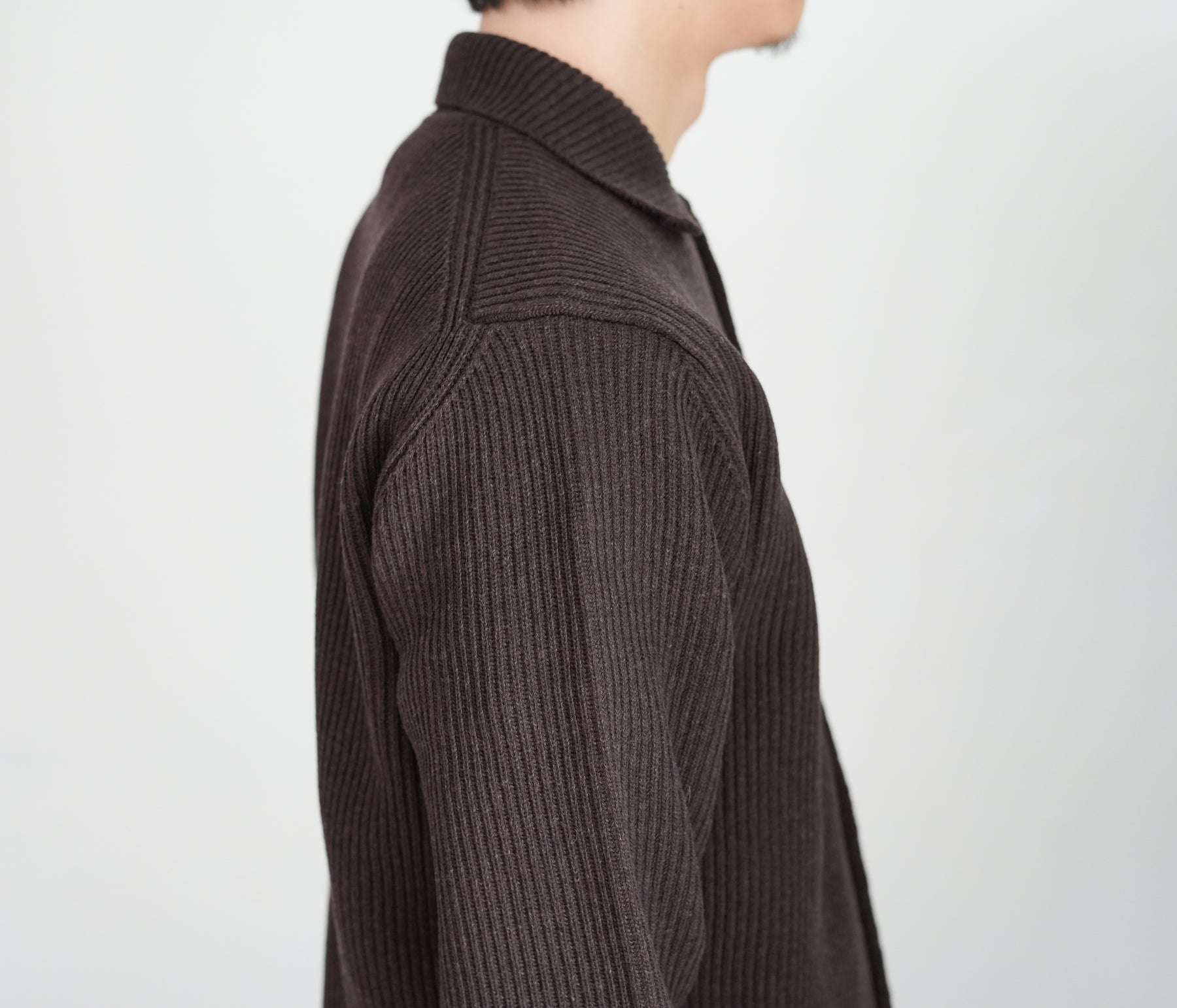 Super160'sの超極細番手ウールを紡毛に紡績し、限界まで度目を詰めて編み立てた両畦編みニットです。
