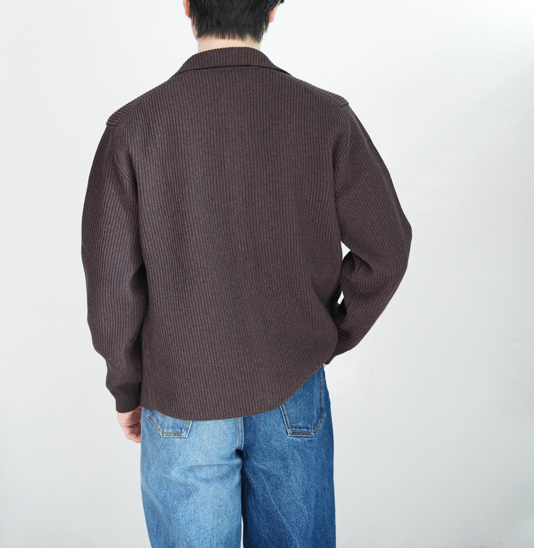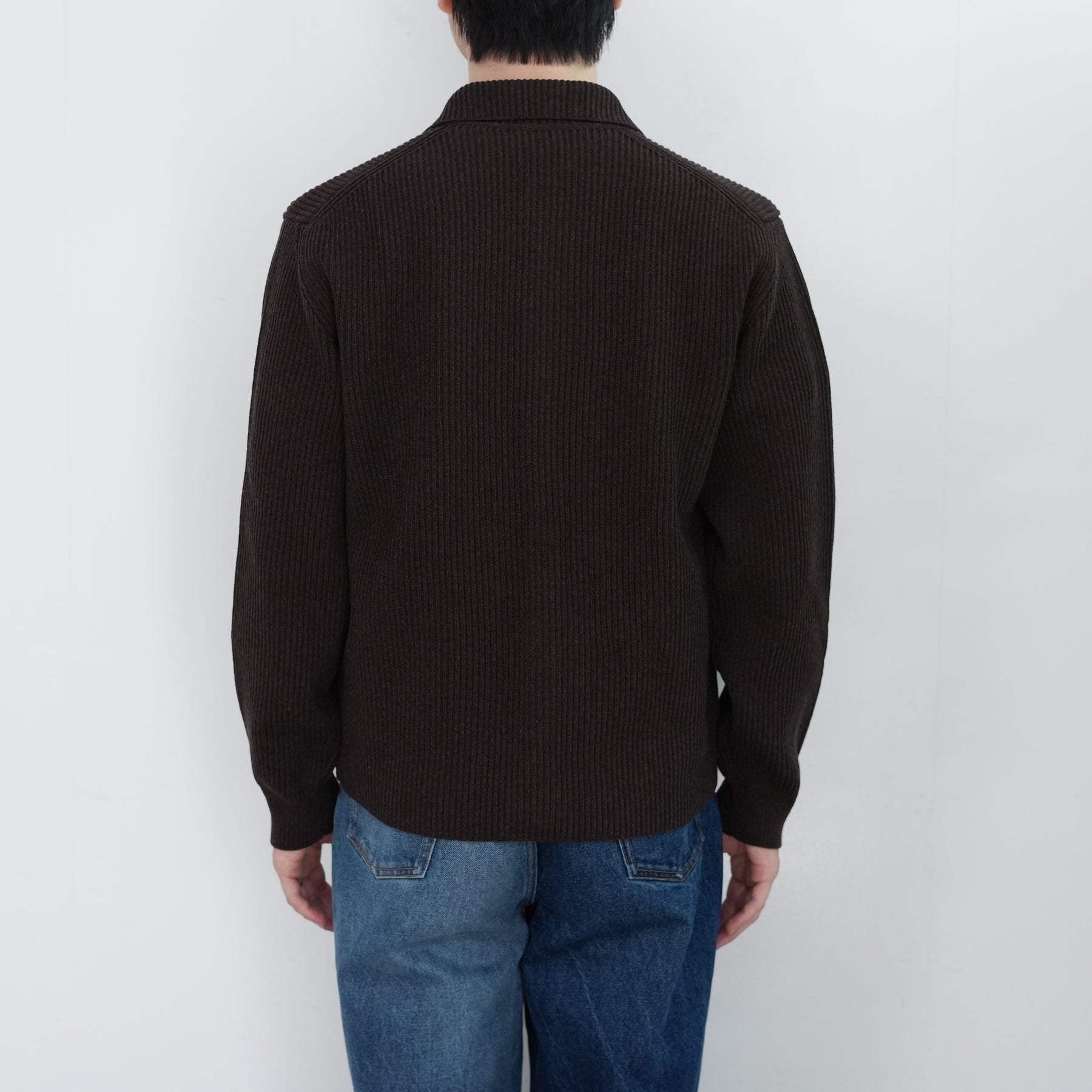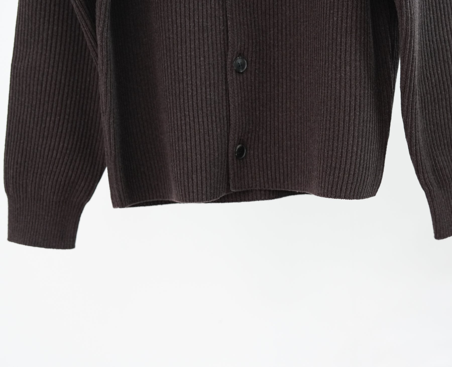 Super160'sの超極細番手ウールを紡毛に紡績し、限界まで度目を詰めて編み立てた両畦編みニットです。