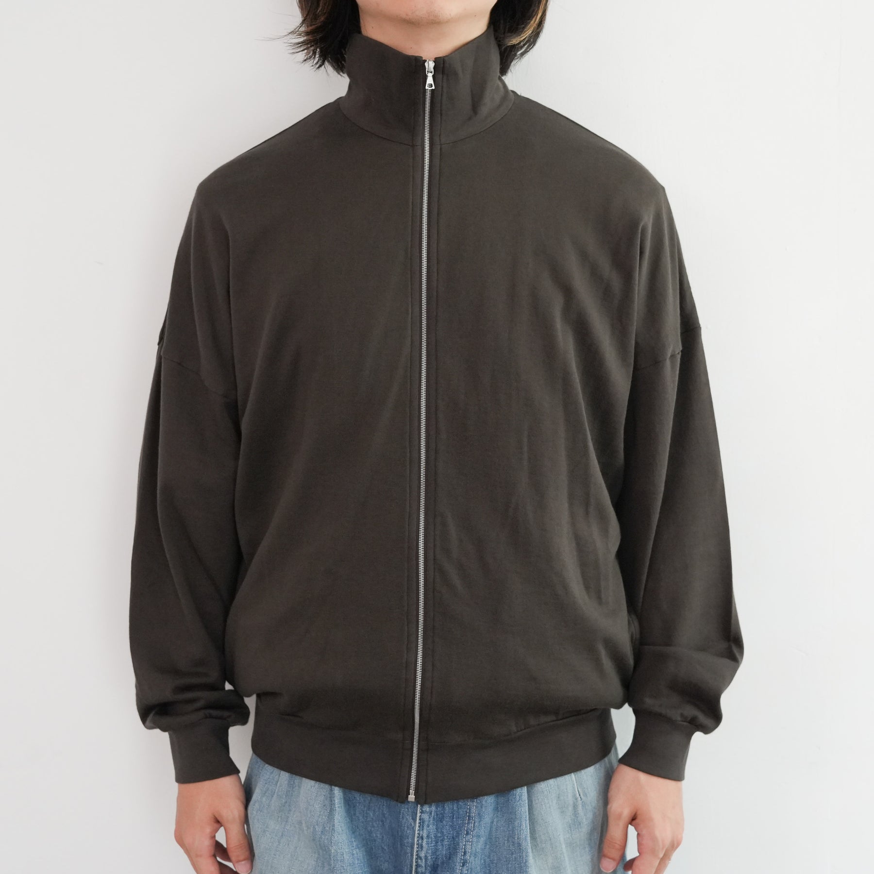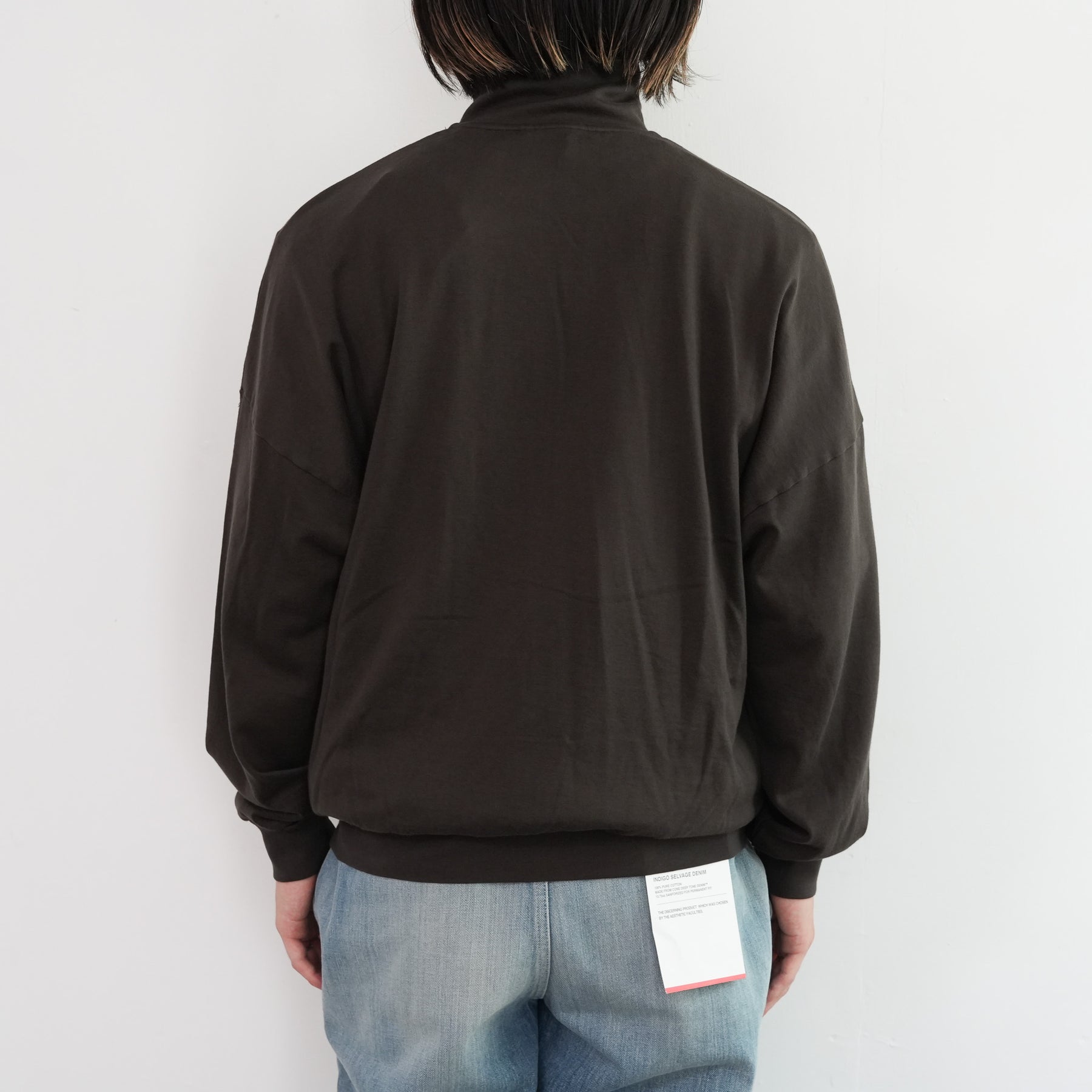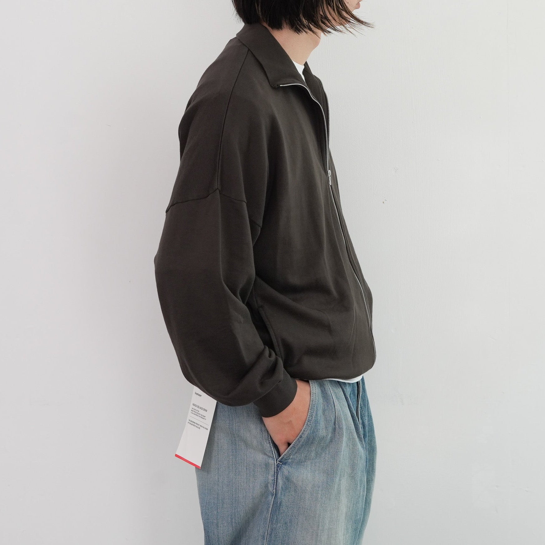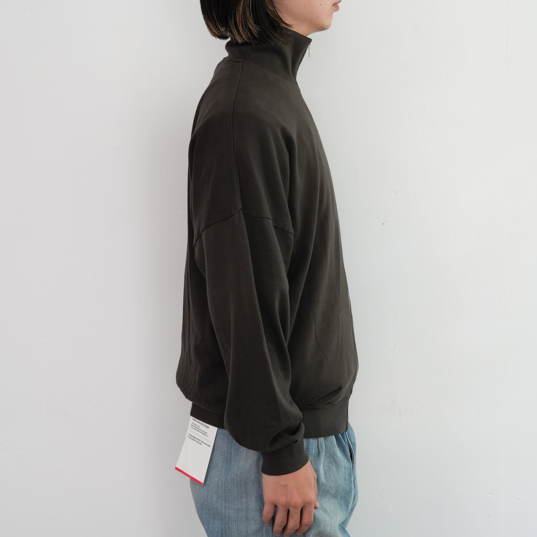 表糸に超長綿であるピマコットンを使用し、最大限の膨らみを持たせるために綿の状態で加工してから紡績し、ハイゲージ機械で編み上げたスウェット素材を使用しています。加工過程で毛羽を溶かす処理を施し、綺麗な落ち感と滑らかで柔らかな風合いに仕上がっています。軽やかでありながらも豊かな膨らみと、上質な触感が特徴です。