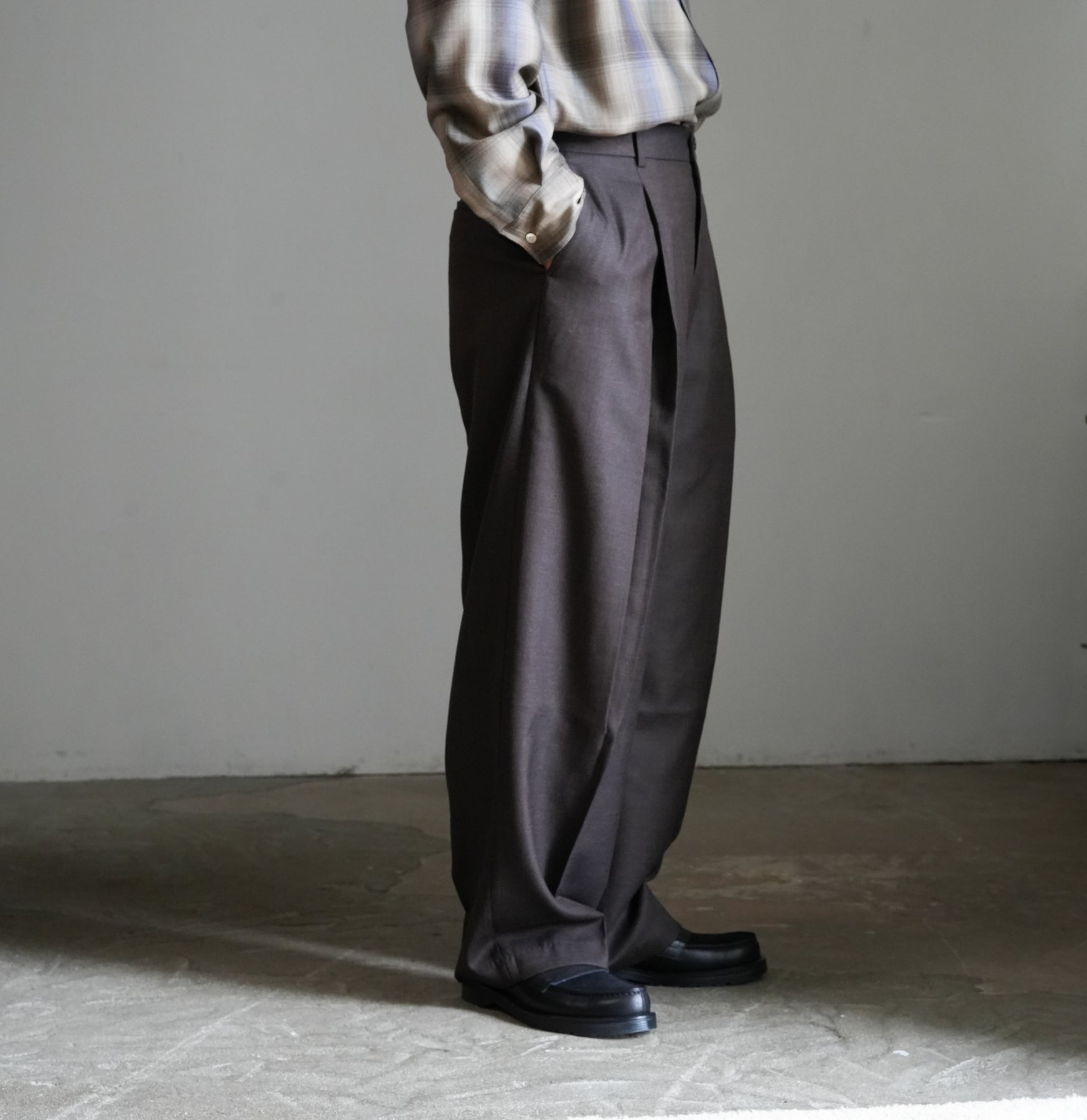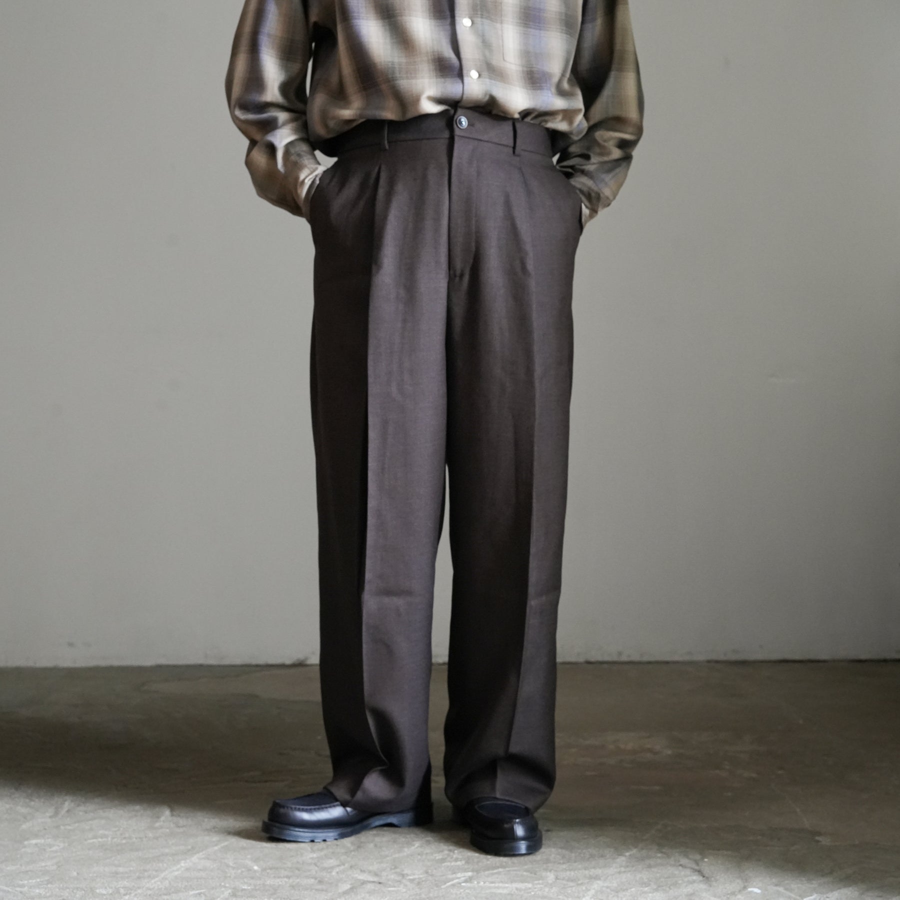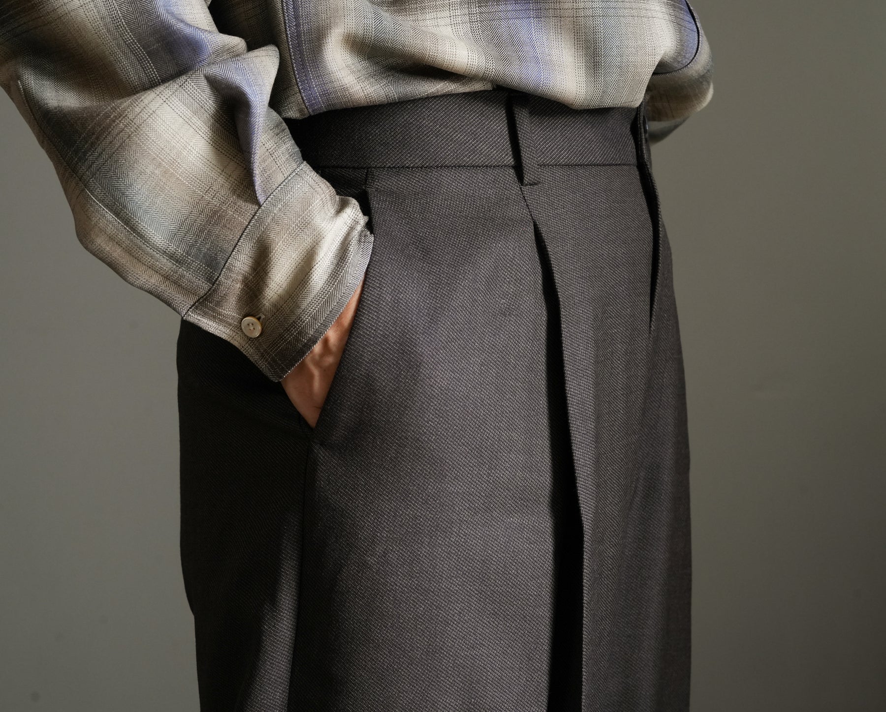 程よい懐かしさのあるクラシックな生地を使用し、タックの分量を大きく緩やかに取った1タック仕様。生地の落ち感、ドレープを生かしたシルエットです。