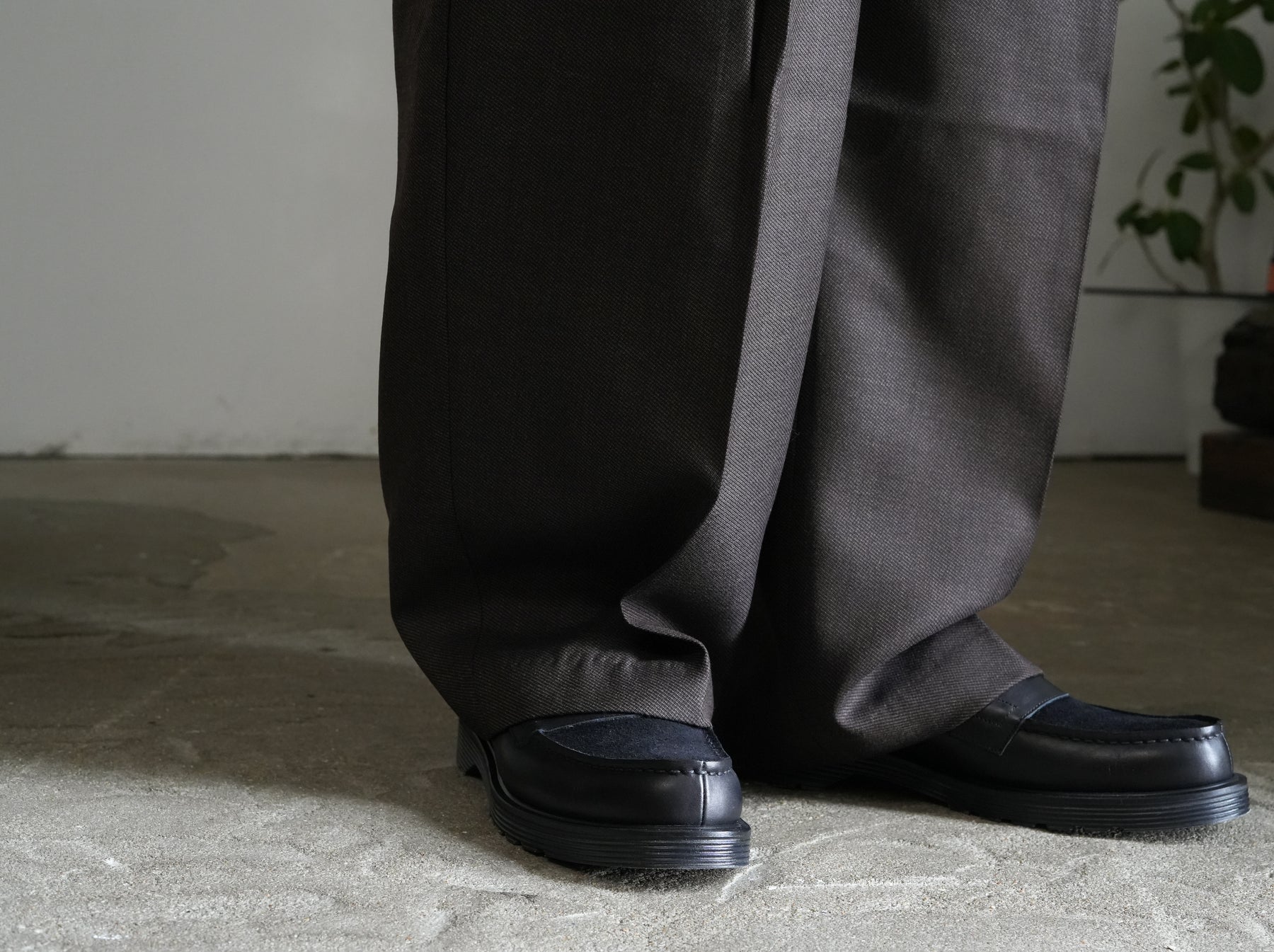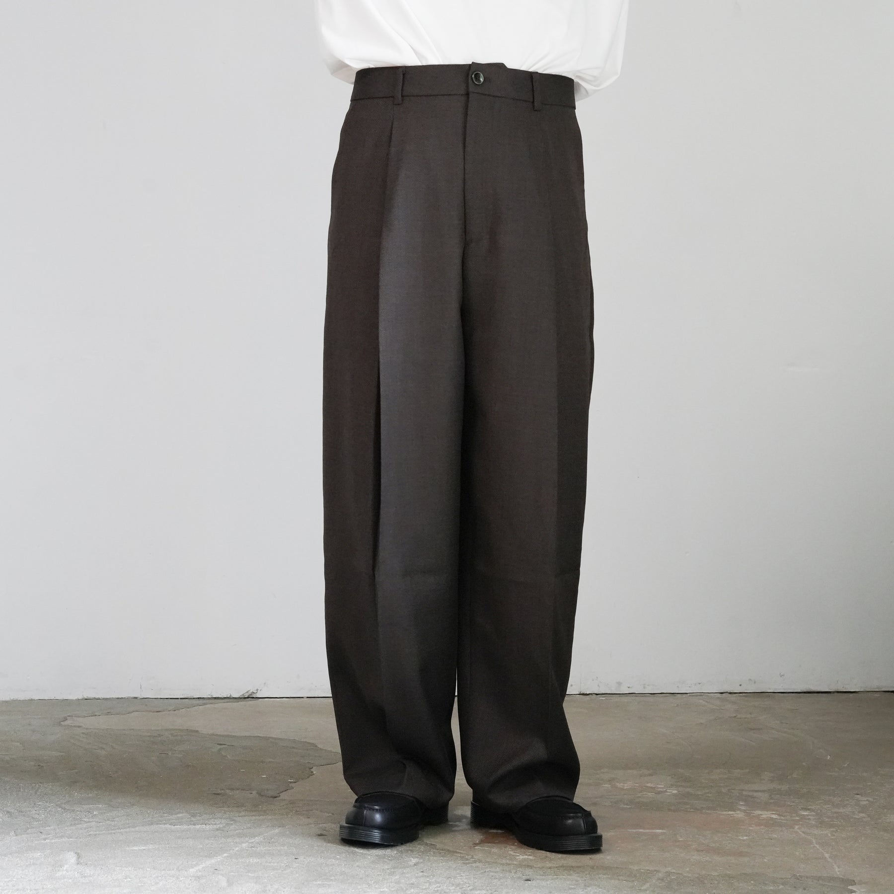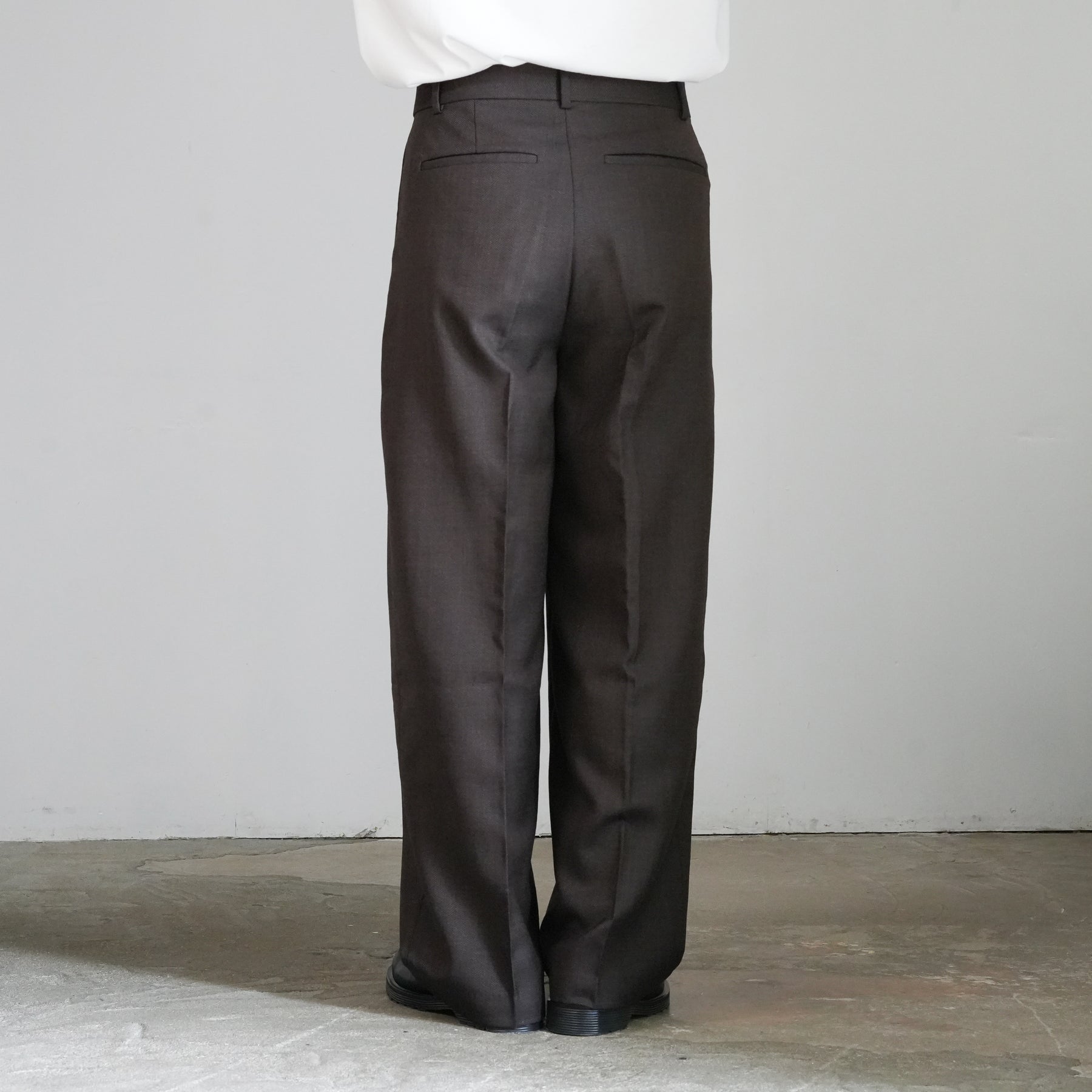 程よい懐かしさのあるクラシックな生地を使用し、タックの分量を大きく緩やかに取った1タック仕様。生地の落ち感、ドレープを生かしたシルエットです。