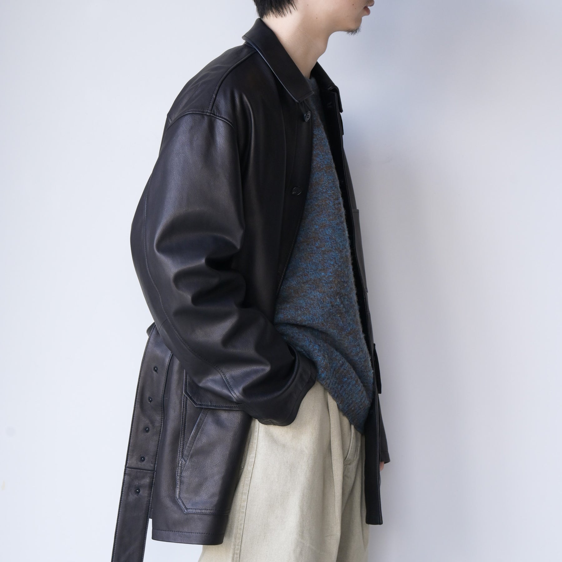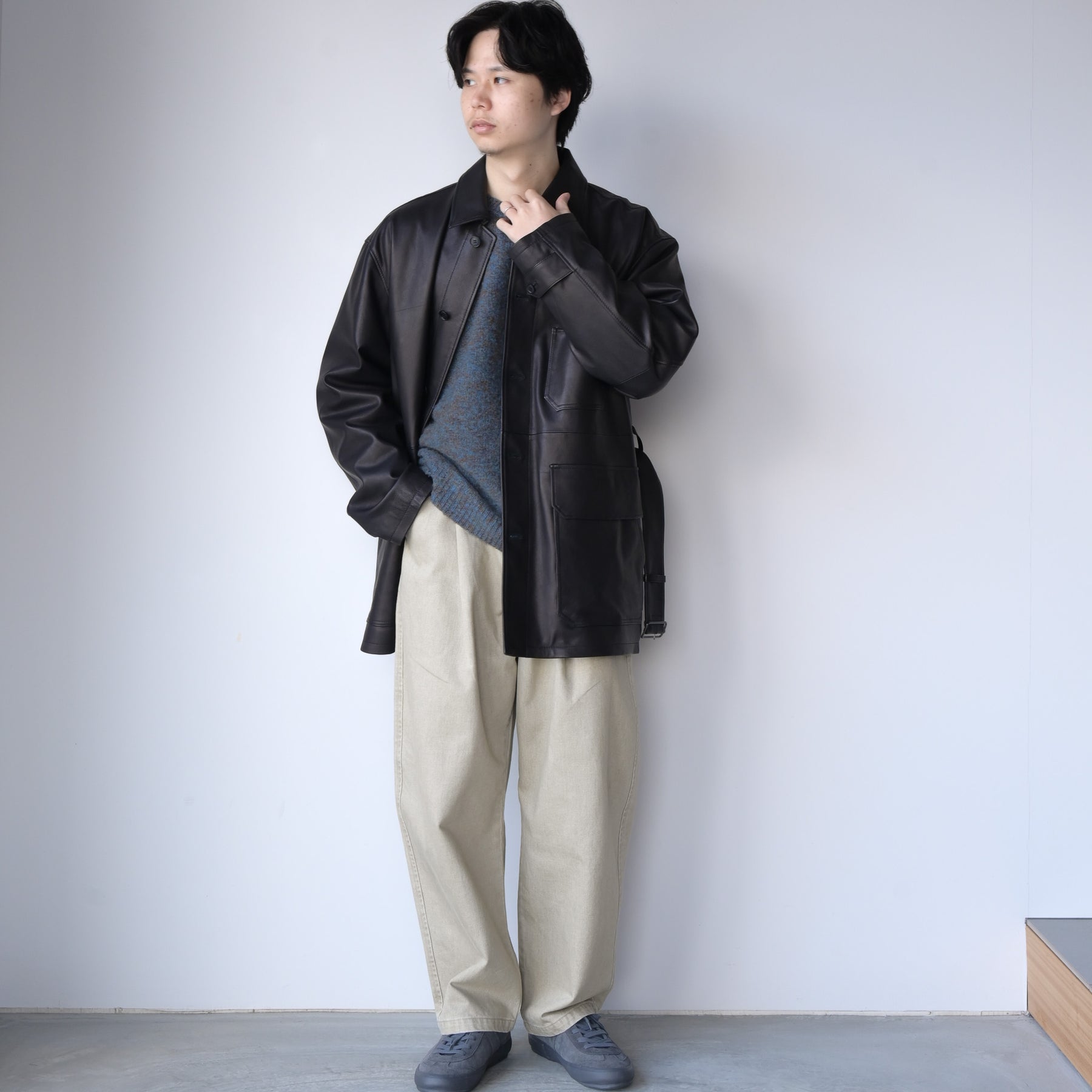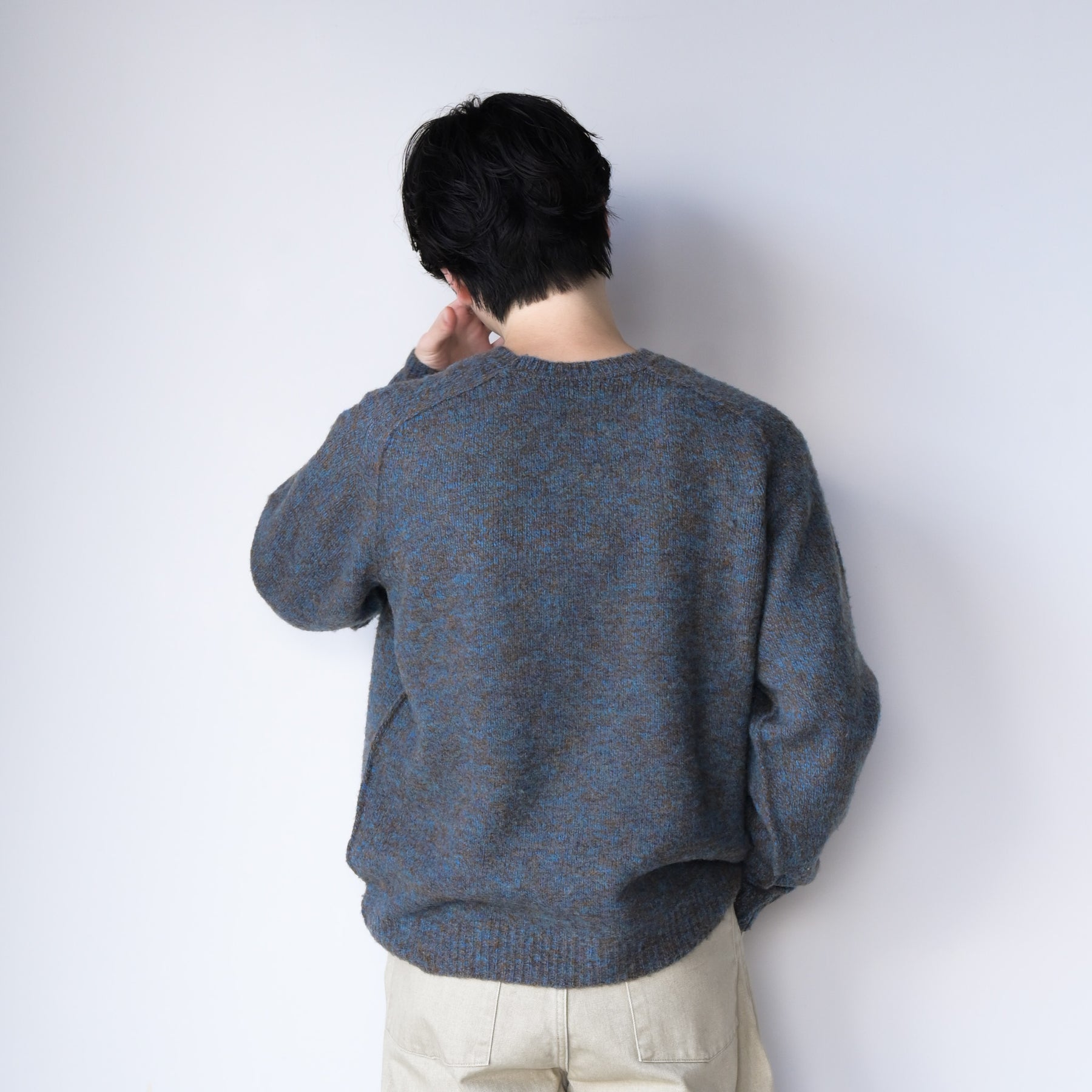 この素材はシェットランドウールに品質が近い、イタリアの南部地域で放牧されている羊を使った、バルキーなバージンウールです。英国風でありながらイタリアらしい風合いの素材を更に起毛加工をしました。全てTOP染めの個性的なメランジです。サドルショルダーのプルオーバー使用で微配色の重ね接ぎリンキングがポイントです。