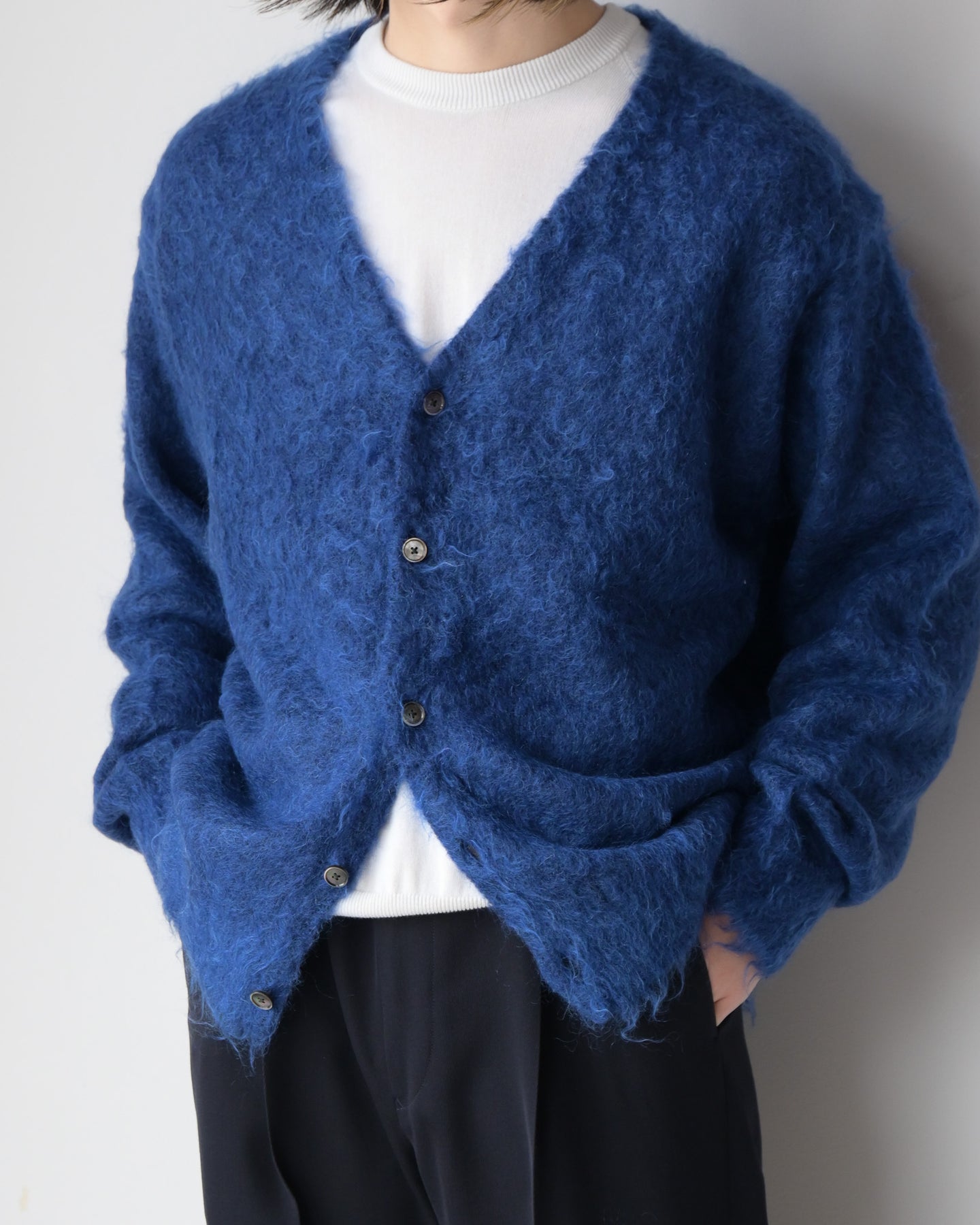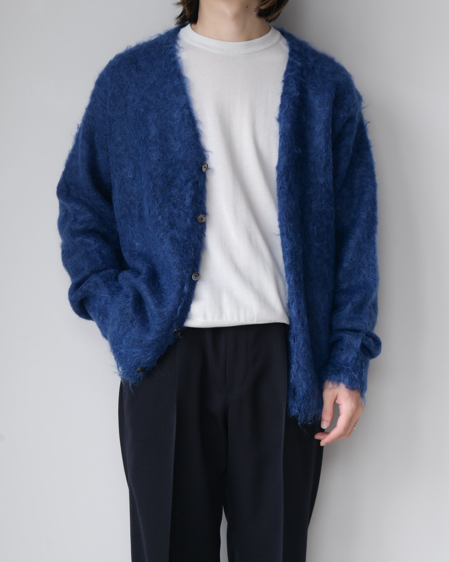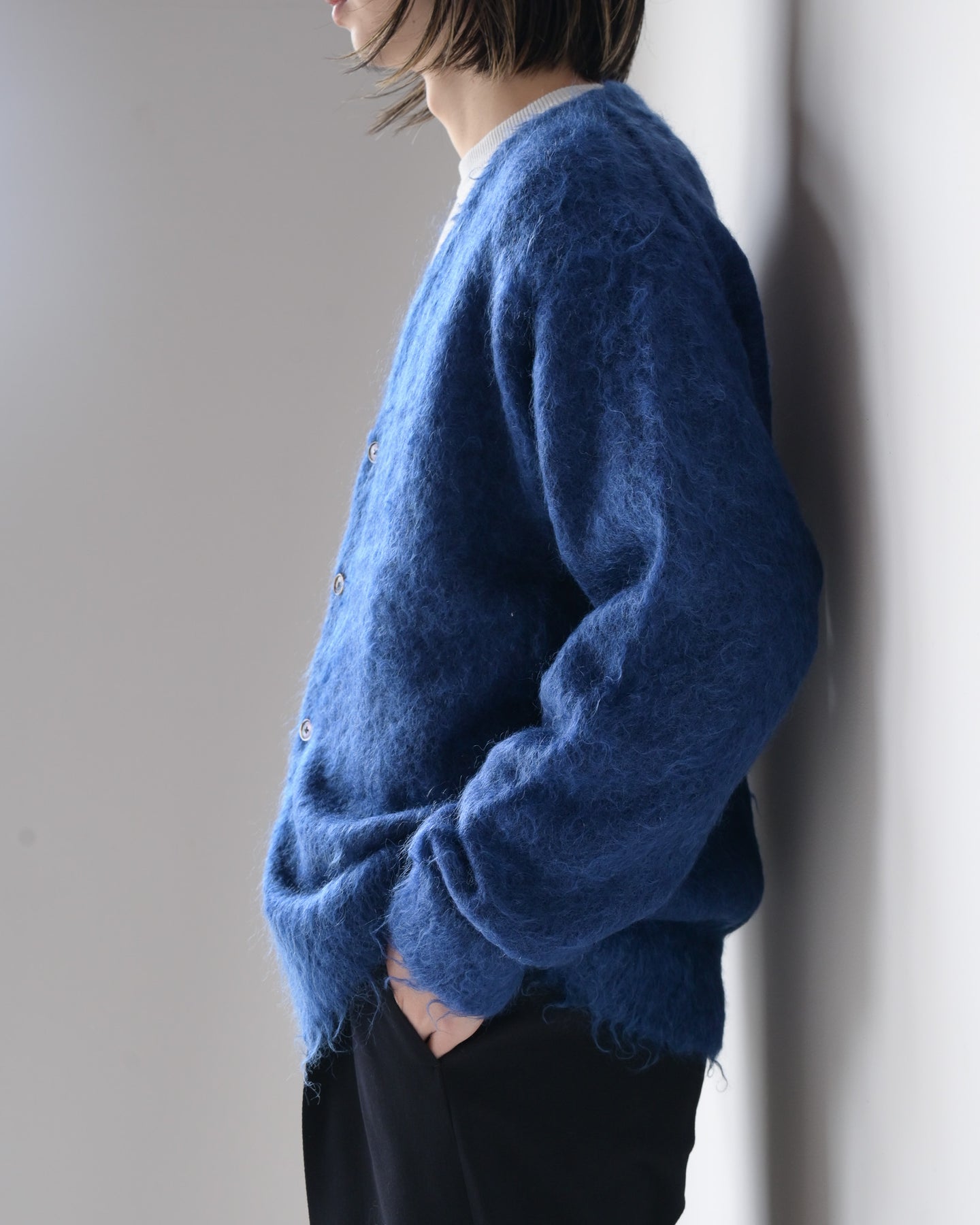 毛足を持たせたキッドモヘアは、ウールに比べ滑らかでやわらかい質感と光沢があり、適度なコシとボリューム感を持ちあわせ、空気を多く含むため暖かさがあります。やや縦長シルエットが新鮮なカーディガンです。