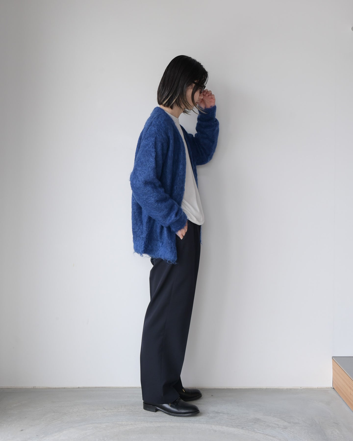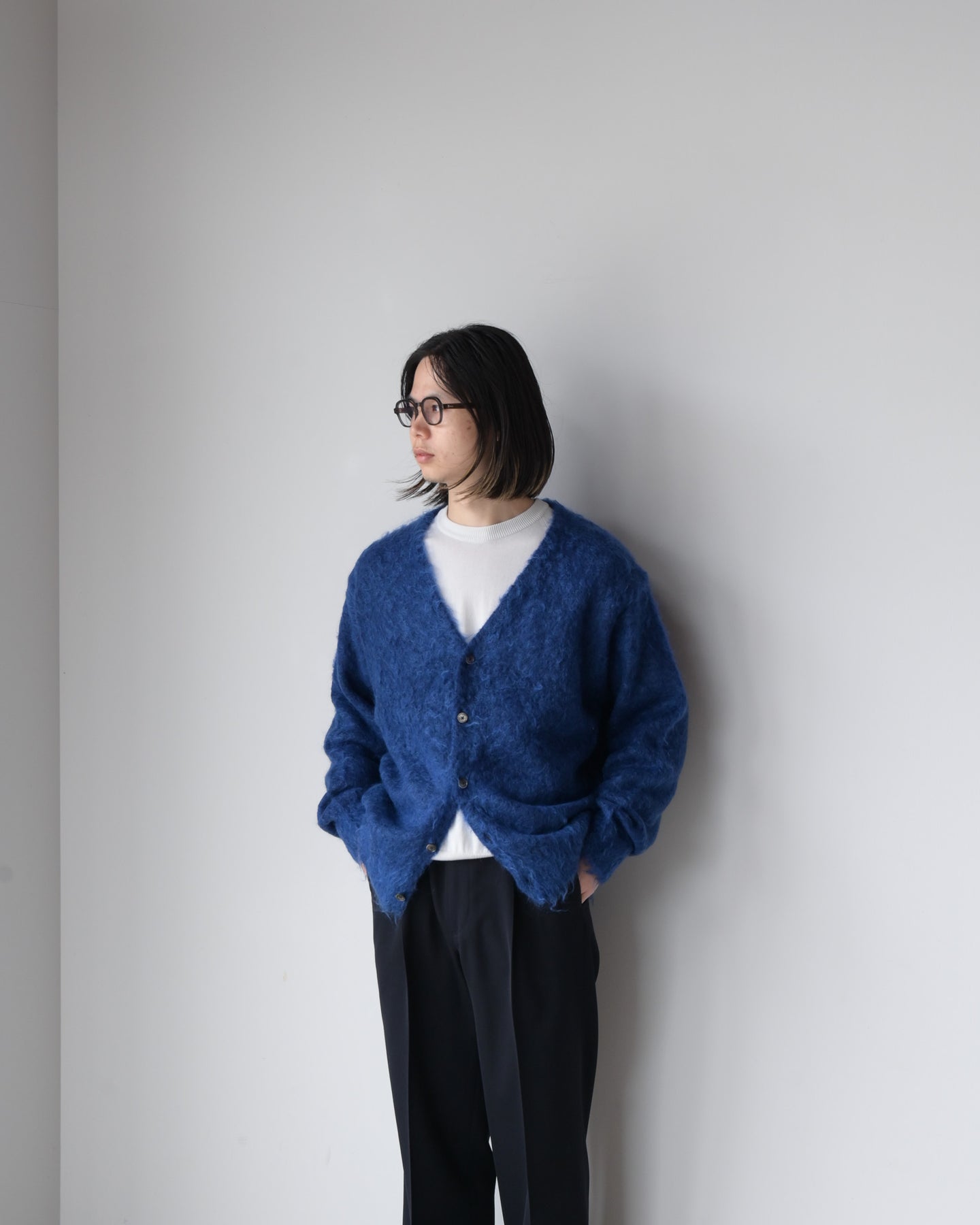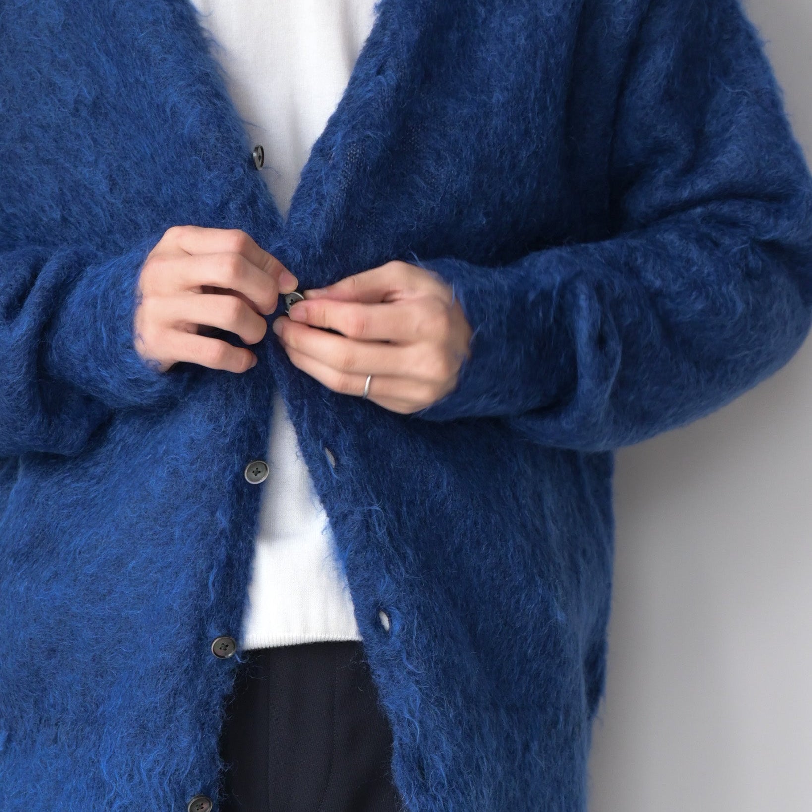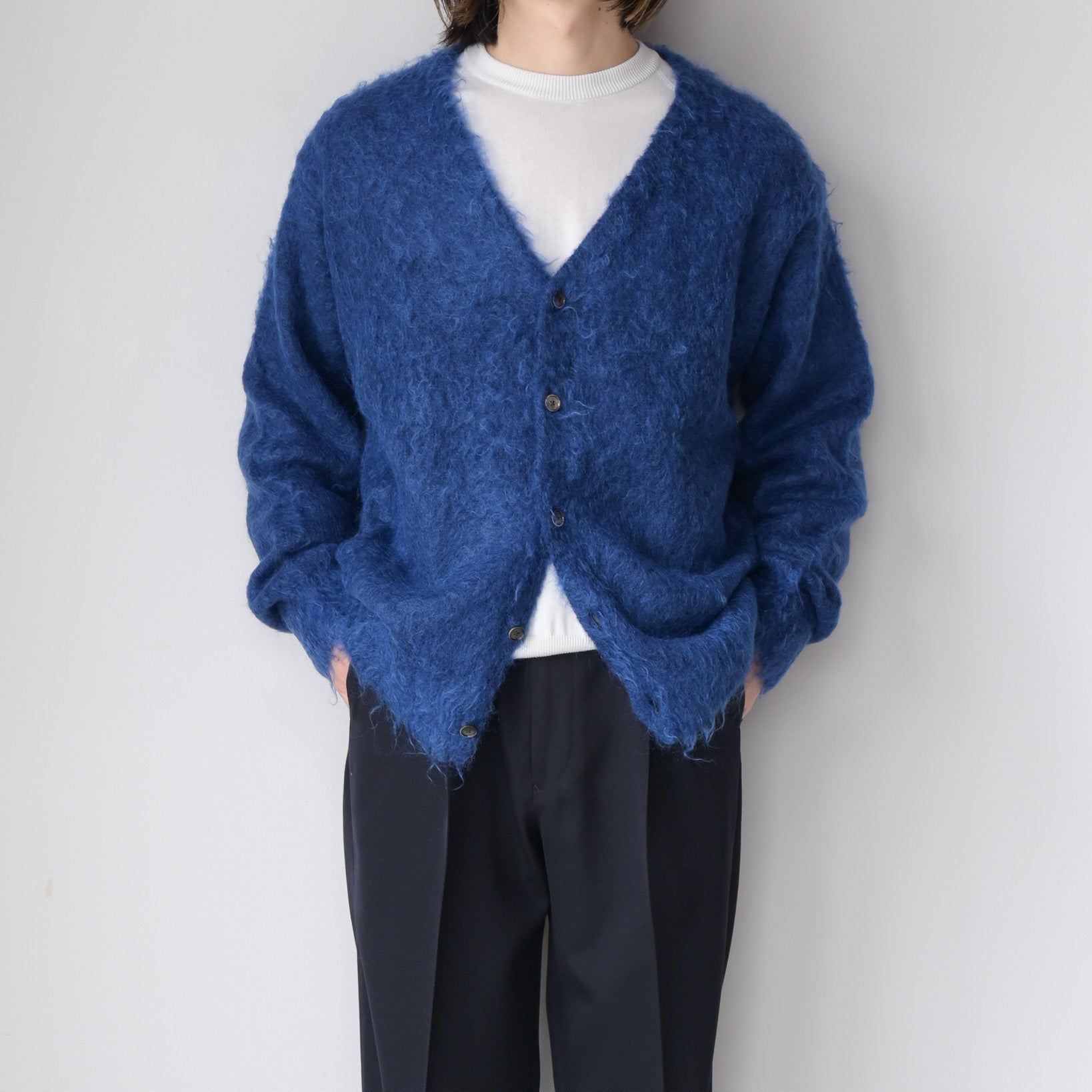 毛足を持たせたキッドモヘアは、ウールに比べ滑らかでやわらかい質感と光沢があり、適度なコシとボリューム感を持ちあわせ、空気を多く含むため暖かさがあります。やや縦長シルエットが新鮮なカーディガンです。