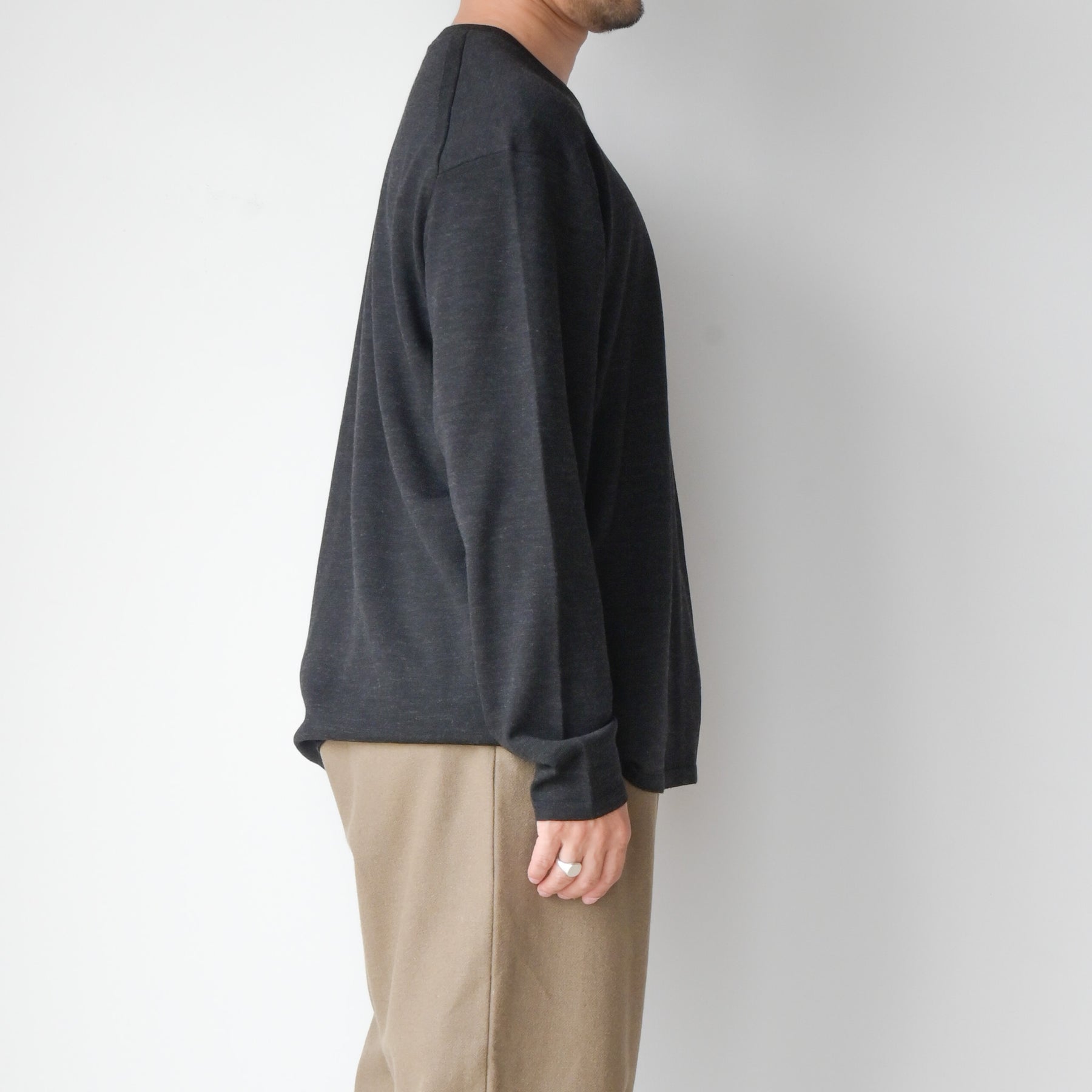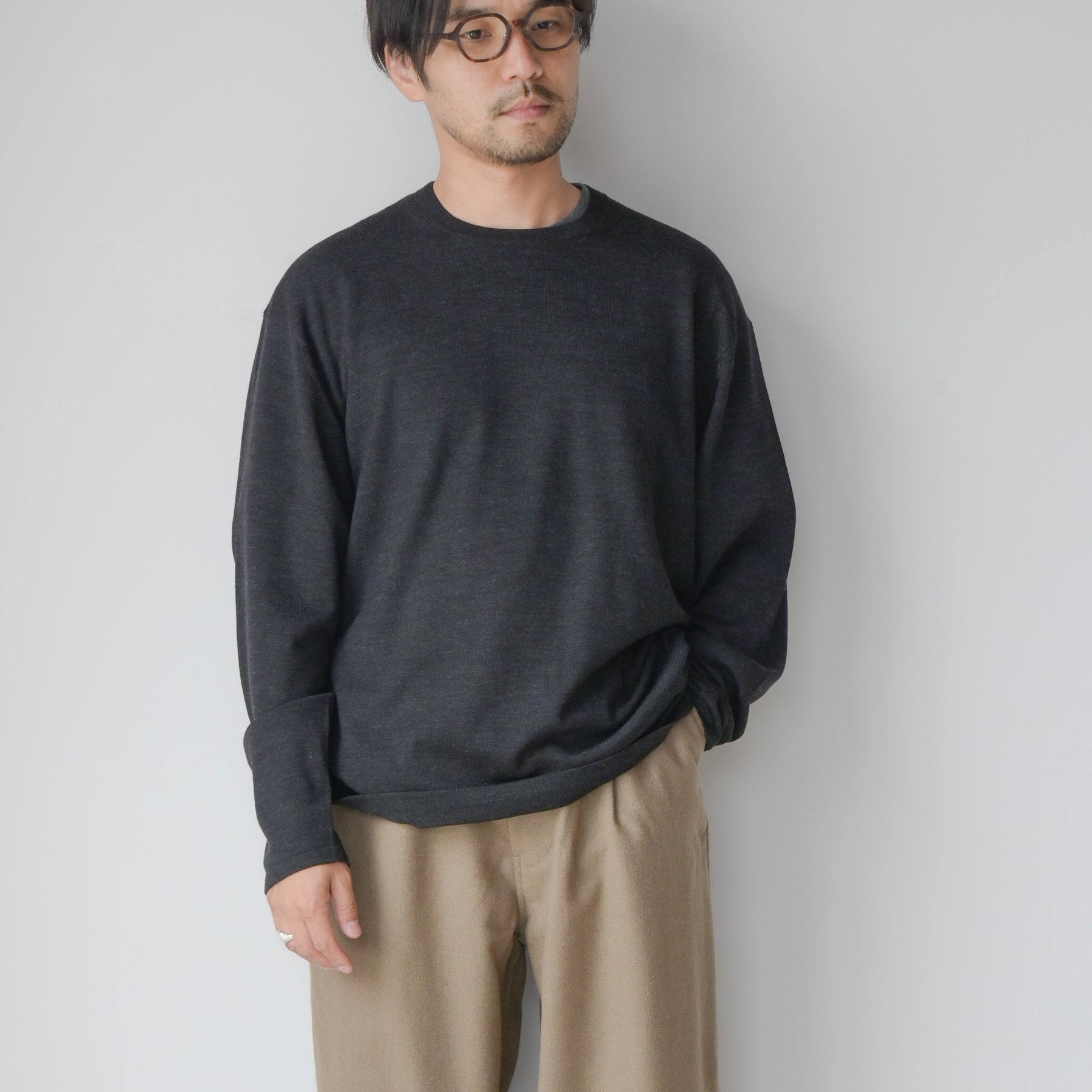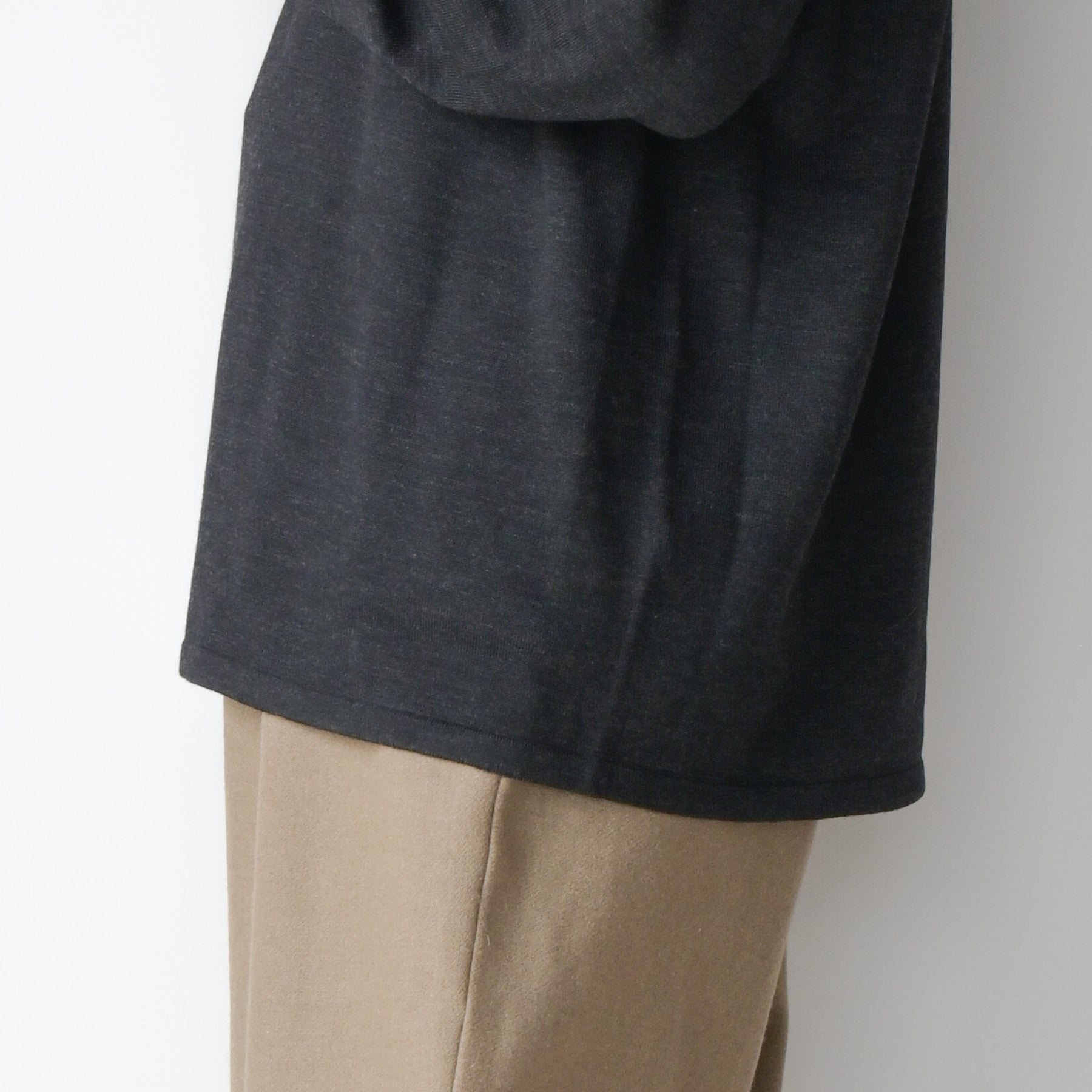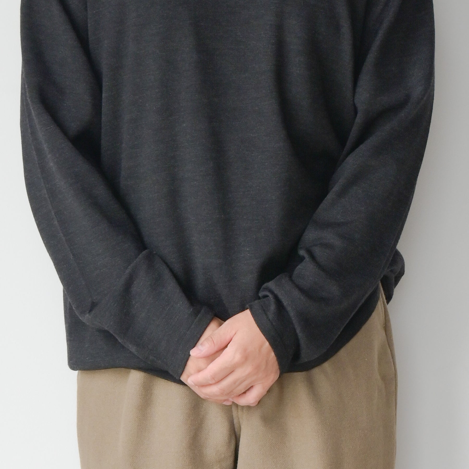 SUPER120'Sウールを使用し、軽さとしなやかな風合いを併せ持った素材です。ベーシックなゆったりしたPOニットはロングスリーブTシャツをモチーフに作りました。袖口をロールアップしたり、裾をインしたりして着ることが出来ます。