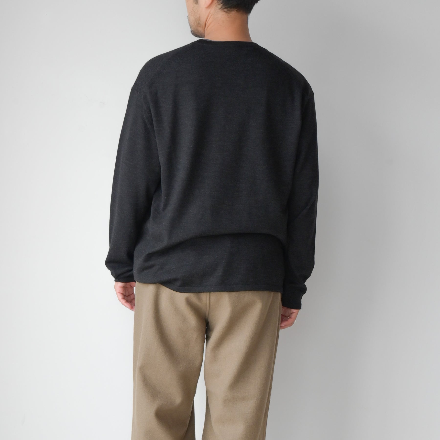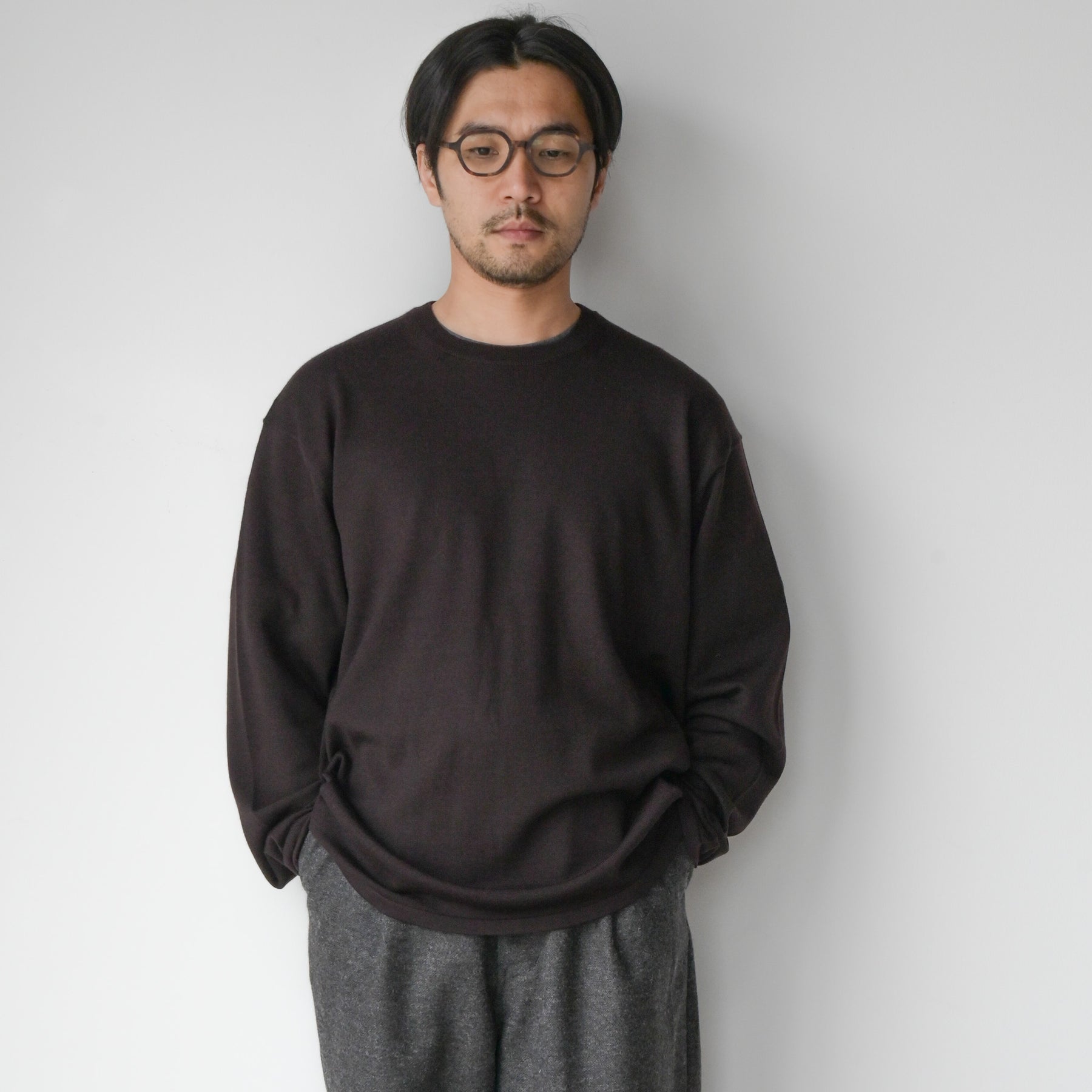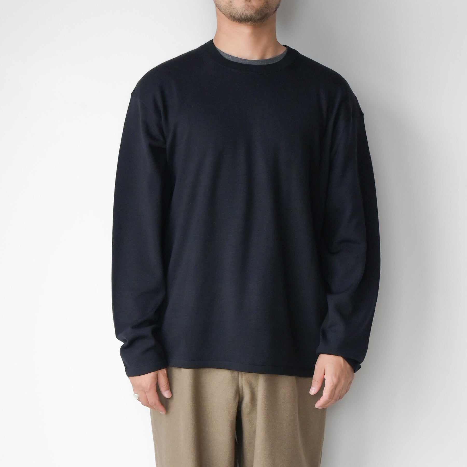 SUPER120'Sウールを使用し、軽さとしなやかな風合いを併せ持った素材です。ベーシックなゆったりしたPOニットはロングスリーブTシャツをモチーフに作りました。袖口をロールアップしたり、裾をインしたりして着ることが出来ます。