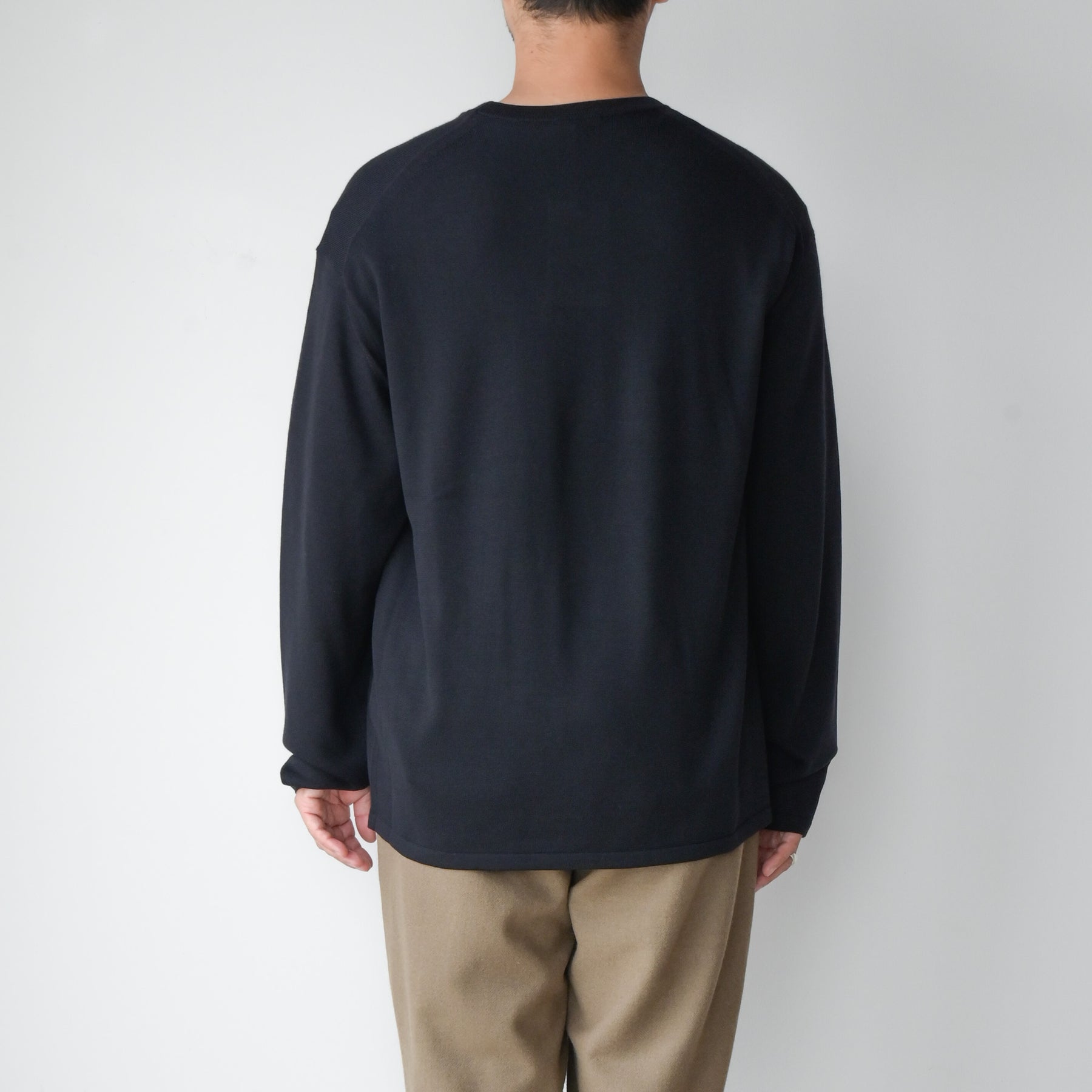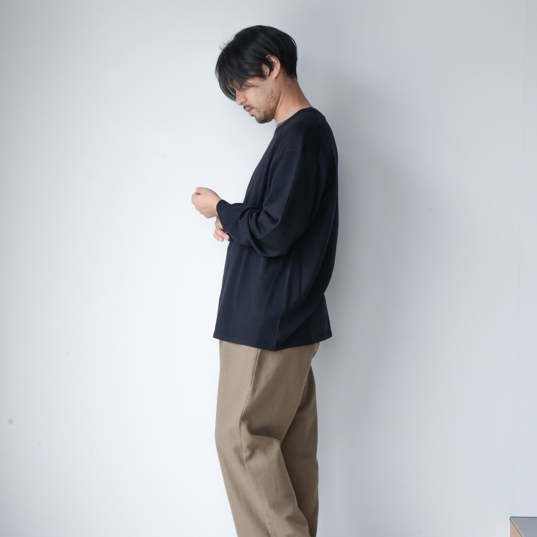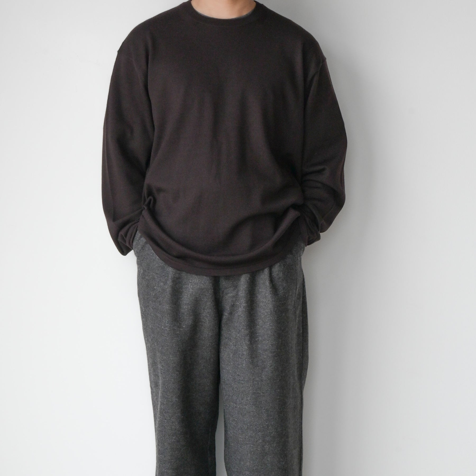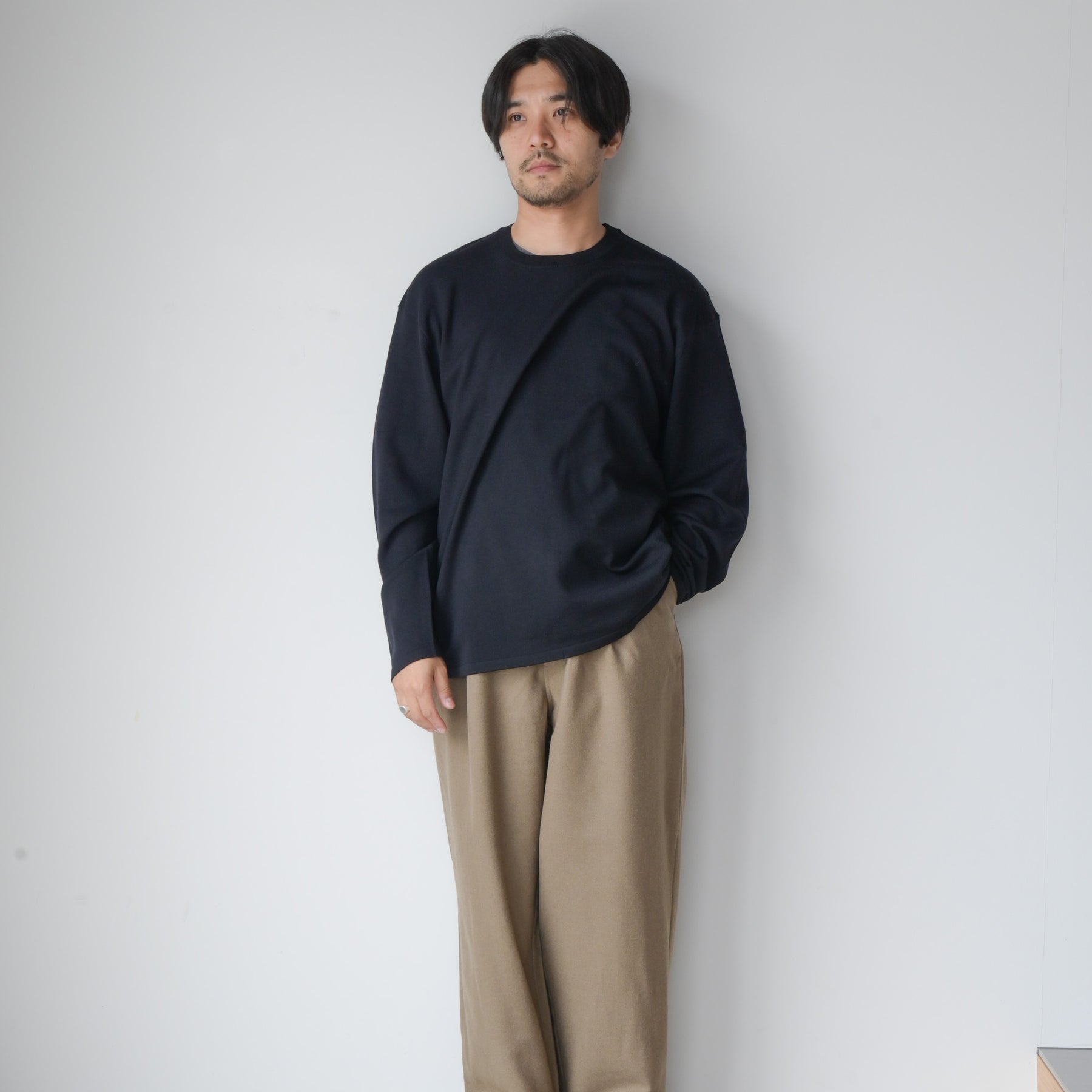 SUPER120'Sウールを使用し、軽さとしなやかな風合いを併せ持った素材です。ベーシックなゆったりしたPOニットはロングスリーブTシャツをモチーフに作りました。袖口をロールアップしたり、裾をインしたりして着ることが出来ます。