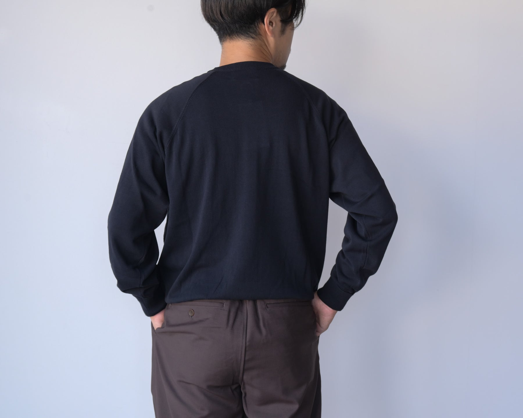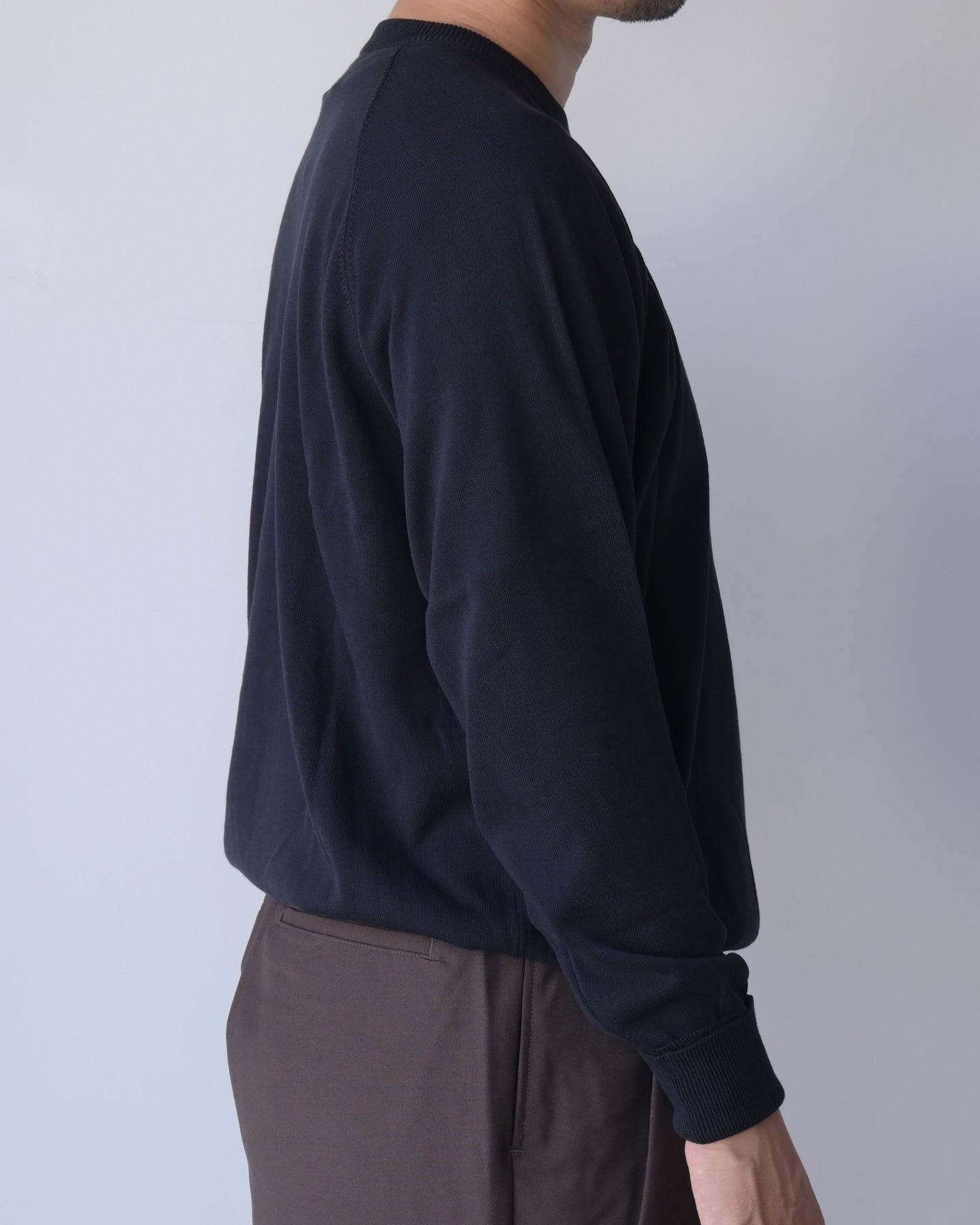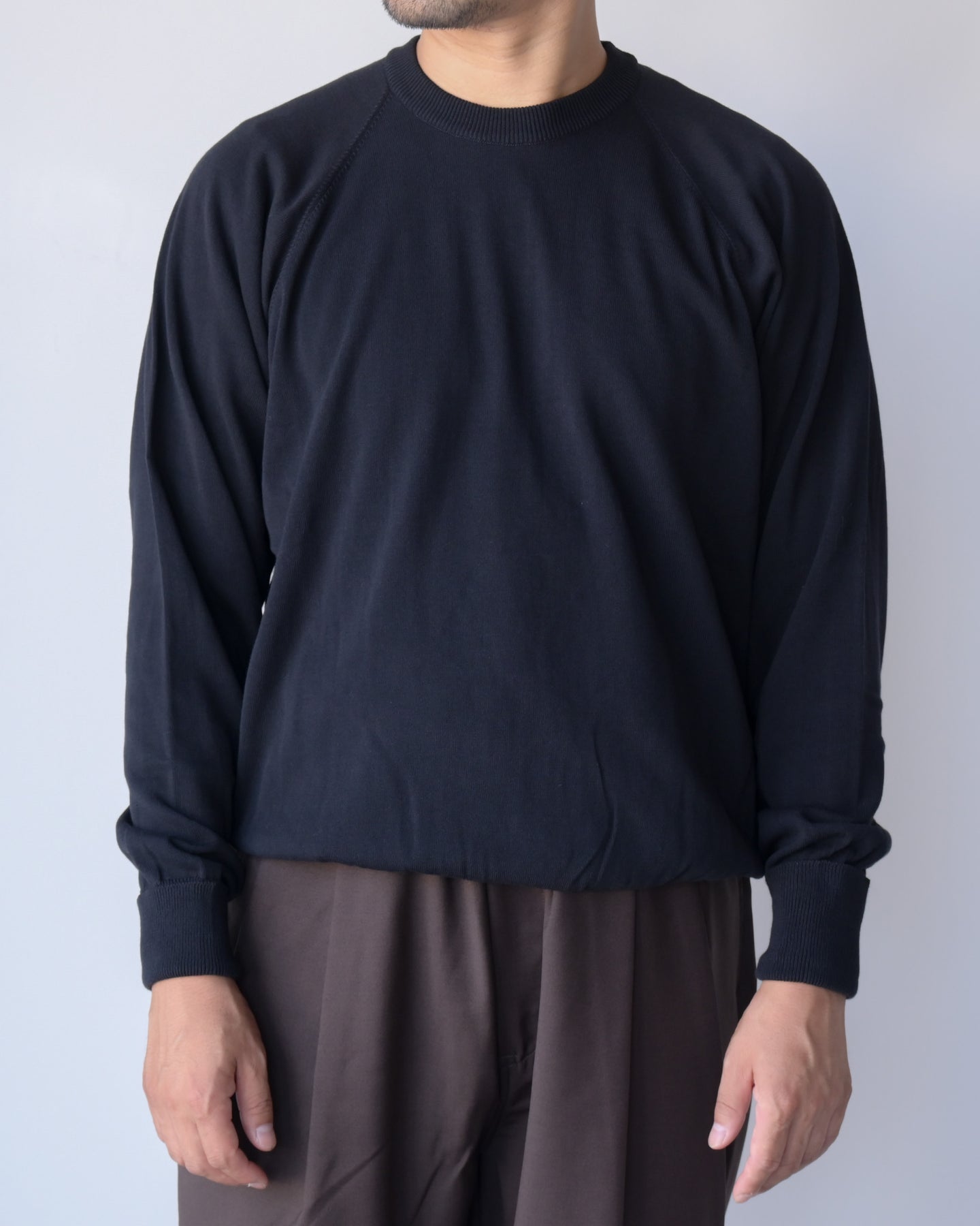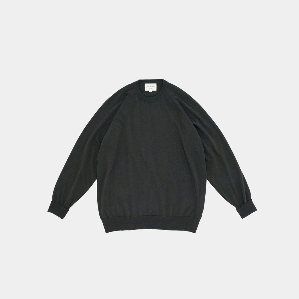 強撚コットンとシルクを撚糸したオリジナル糸で12Gラグランプルオーバーニットを作成いたしました。春にも、秋にも使えそうな肉感です。たっぷりとしたサイズ感ですが落ち感もあるので、大きく見えすぎないのがポイントです。