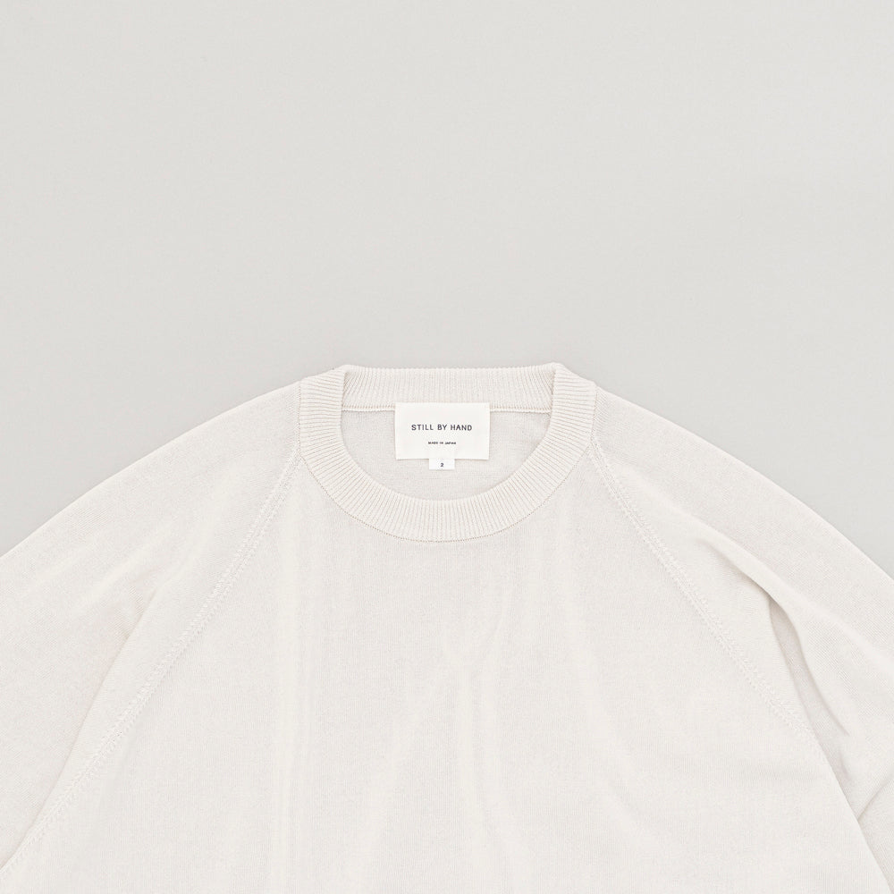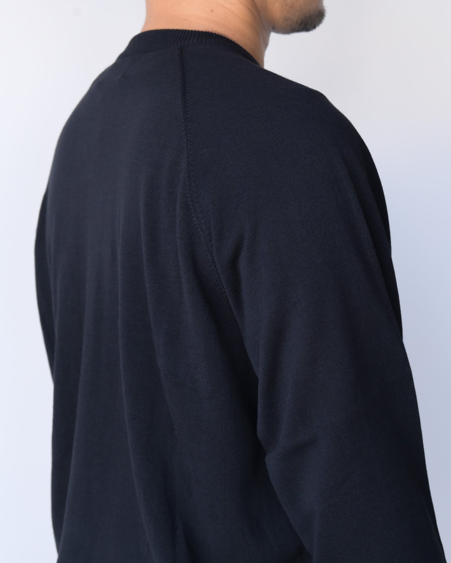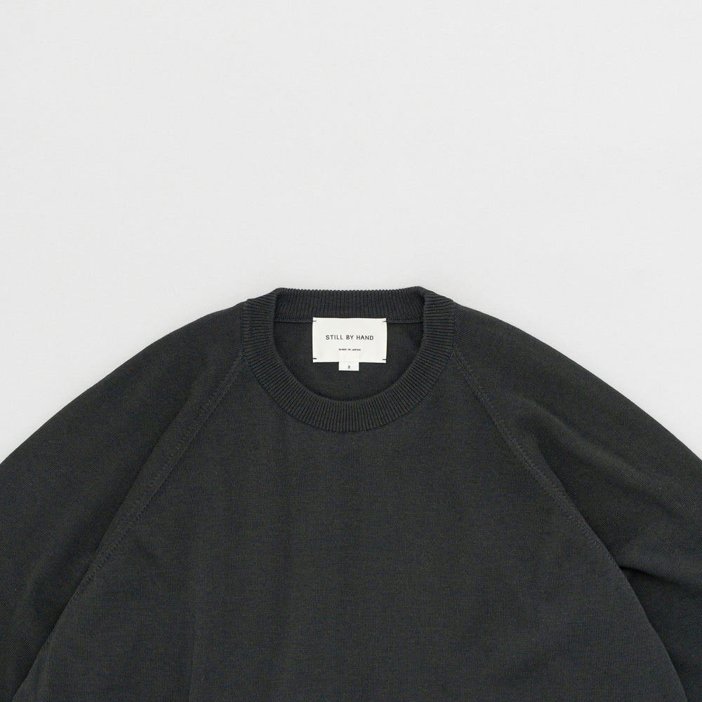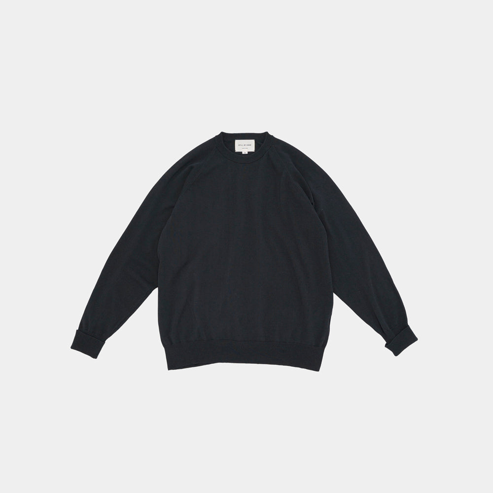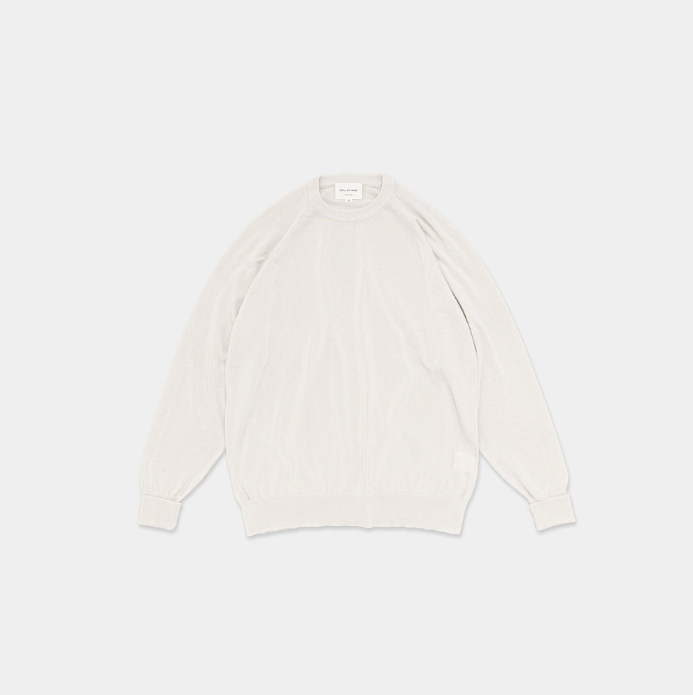 強撚コットンとシルクを撚糸したオリジナル糸で12Gラグランプルオーバーニットを作成いたしました。春にも、秋にも使えそうな肉感です。たっぷりとしたサイズ感ですが落ち感もあるので、大きく見えすぎないのがポイントです。