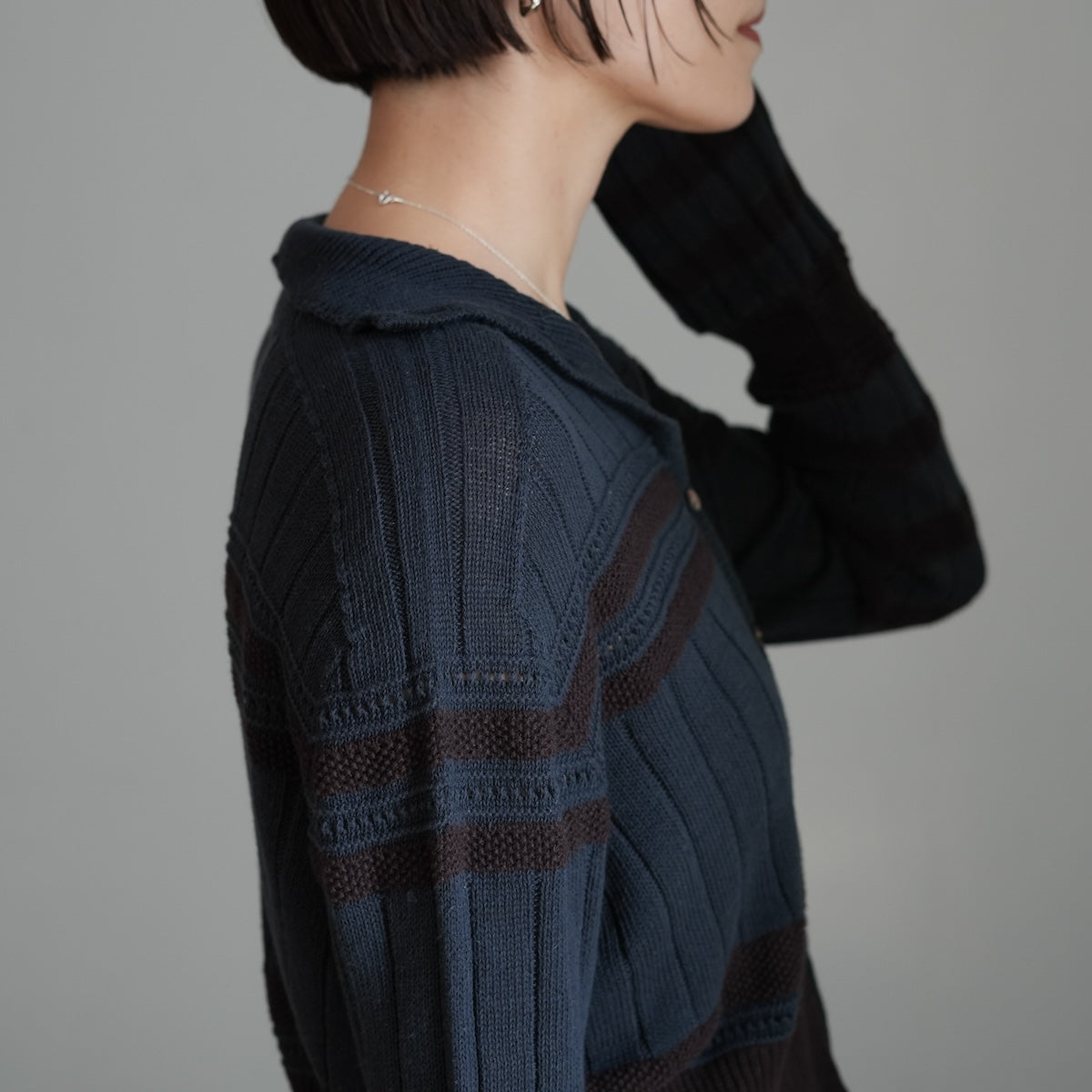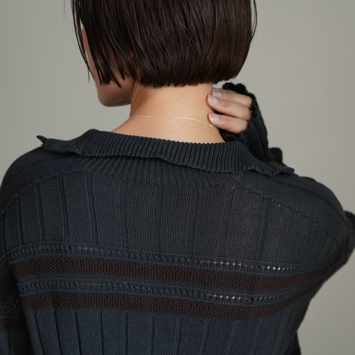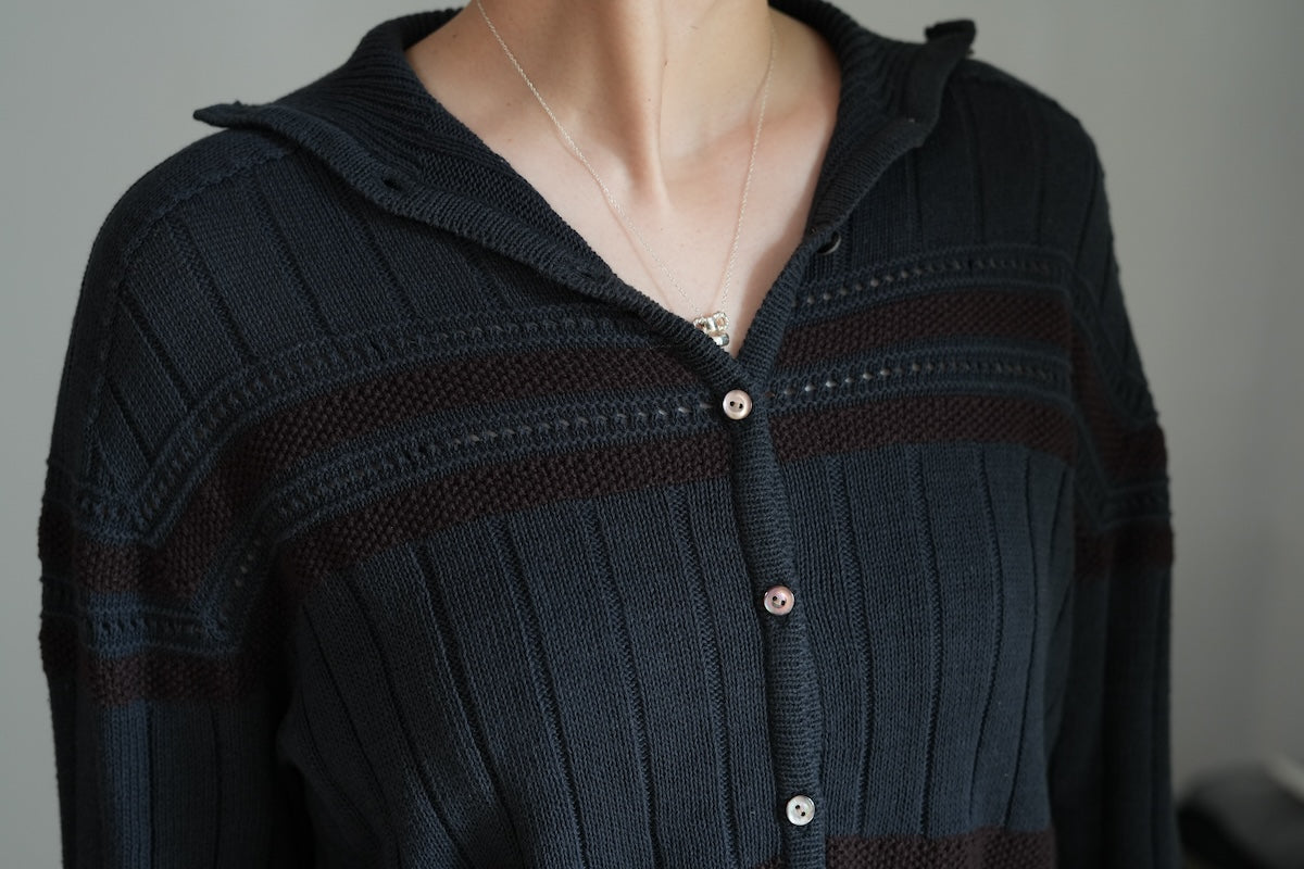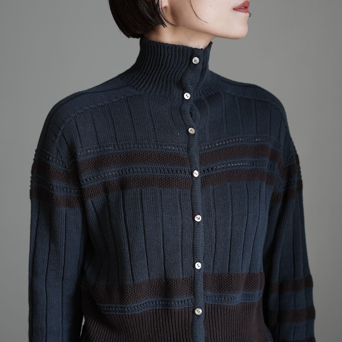 衿元はポロやタートルネックにしたり、カーディガンとして羽織ったり長い季節で楽しんでいただけます。前後どちらもご着用可能です。