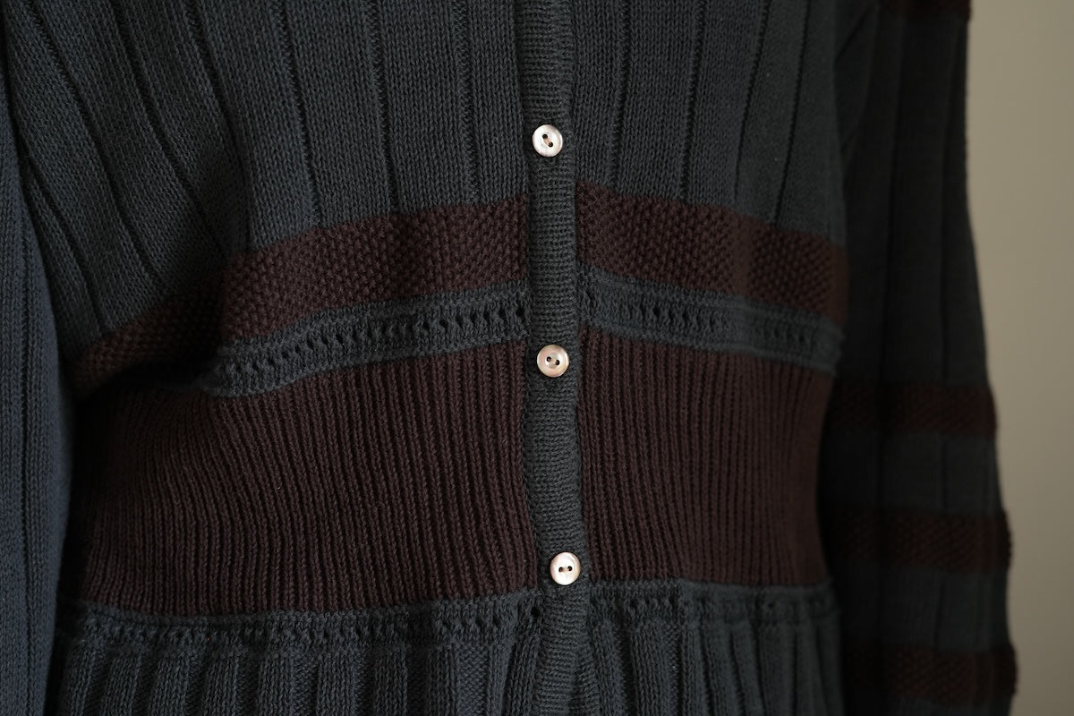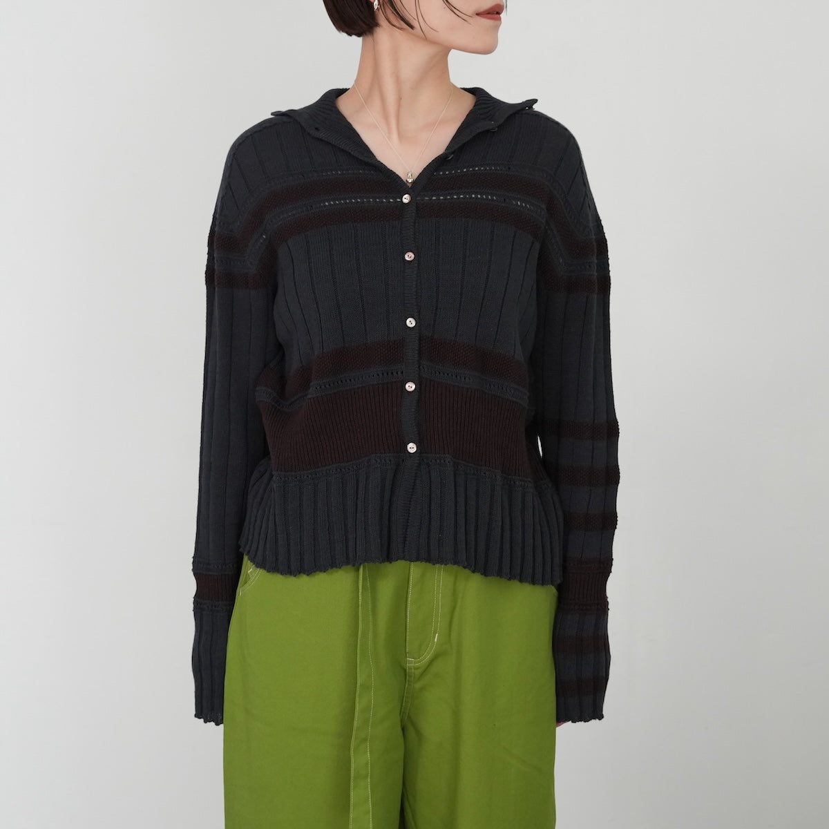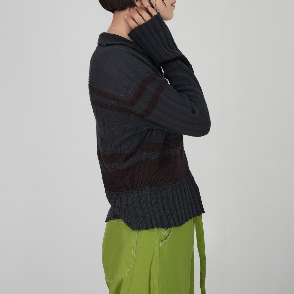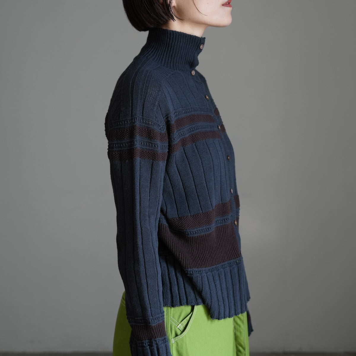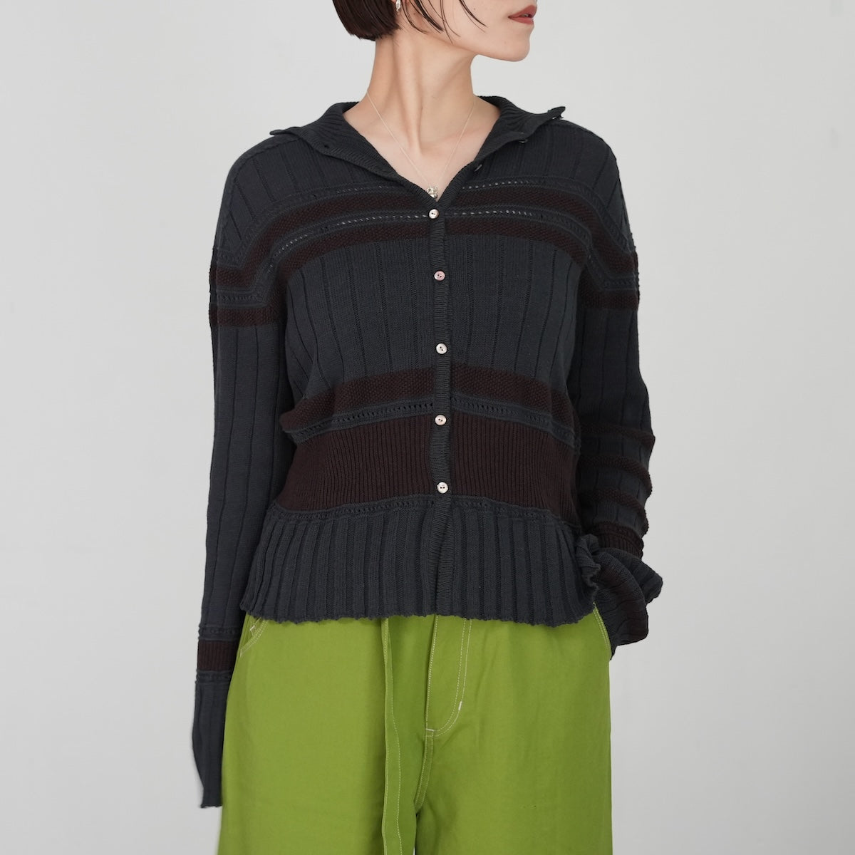 衿元はポロやタートルネックにしたり、カーディガンとして羽織ったり長い季節で楽しんでいただけます。前後どちらもご着用可能です。