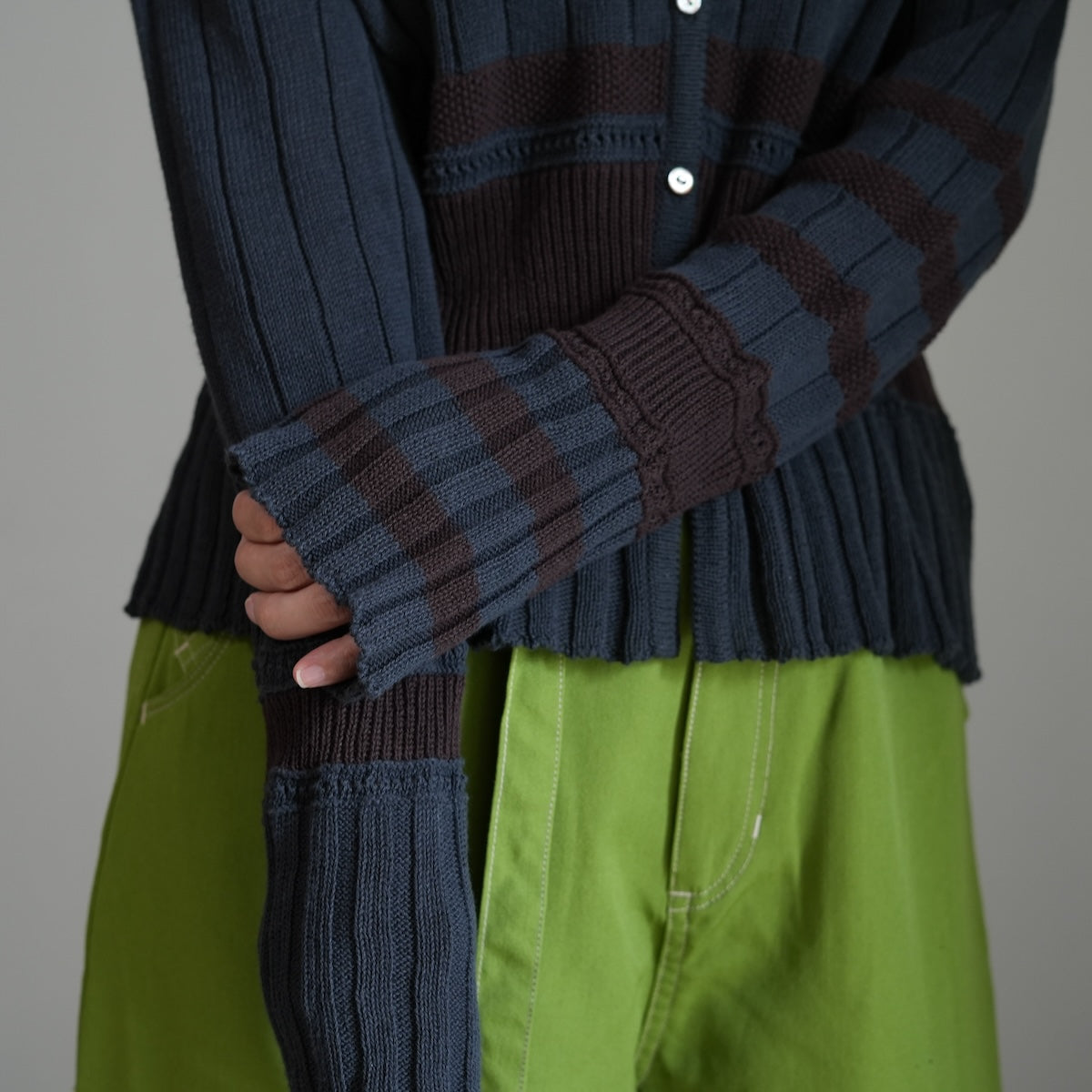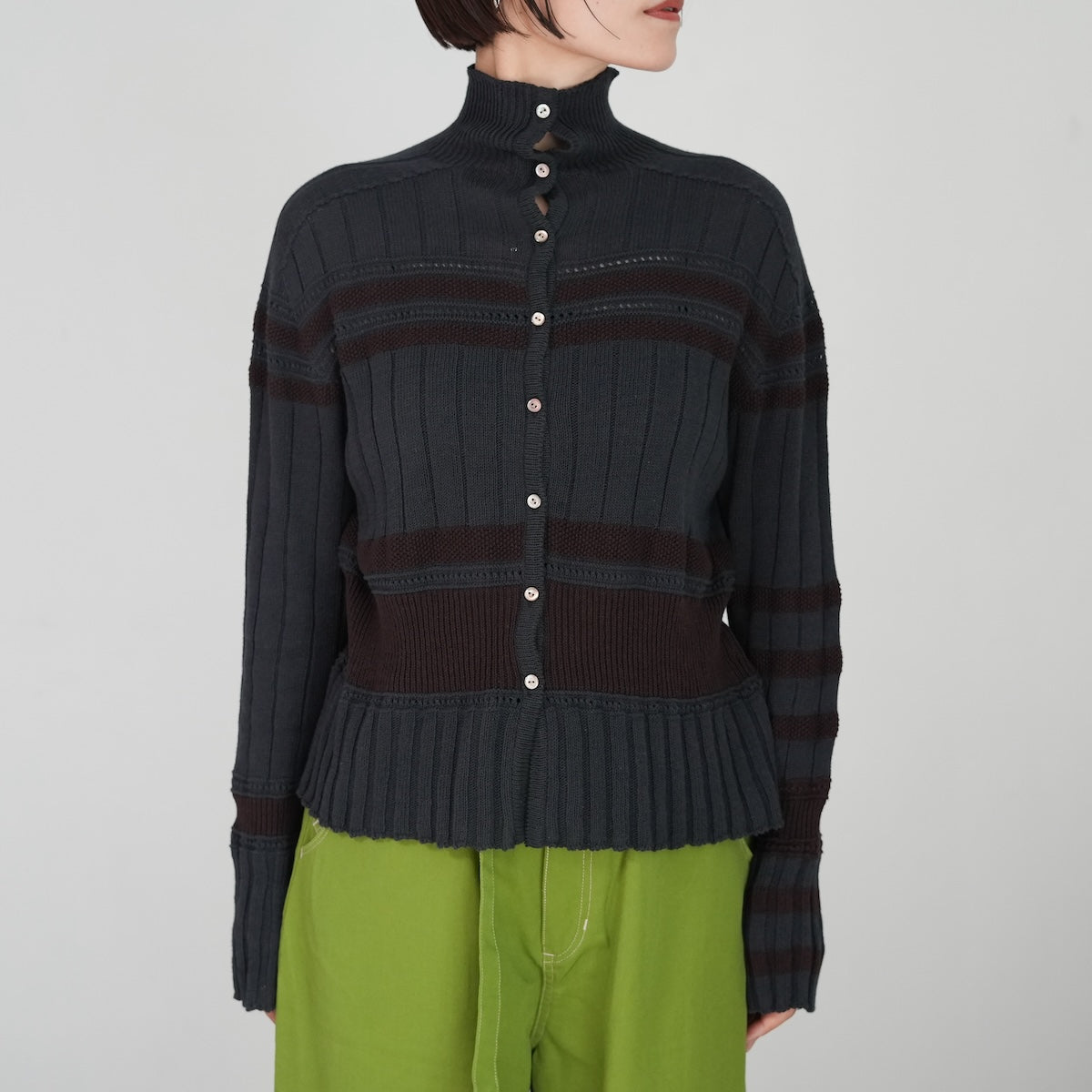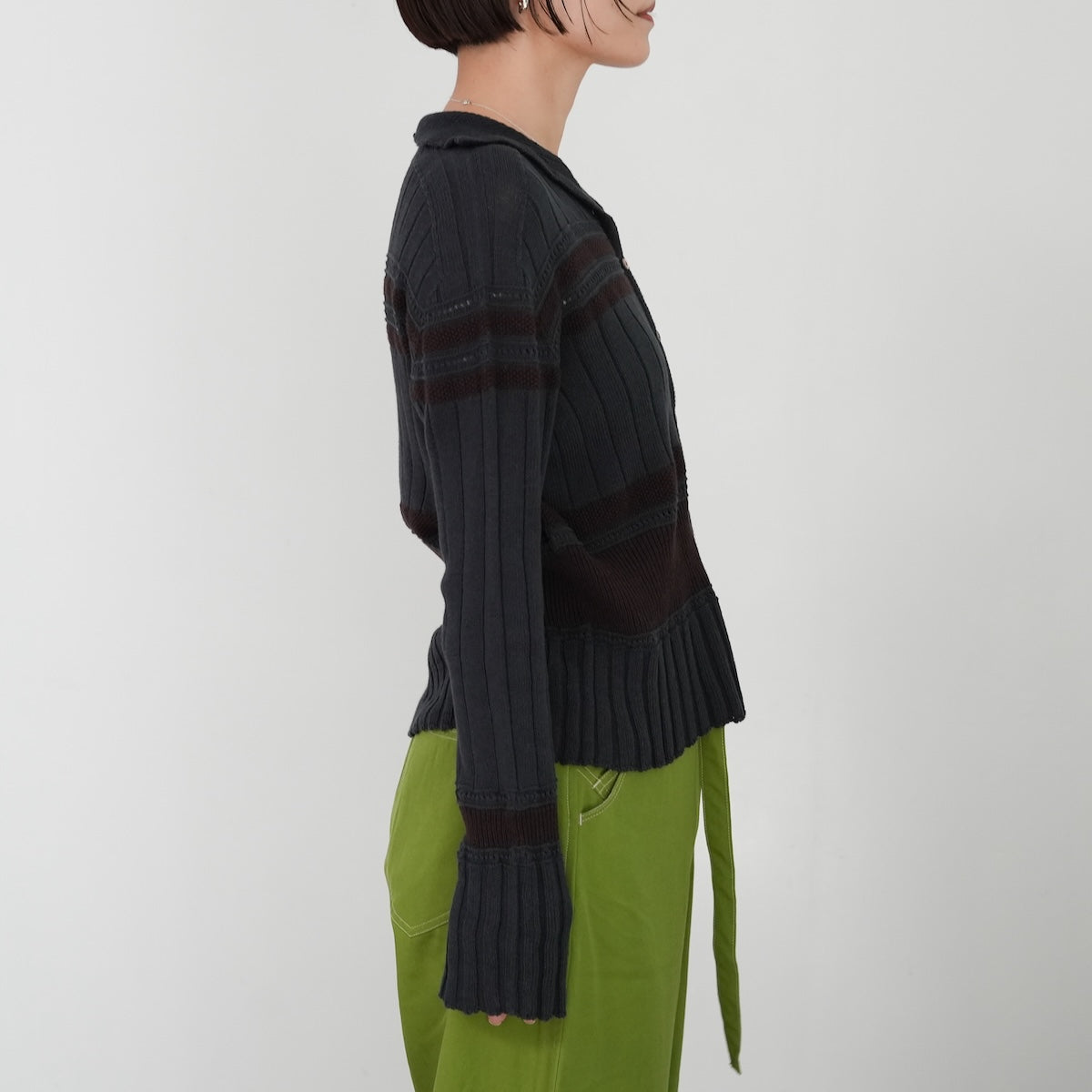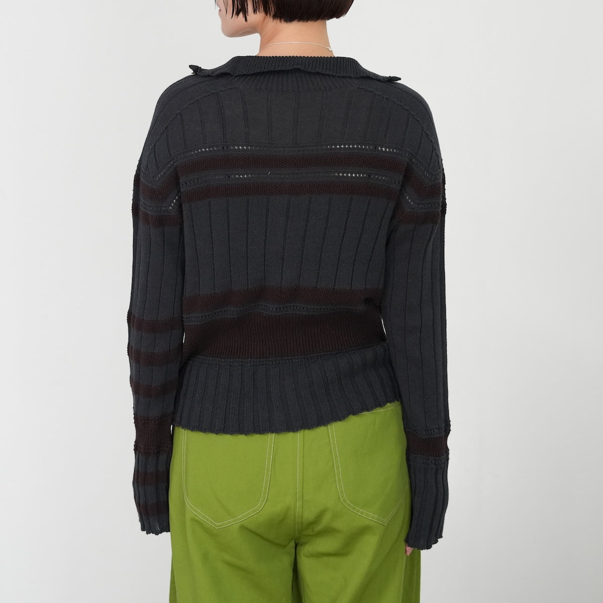 衿元はポロやタートルネックにしたり、カーディガンとして羽織ったり長い季節で楽しんでいただけます。前後どちらもご着用可能です。
