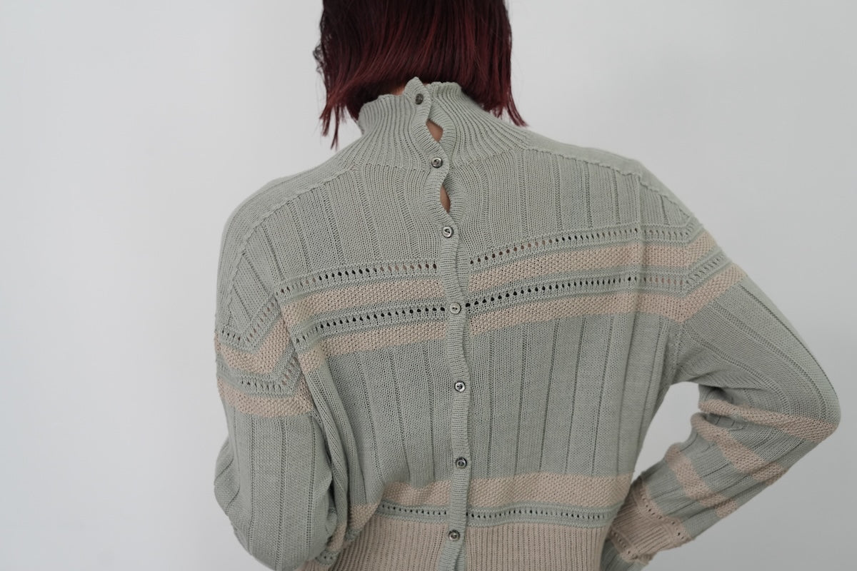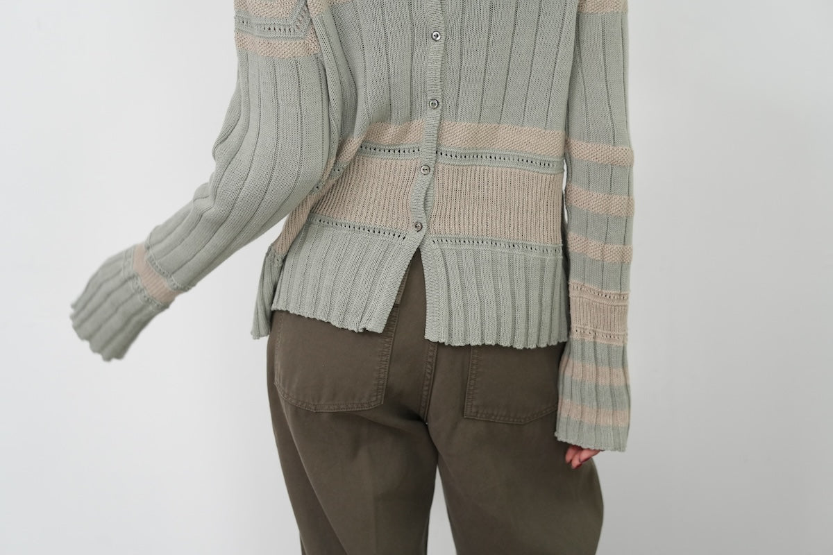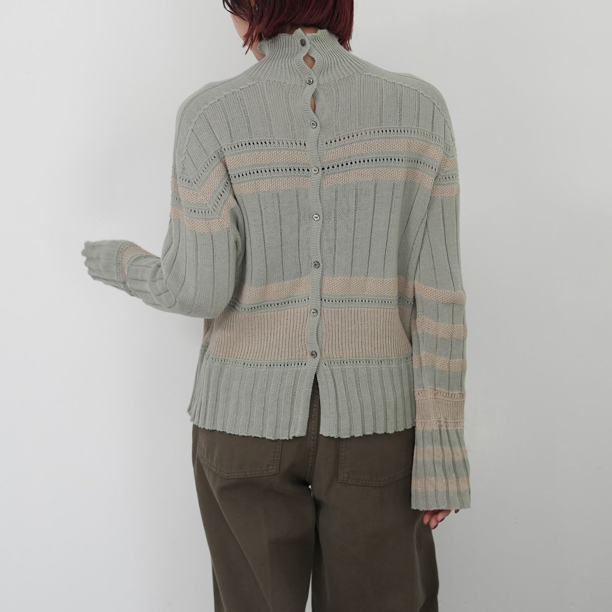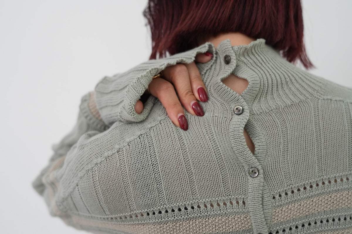 衿元はポロやタートルネックにしたり、カーディガンとして羽織ったり長い季節で楽しんでいただけます。前後どちらもご着用可能です。