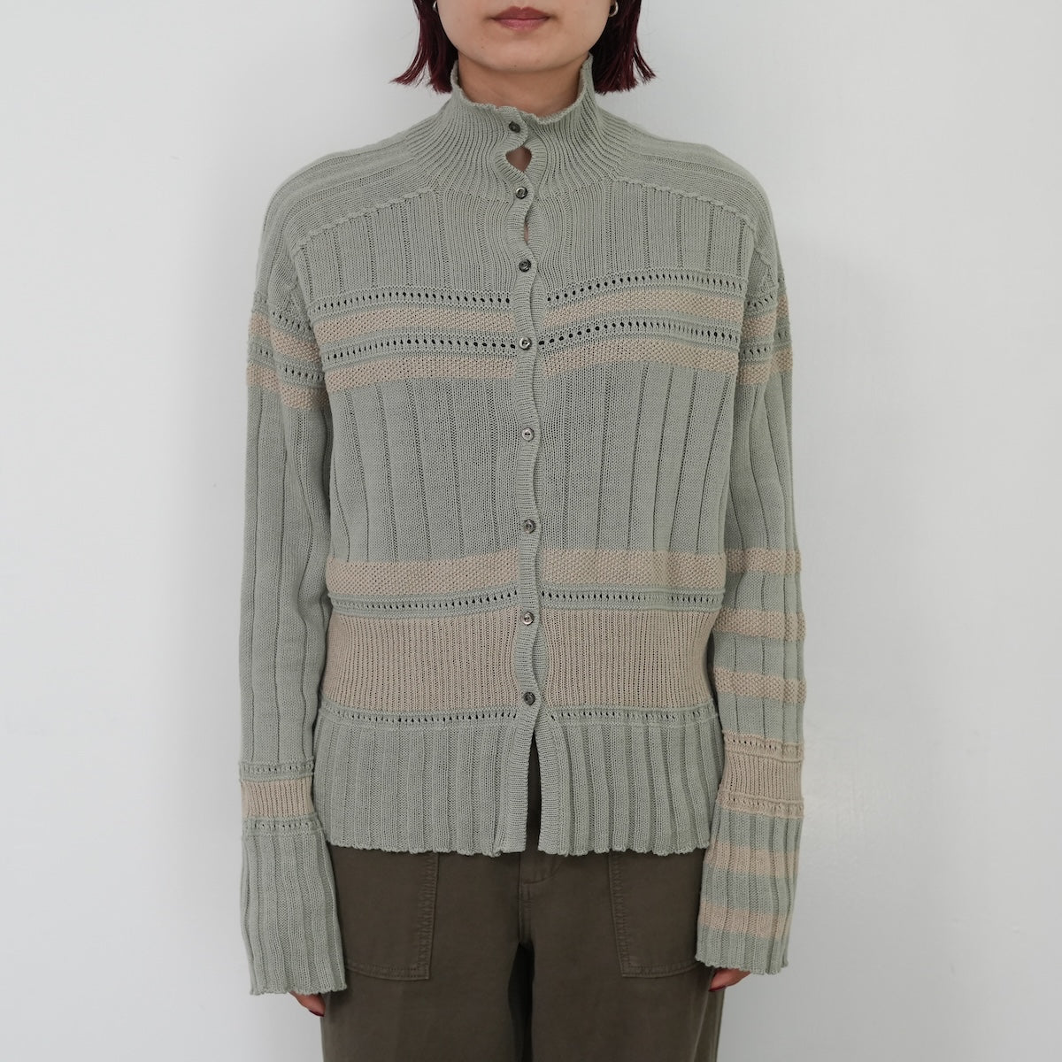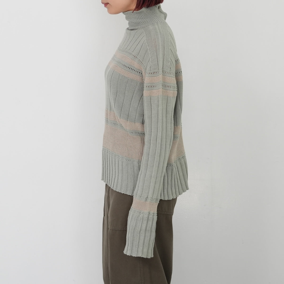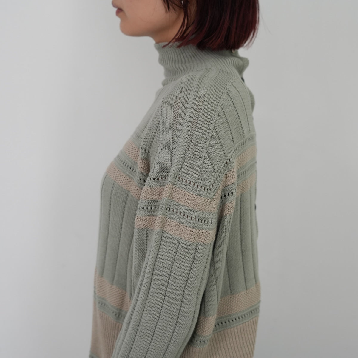 衿元はポロやタートルネックにしたり、カーディガンとして羽織ったり長い季節で楽しんでいただけます。前後どちらもご着用可能です。