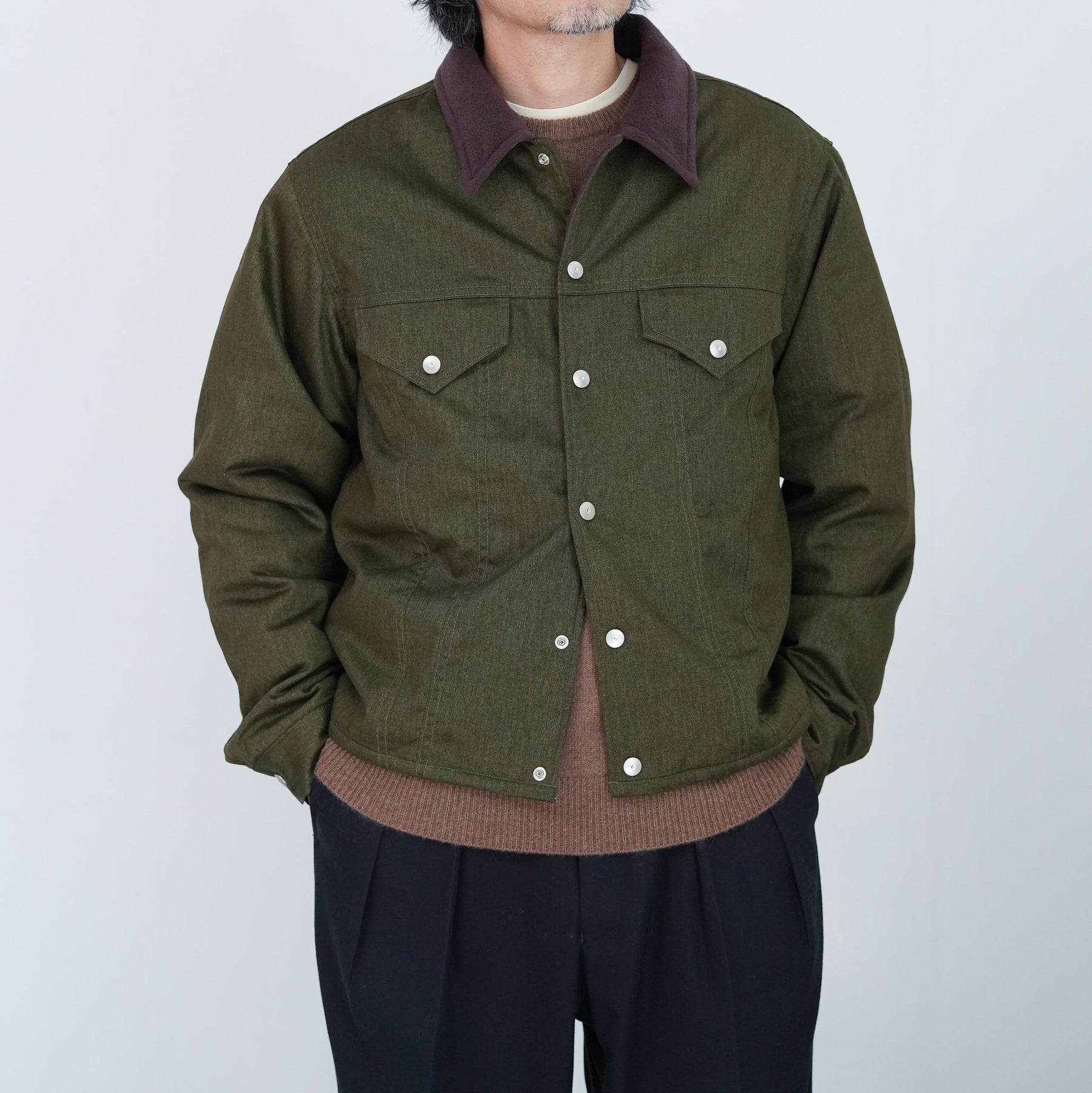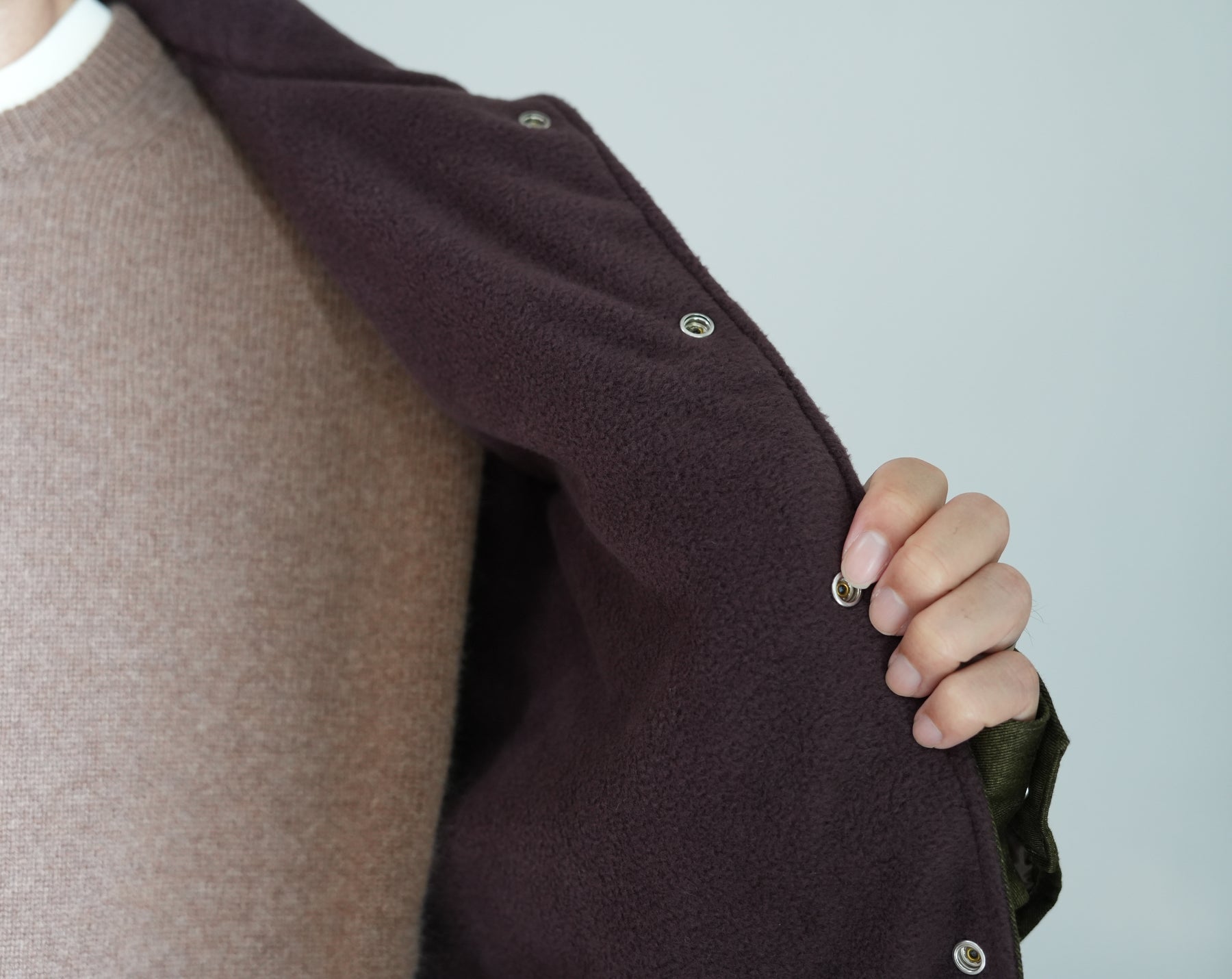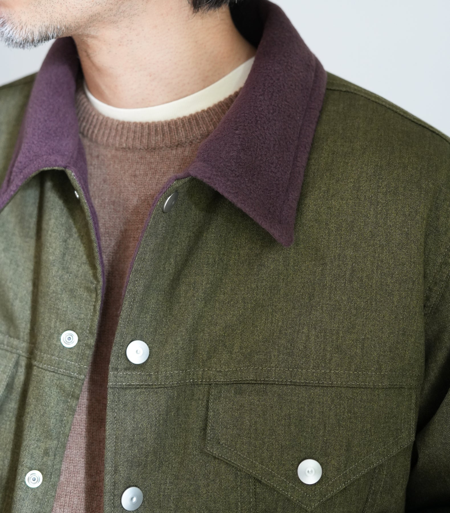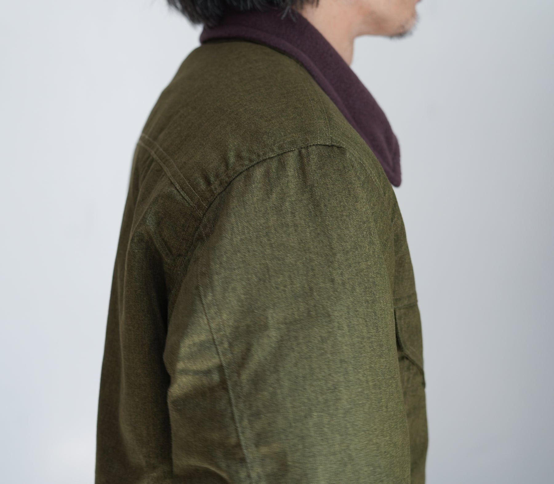 表の厚いデニムは薄手の生地に置き換え、中のボアはフリース素材に変換。そうして軽くて着やすいジャケットに仕立て直しました。パターンは当時のまま。60年代くらいのアイテムですが、コンパクトながらも可動域が確保され、カラダを動かしやすくつくられています。