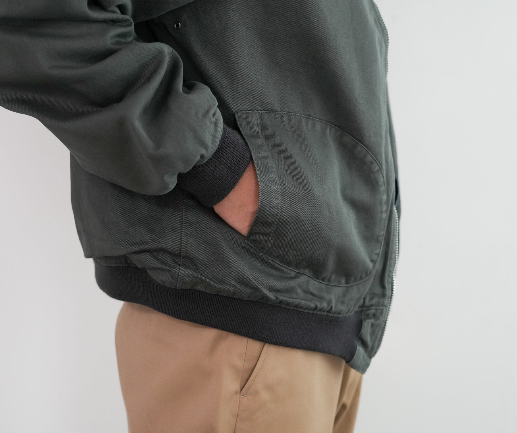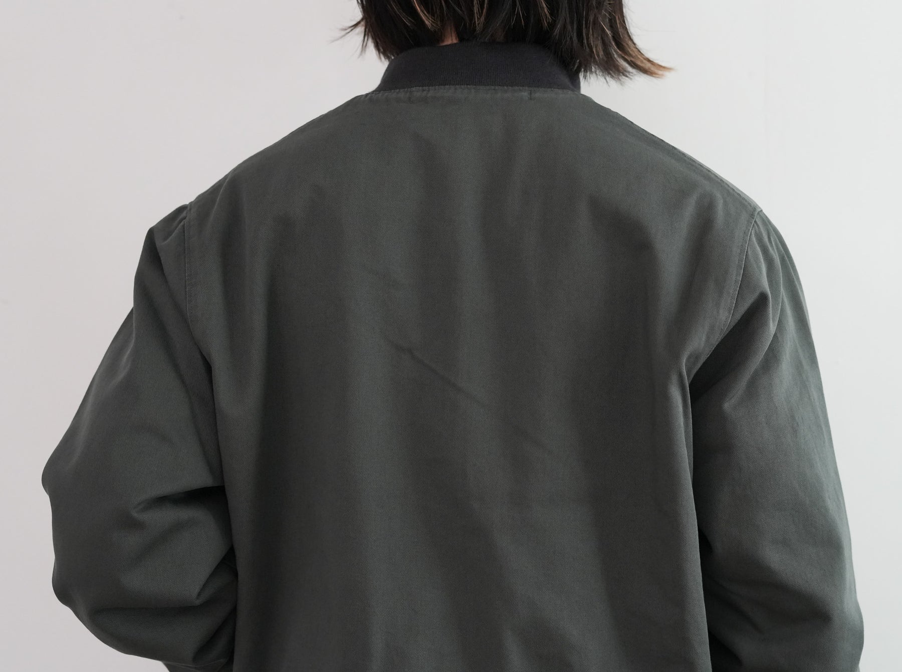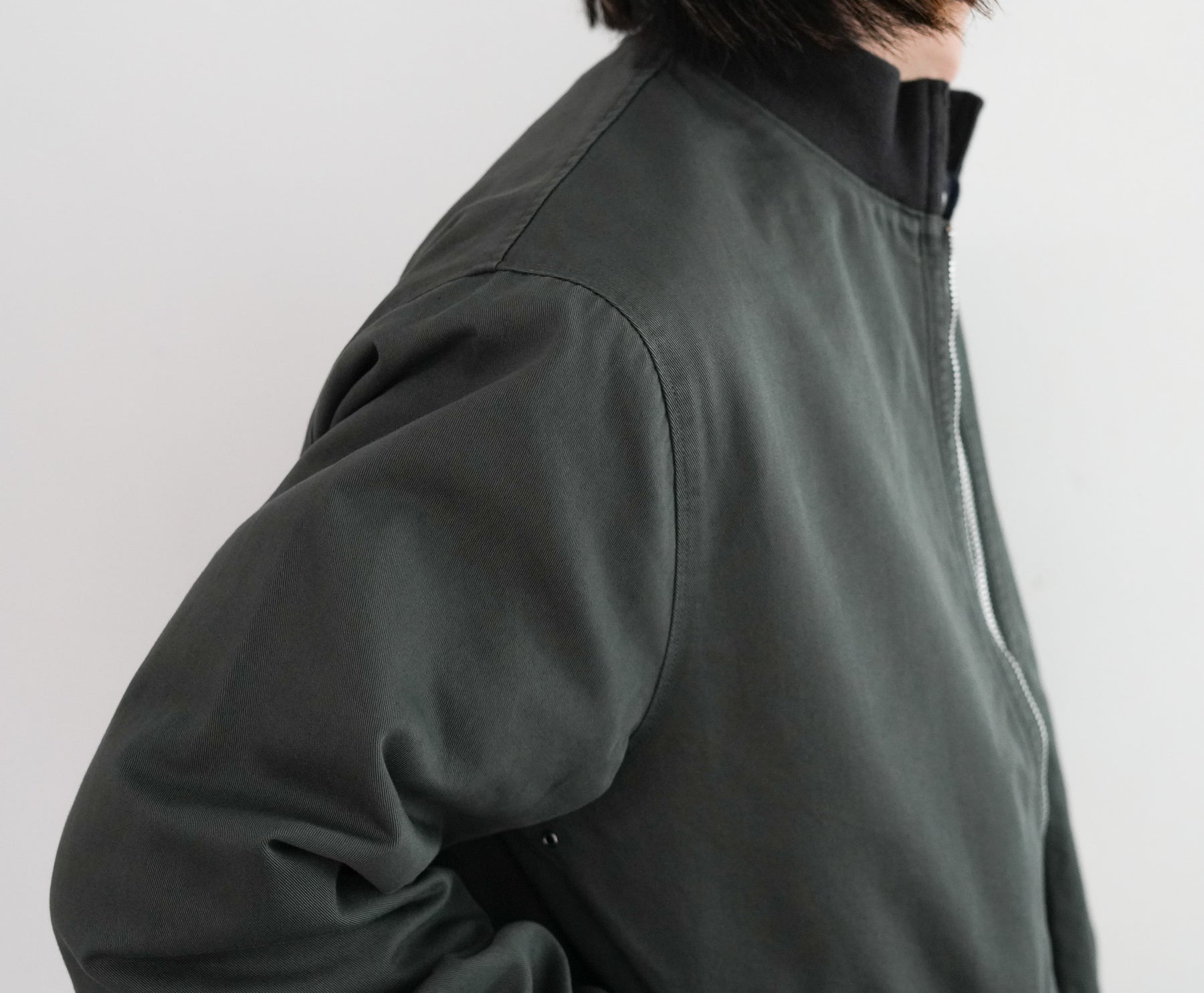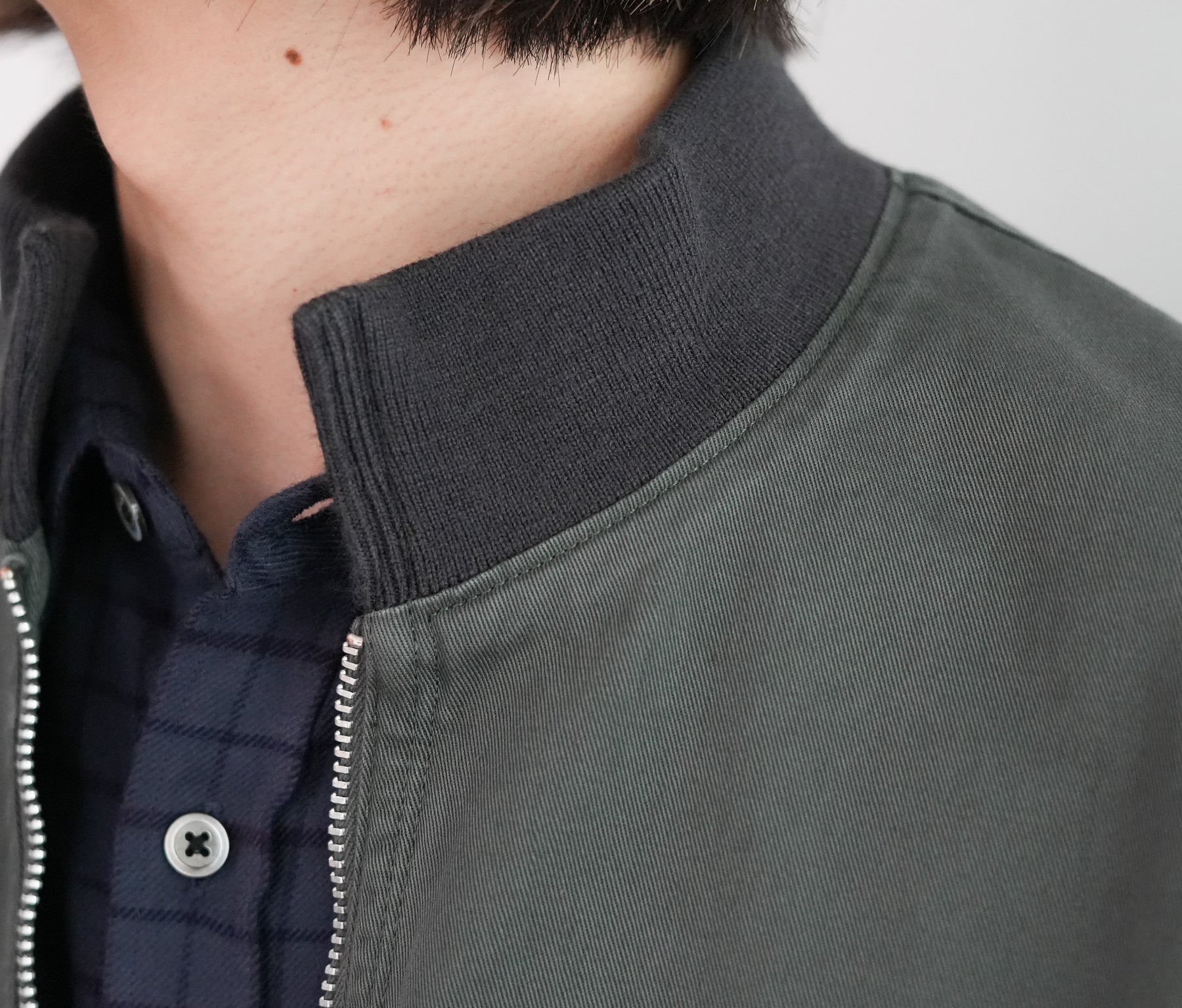 ファスナータイプで、着丈が極端に縮んでしまった個体を見つけ、そのフォルムに惹かれたのが着眼点。ミリタリーでありながらも、どこかワークジャケットのような雰囲気も感じたのです。〈FOUNDOUR〉でもそうした経年変化を表現し、着丈は短めに設定。あえてボディの分量を多めに取って、後ろ見頃がたるんだようなフォルムを再現しています。そのため、やや前下がりのシルエットになっているのもポイントです。
