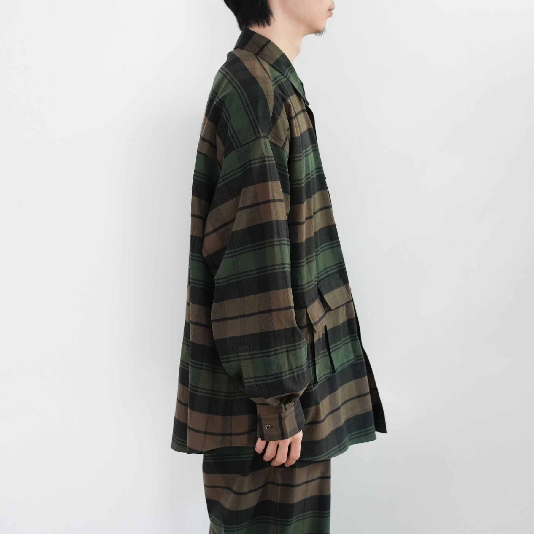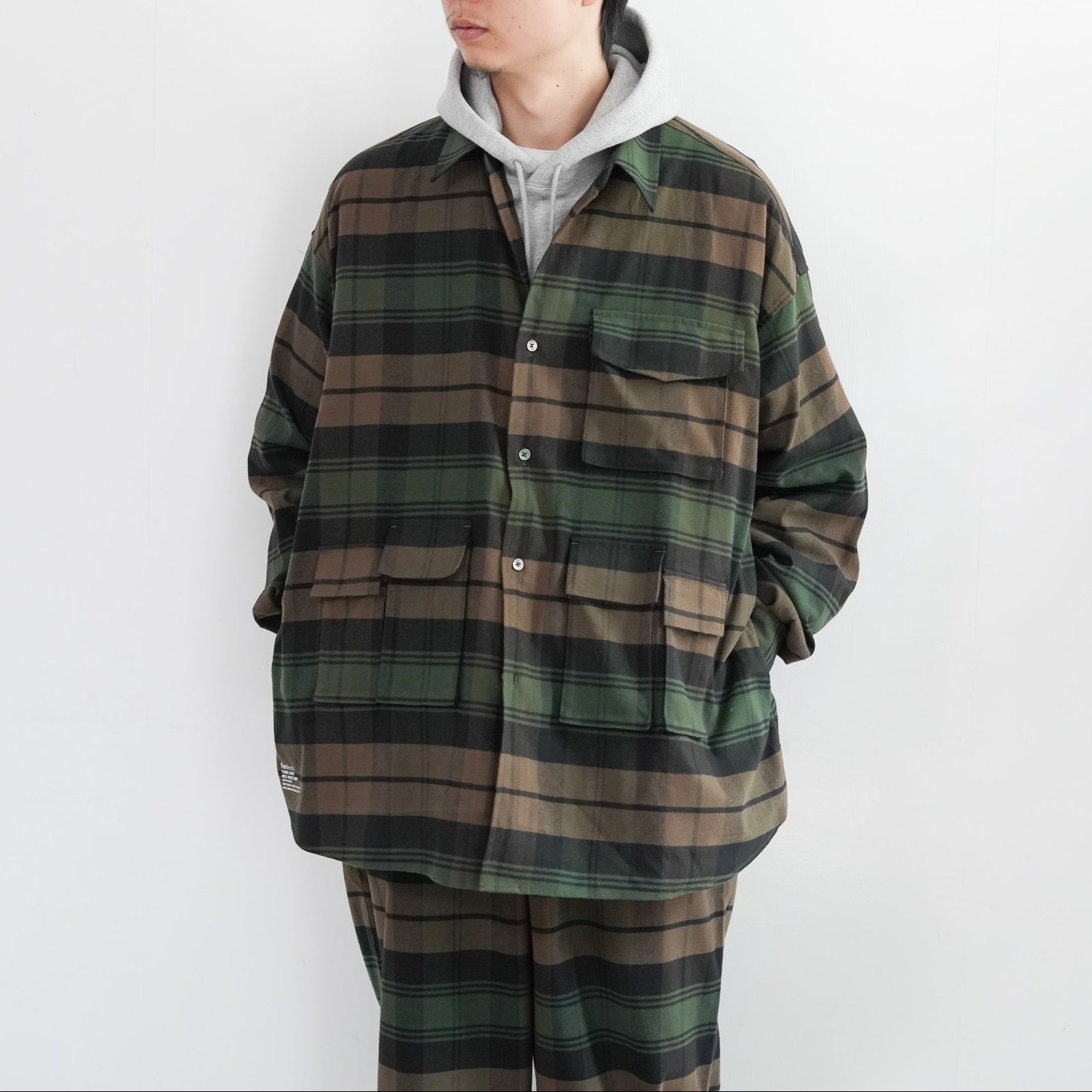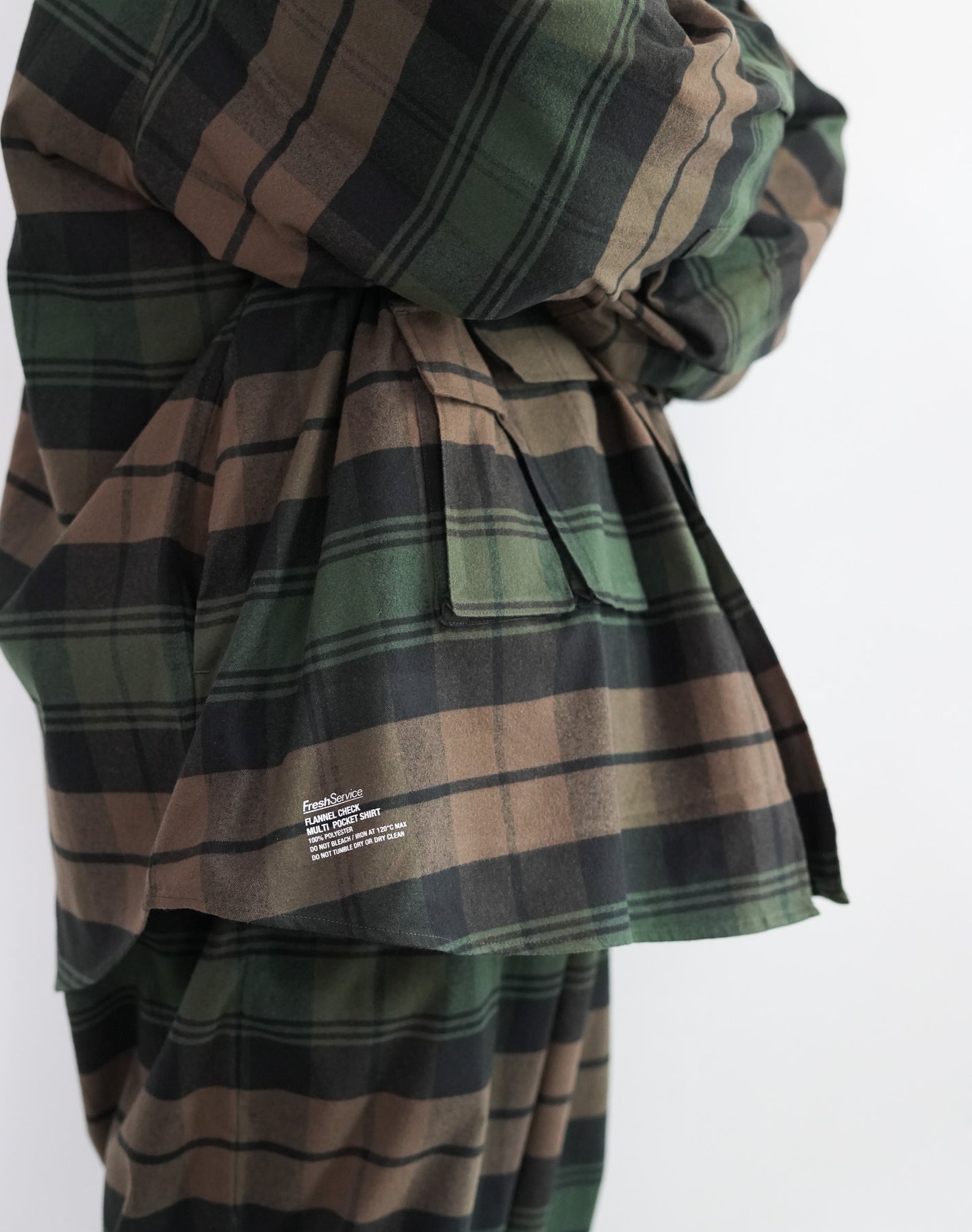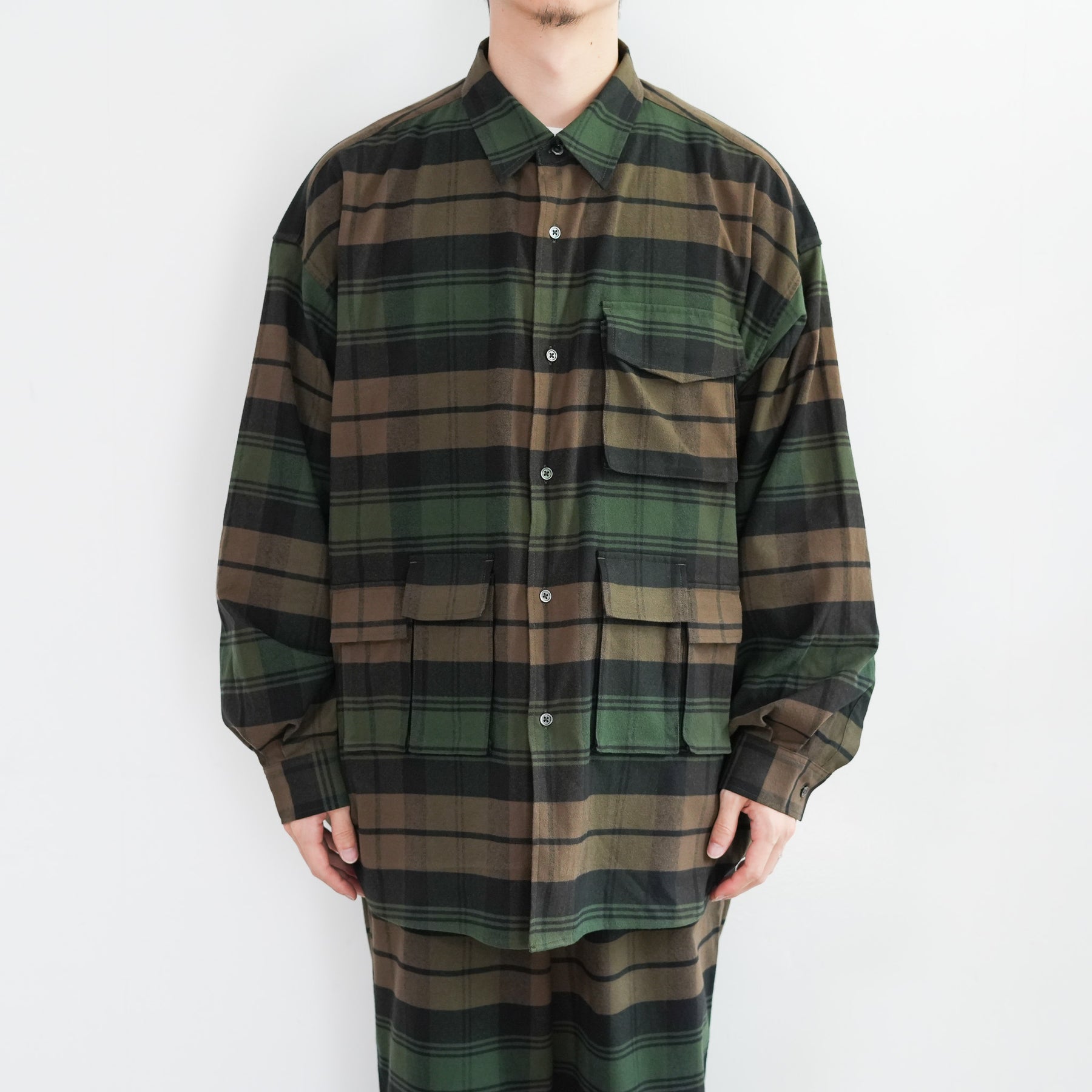 フランネルチェック生地を採用したマルチポケットシャツ。軽さと暖かさに加え、イージーケアも備えた機能素材をチョイス。大小さまざまなポケットをフロントに配し、ツールウェア由来の実用性とデザイン性を両立した一着。肩線を落とした丸みのあるシルエットが、ラフで抜け感のある着こなしに。