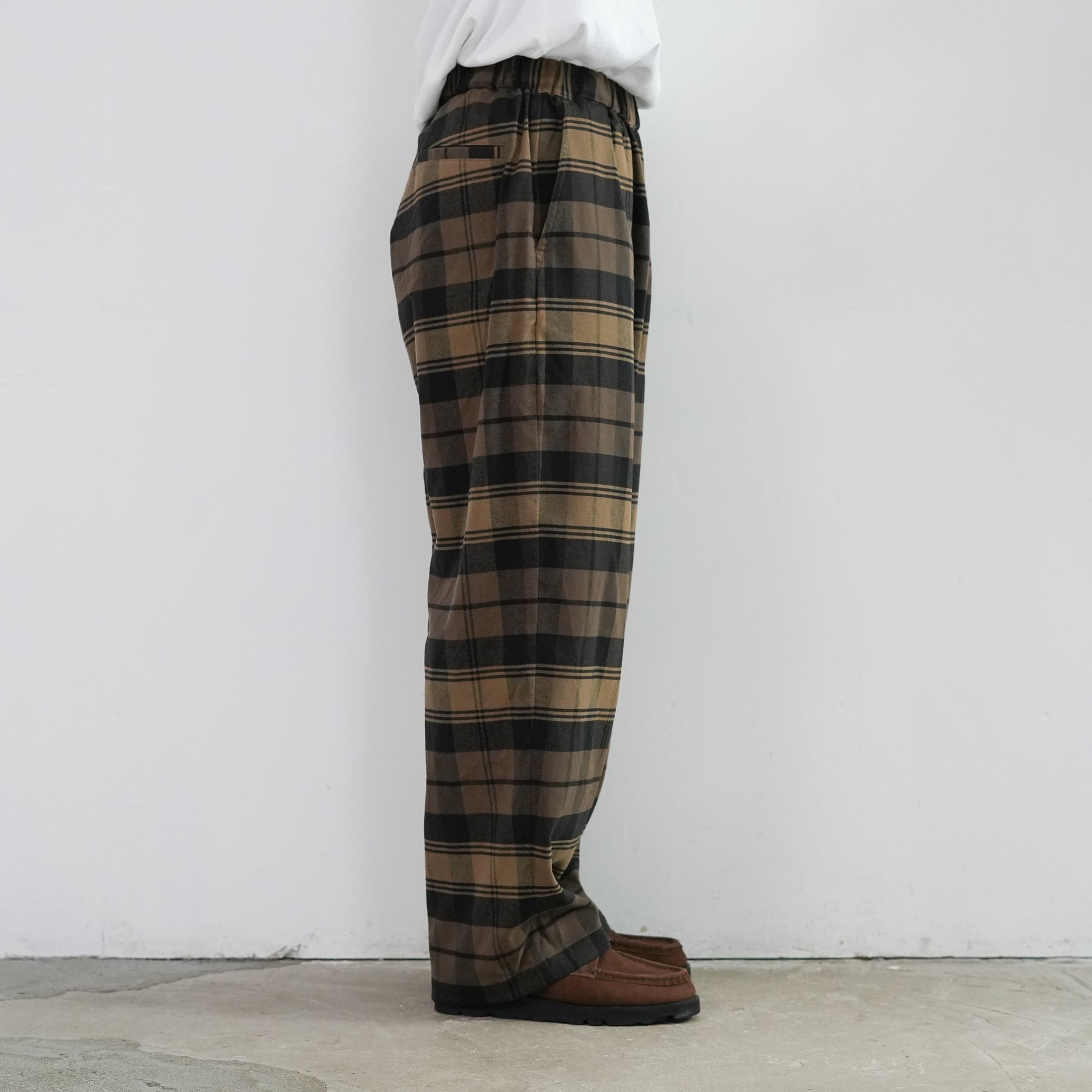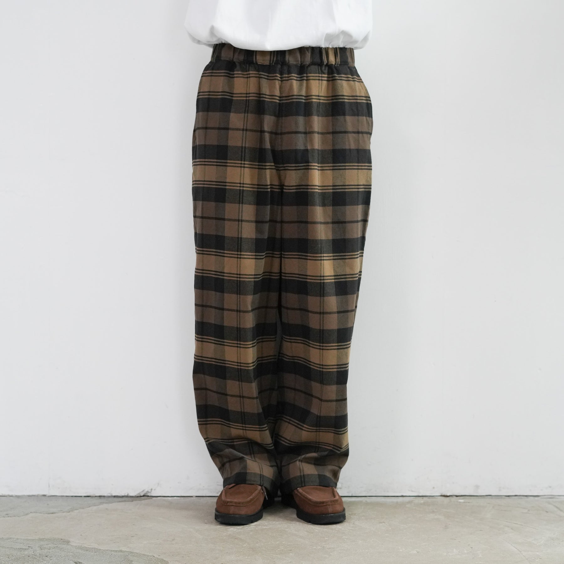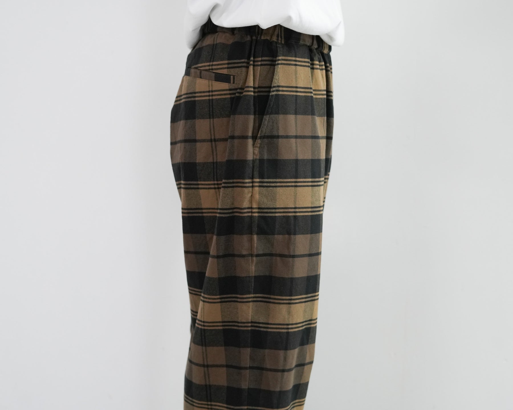フランネルチェック生地を使用したワイドパンツ。軽さと暖かさに加え、イージーケアも備えた機能素材をチョイス。ゆったりとしたストレートシルエットに、裾のドローコードでシルエットのアレンジも可能。ウエストはゴムとドローコード仕様で快適な穿き心地をキープ。