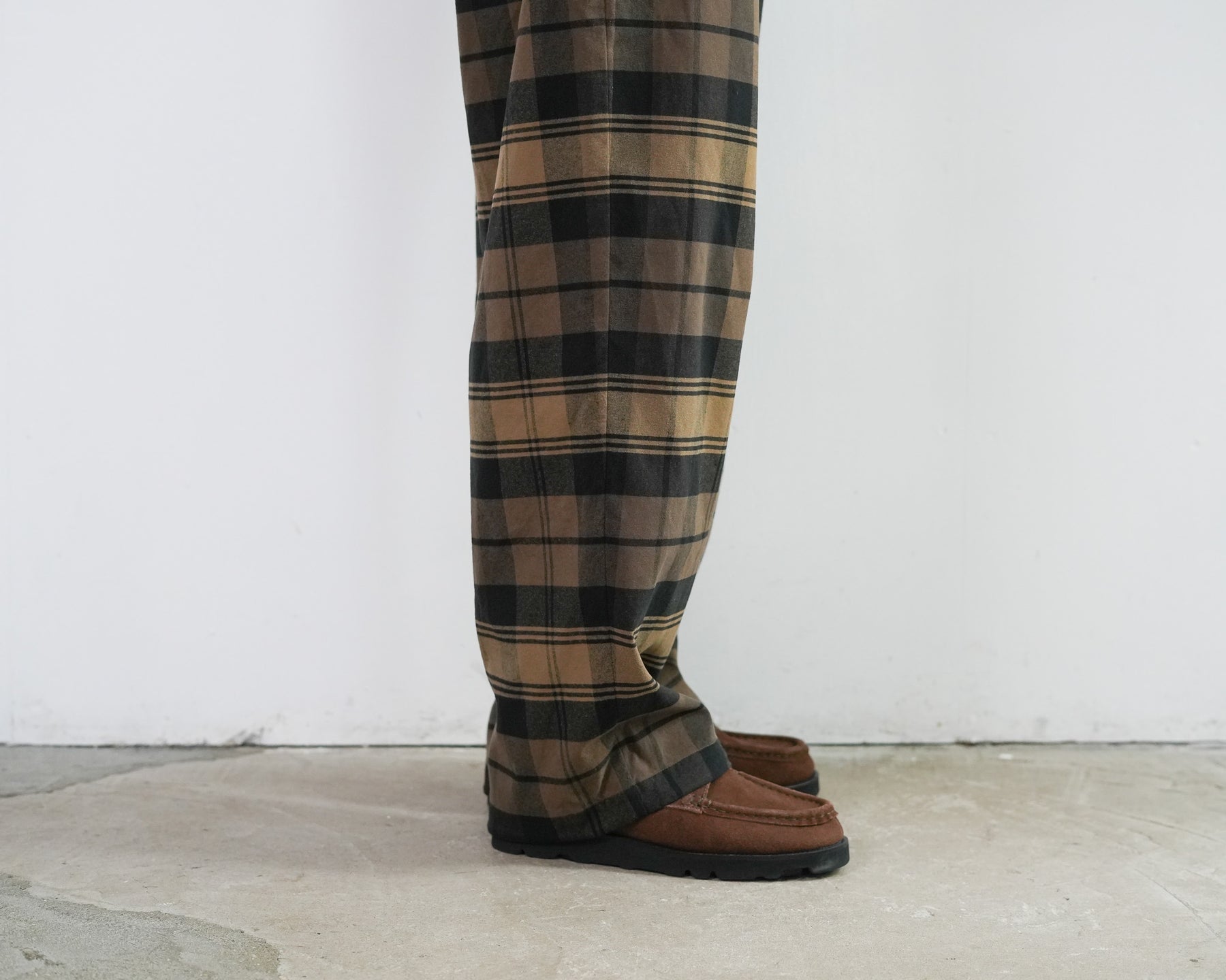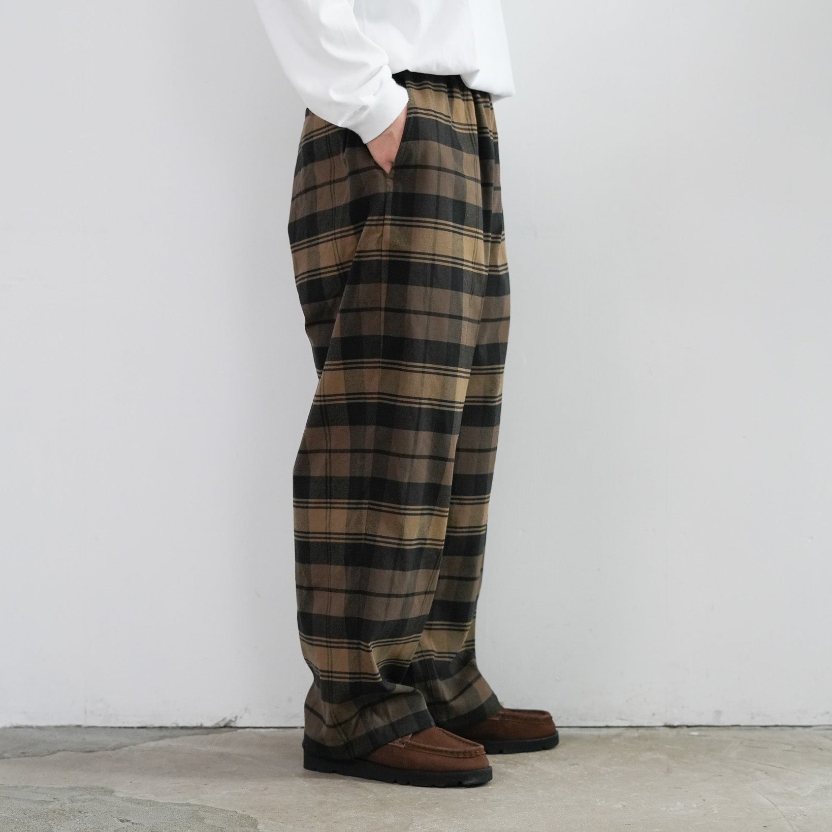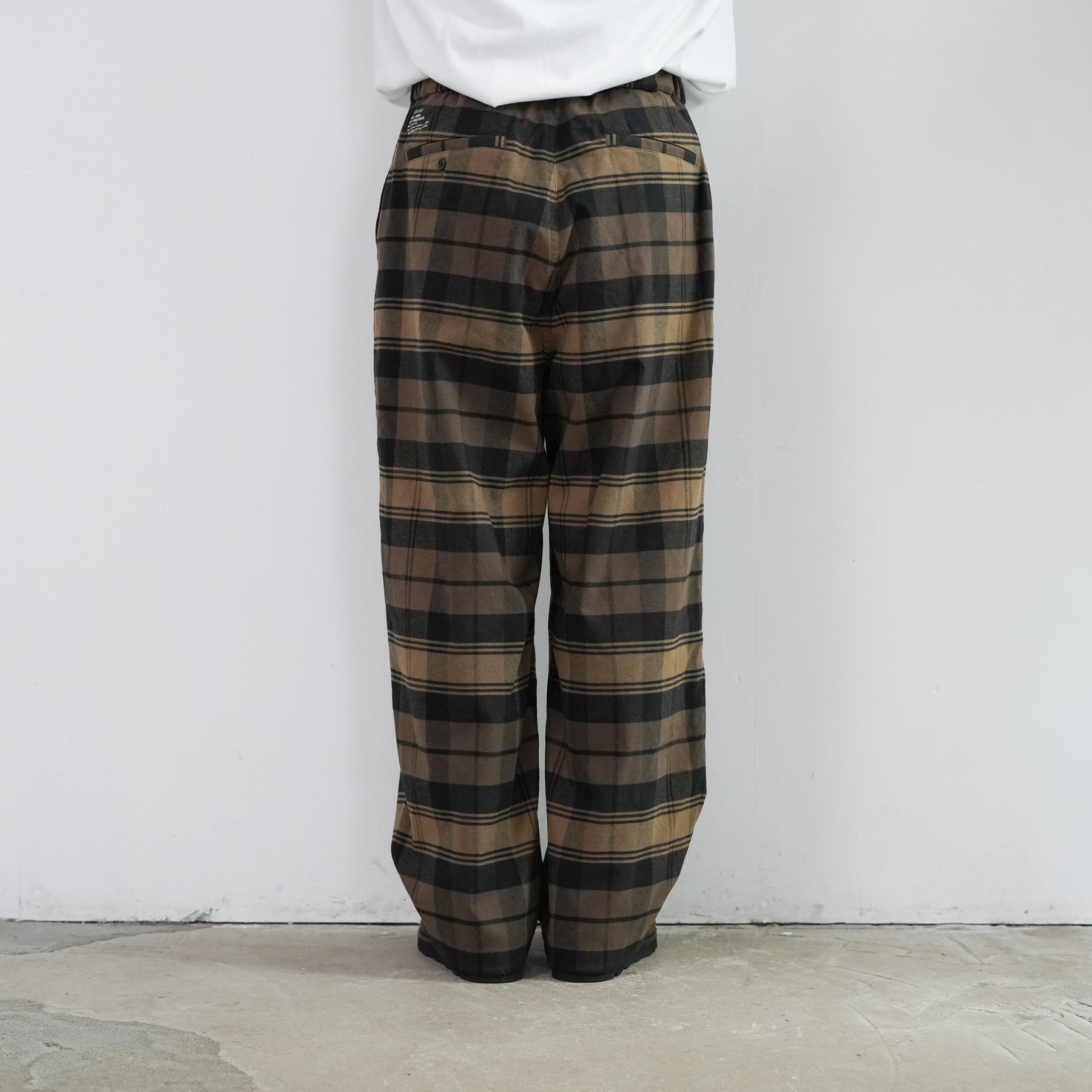 フランネルチェック生地を使用したワイドパンツ。軽さと暖かさに加え、イージーケアも備えた機能素材をチョイス。ゆったりとしたストレートシルエットに、裾のドローコードでシルエットのアレンジも可能。ウエストはゴムとドローコード仕様で快適な穿き心地をキープ。