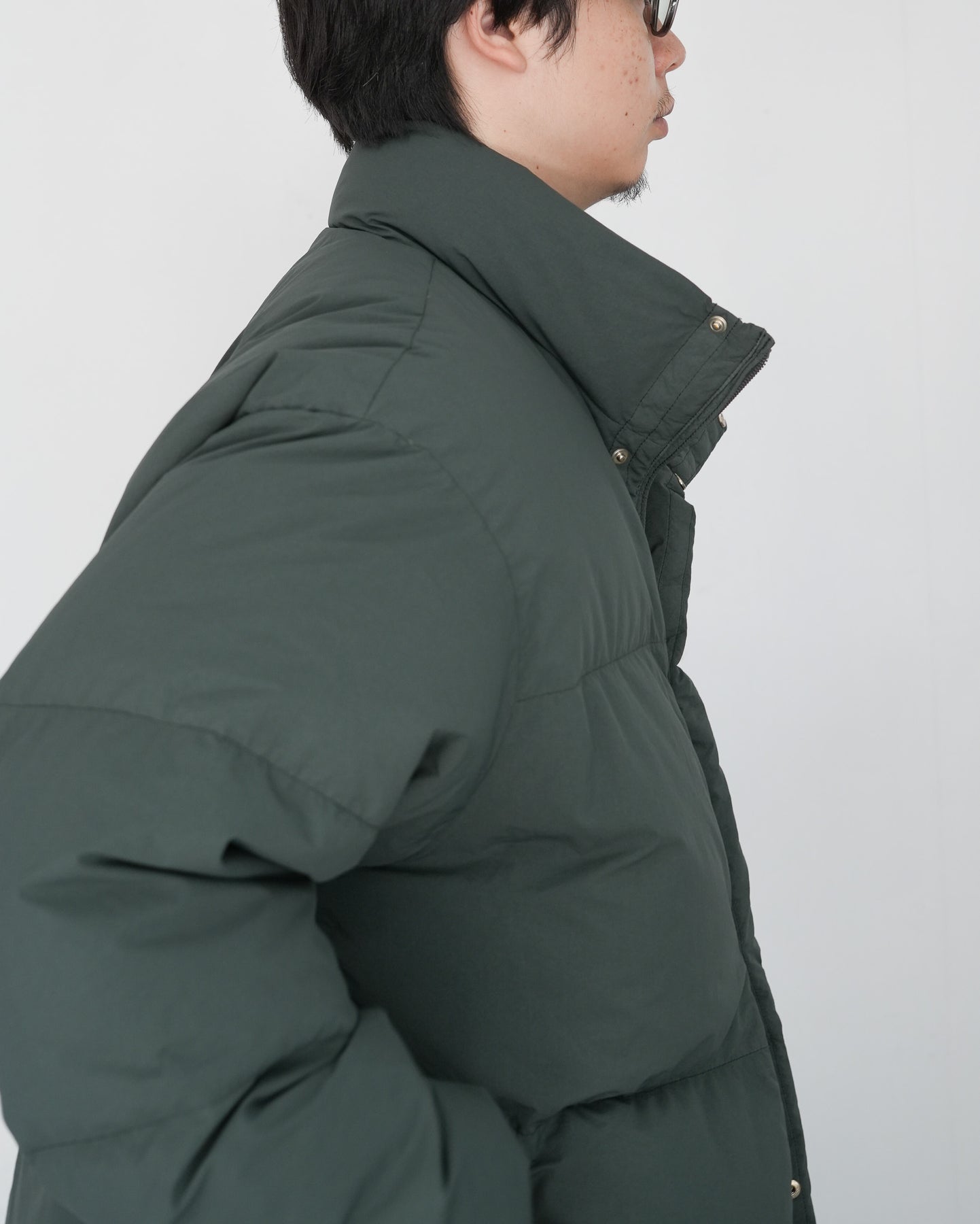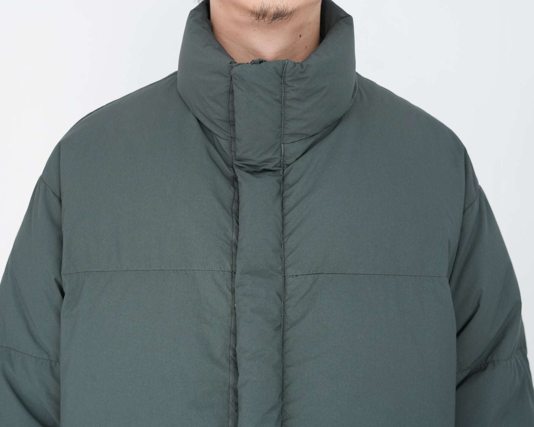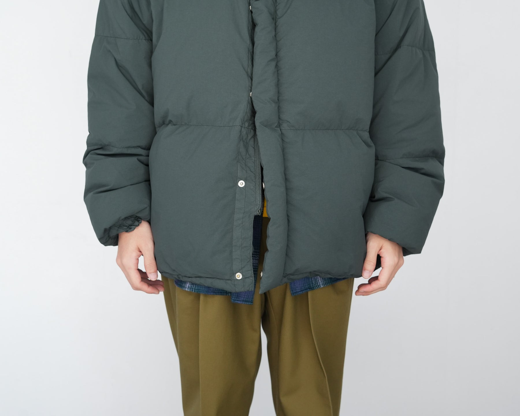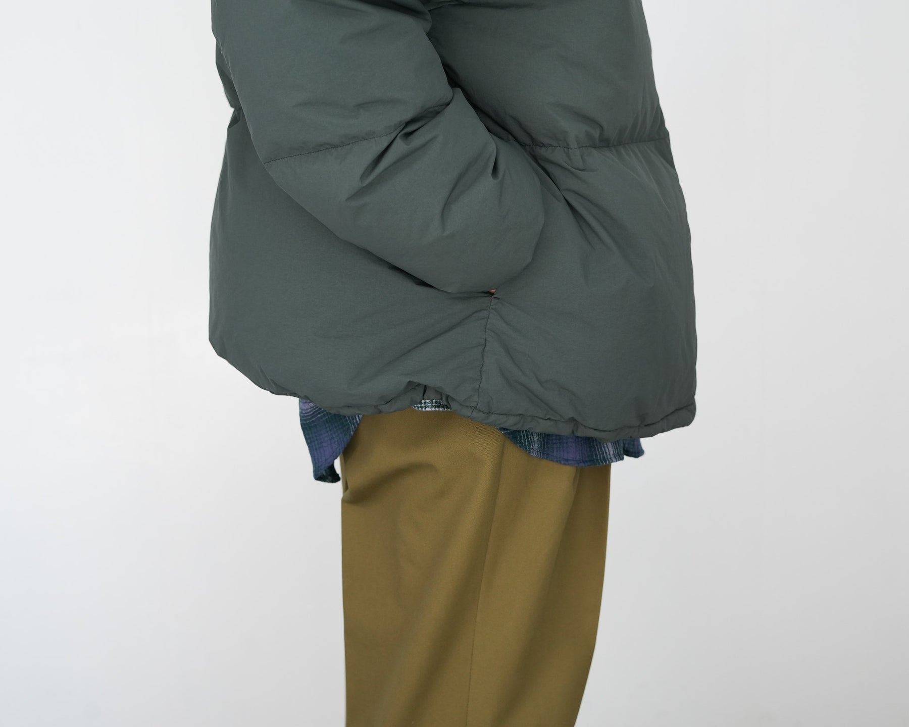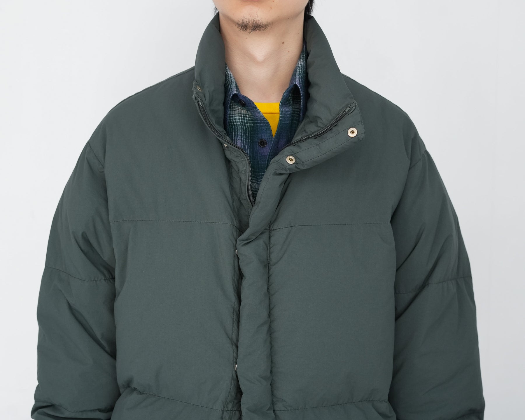 高密度に製織して表面を微起毛させた無染色のナイロンを使用したダウンジャケット。縫製後に染色を施すことで独特な色ムラや縮みによるパッカリングとアタリ、ドライな質感でペーパーライクなハリ感も特徴。大胆に3分割したダウンルームに良質な羽毛を贅沢に詰め込んだボリュームのあるシルエットが主張する一着。ポケットに裾ドローコードを隠したミニマルなディティールも魅力です。