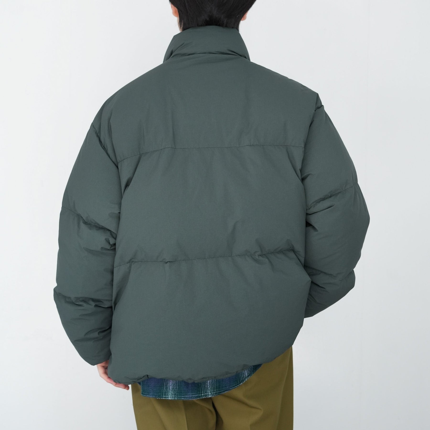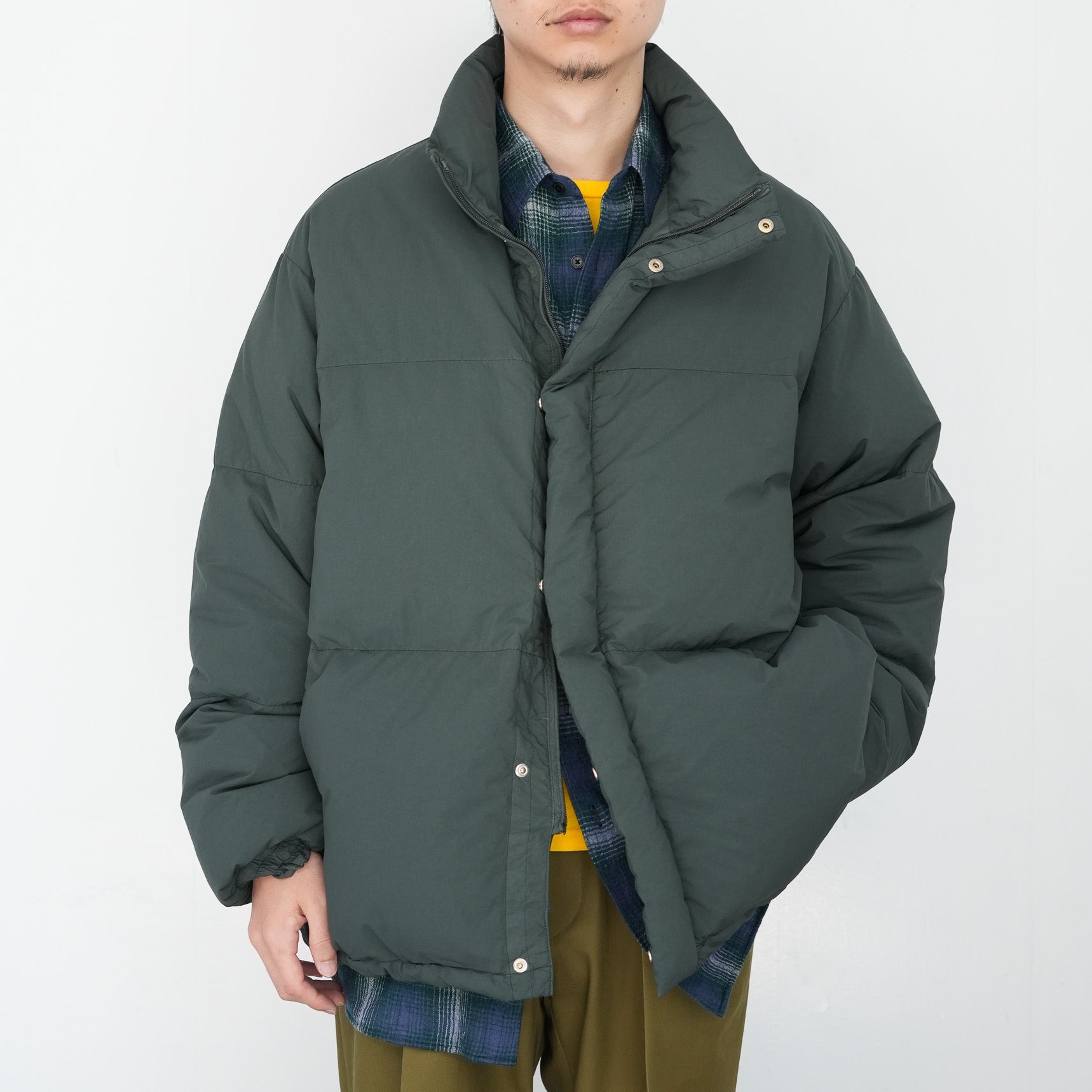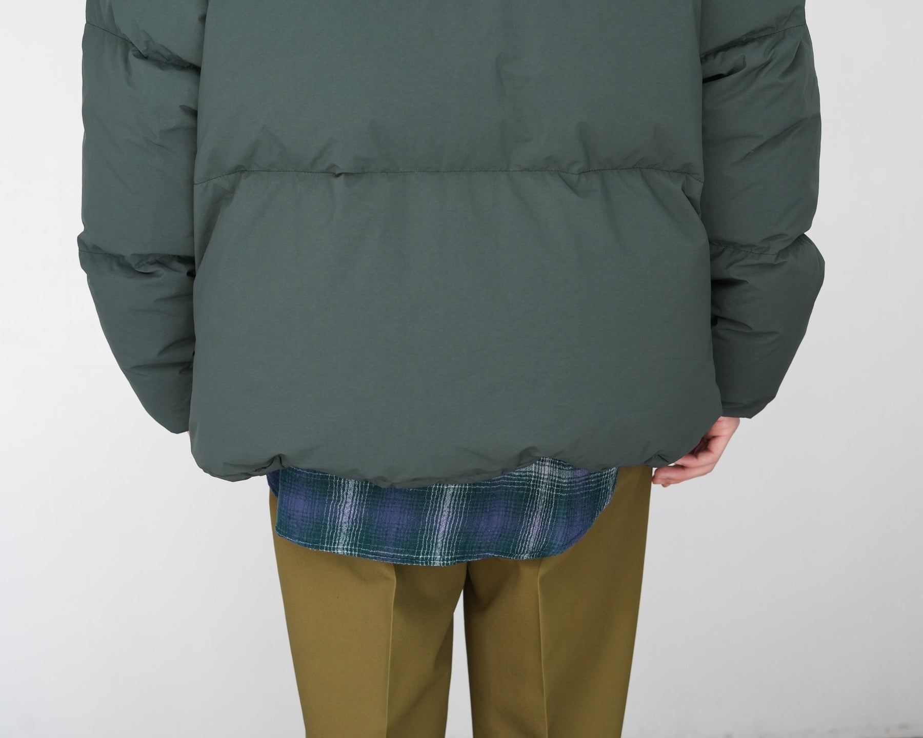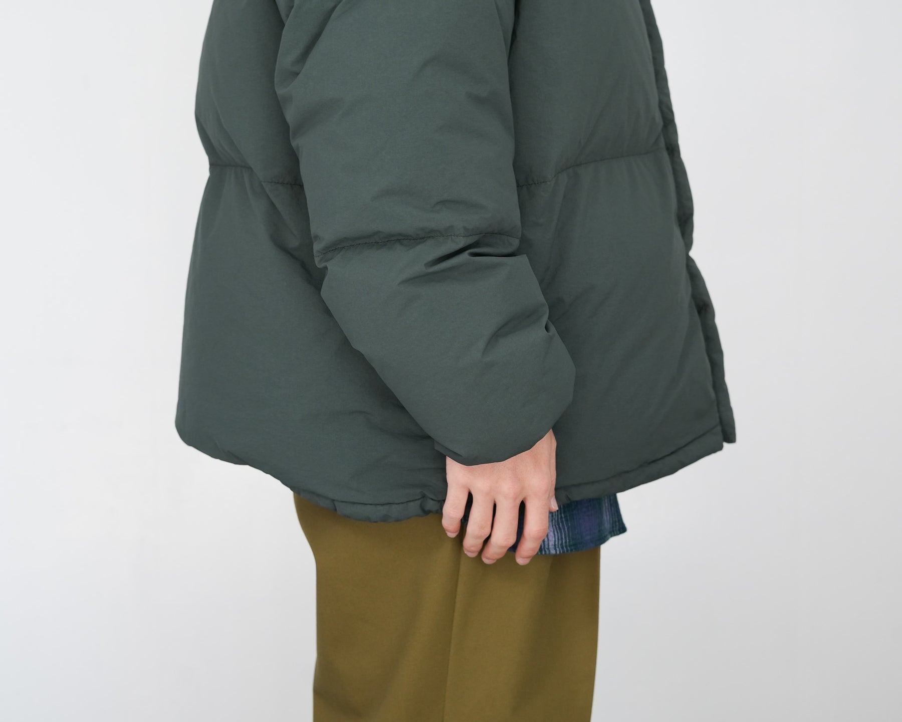 高密度に製織して表面を微起毛させた無染色のナイロンを使用したダウンジャケット。縫製後に染色を施すことで独特な色ムラや縮みによるパッカリングとアタリ、ドライな質感でペーパーライクなハリ感も特徴。大胆に3分割したダウンルームに良質な羽毛を贅沢に詰め込んだボリュームのあるシルエットが主張する一着。ポケットに裾ドローコードを隠したミニマルなディティールも魅力です。