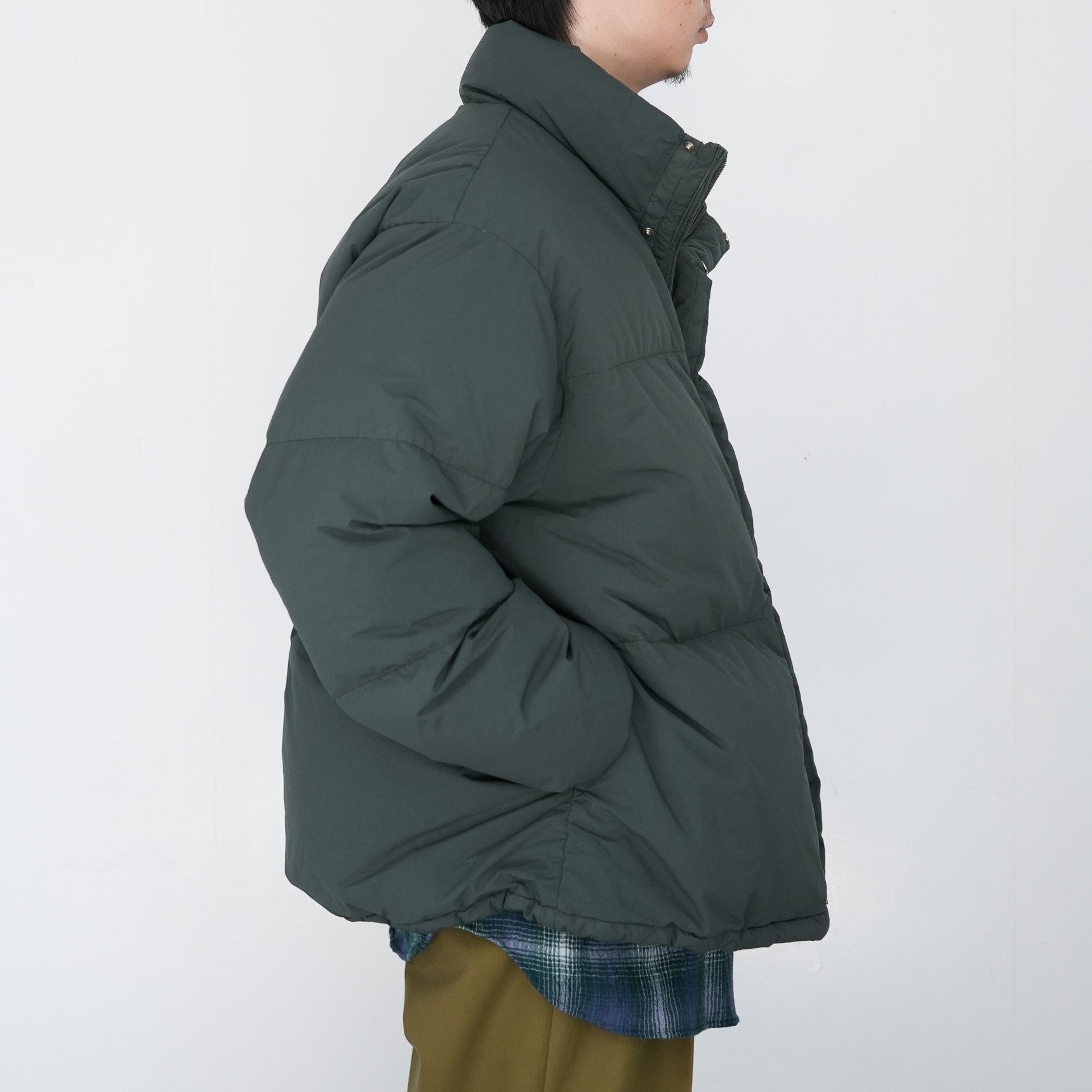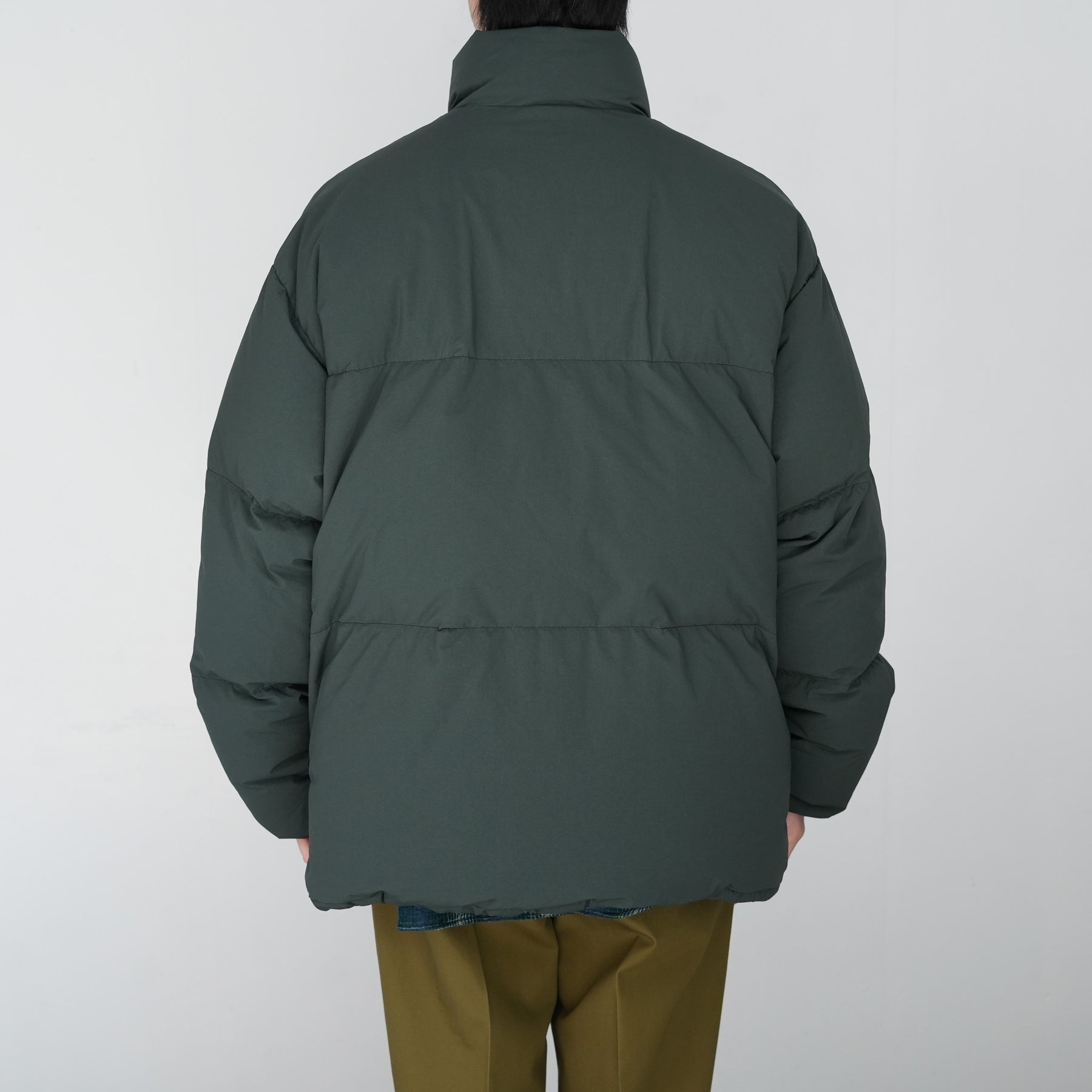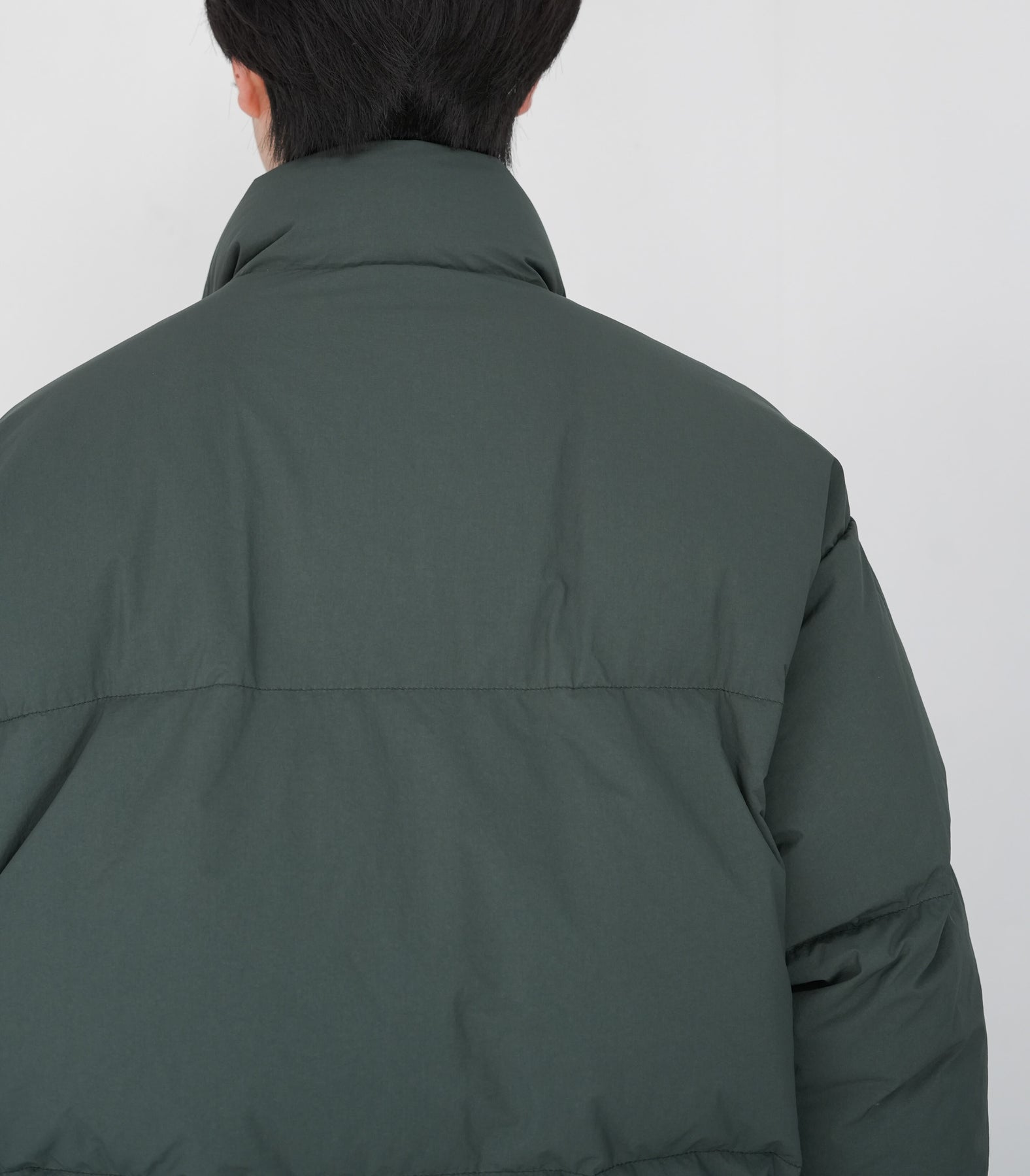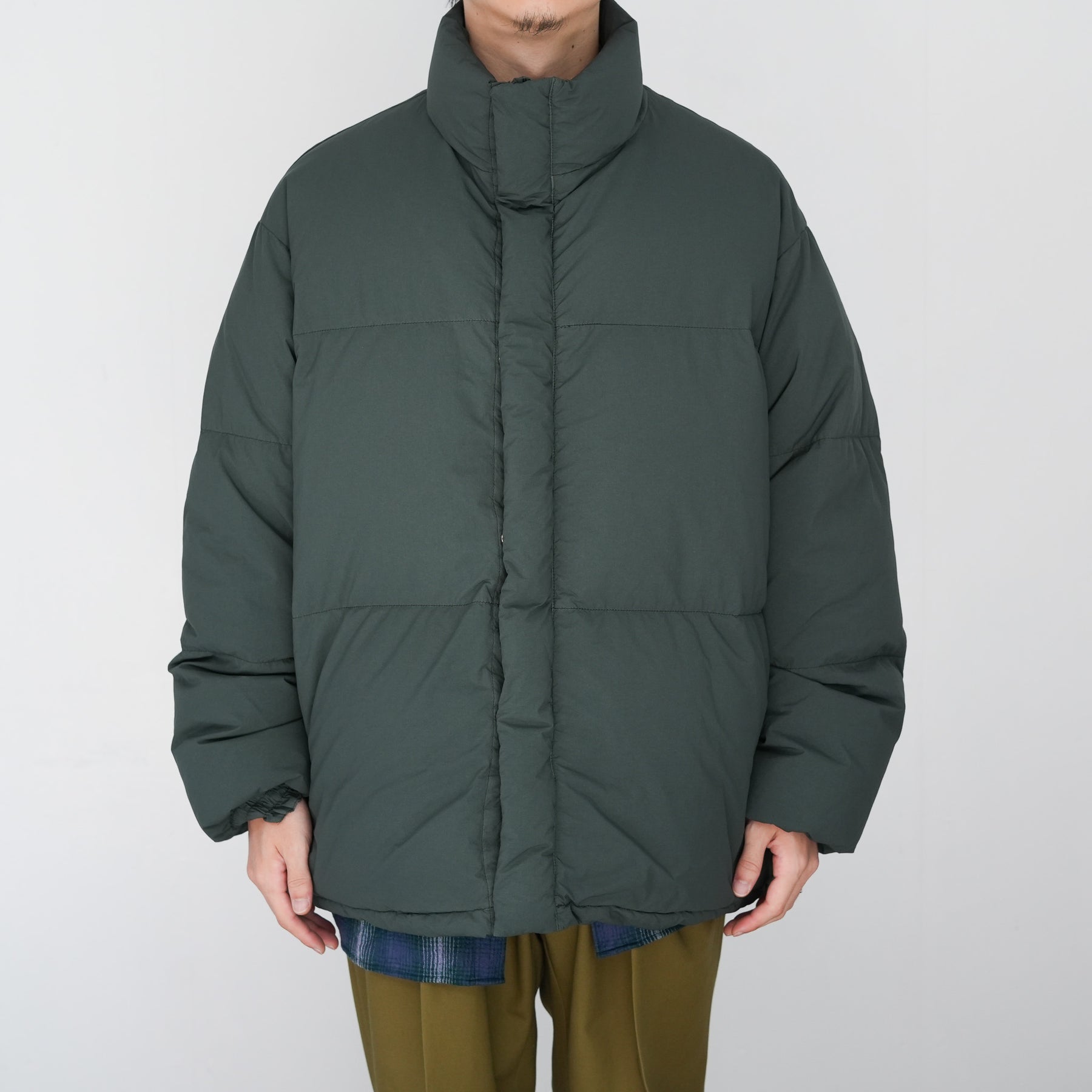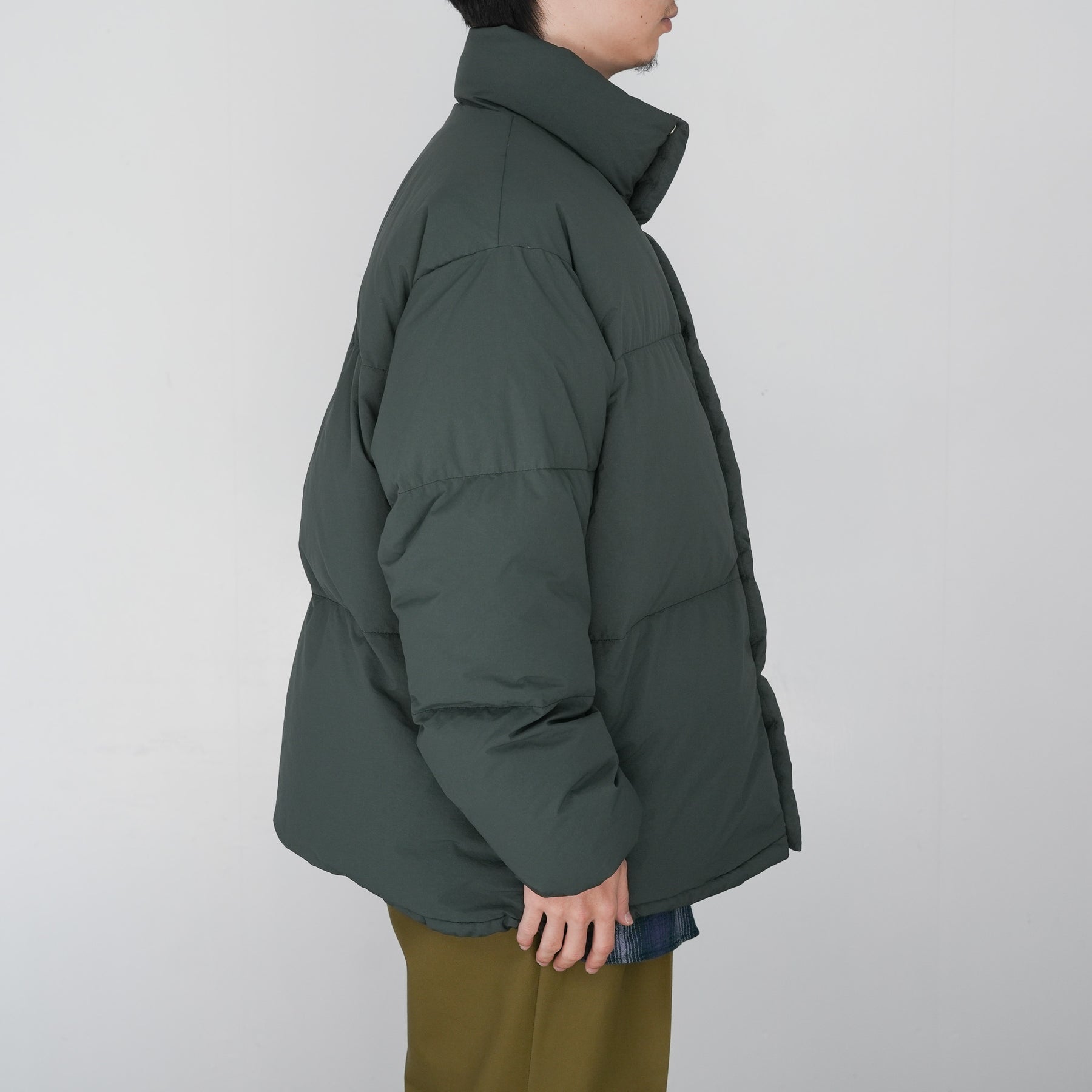 高密度に製織して表面を微起毛させた無染色のナイロンを使用したダウンジャケット。縫製後に染色を施すことで独特な色ムラや縮みによるパッカリングとアタリ、ドライな質感でペーパーライクなハリ感も特徴。大胆に3分割したダウンルームに良質な羽毛を贅沢に詰め込んだボリュームのあるシルエットが主張する一着。ポケットに裾ドローコードを隠したミニマルなディティールも魅力です。