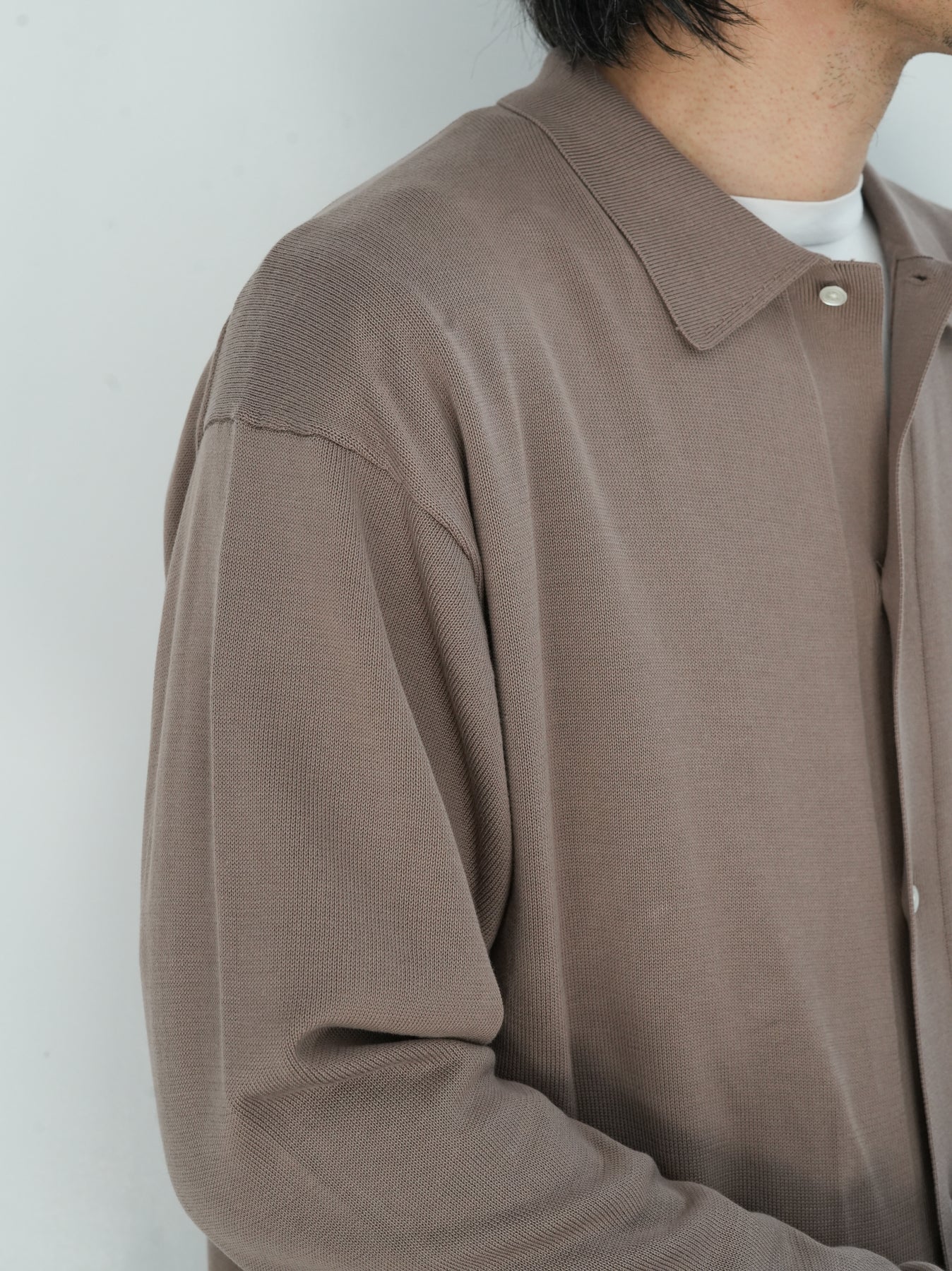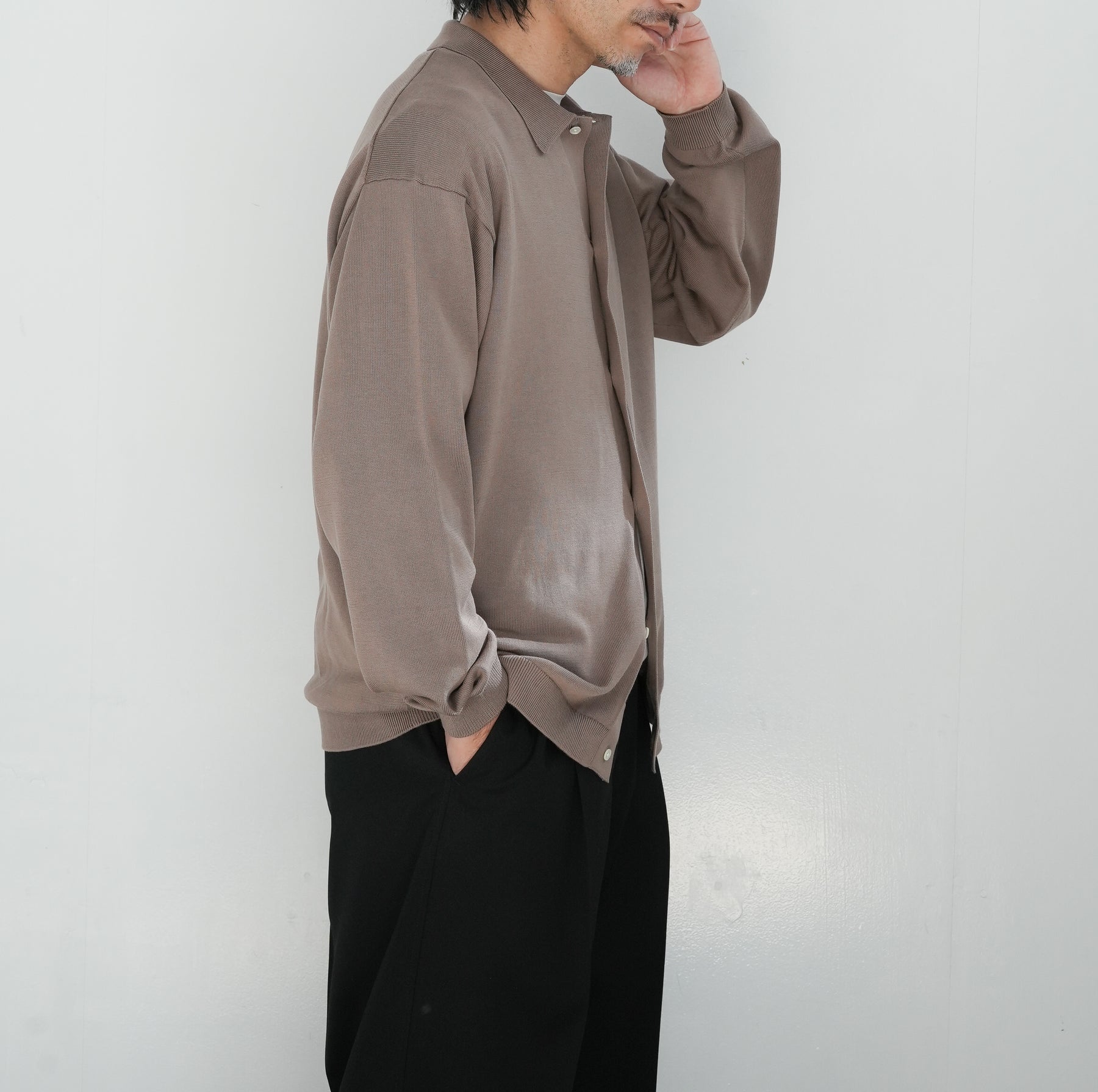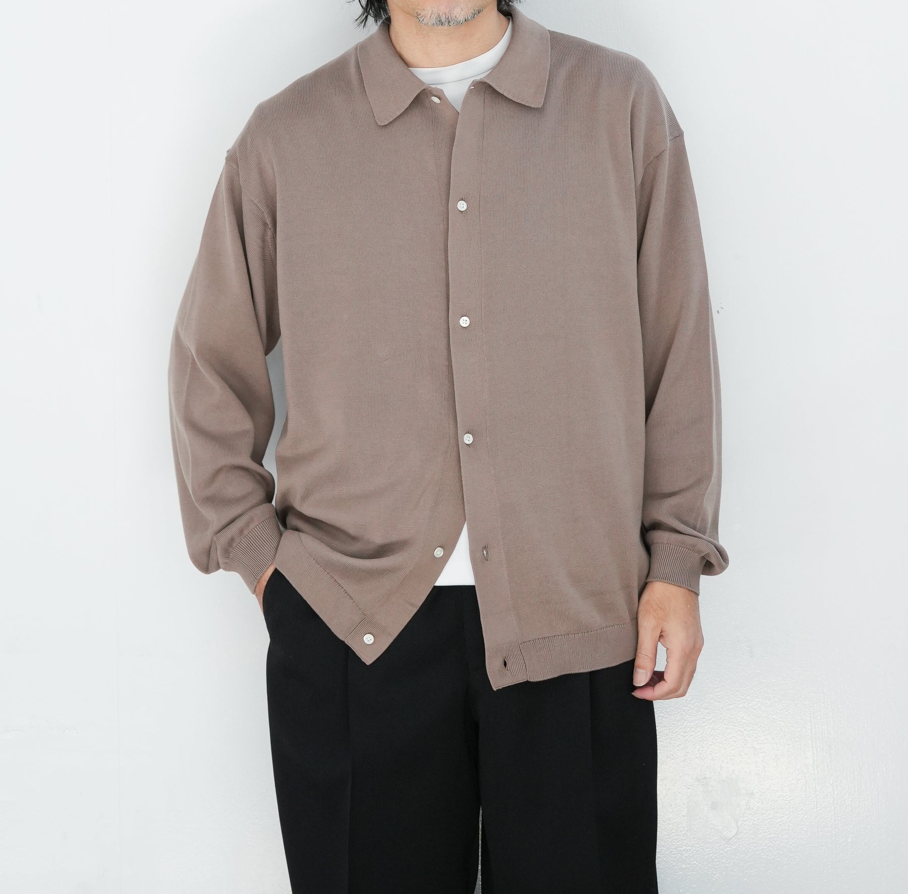 イタリアを拠点に世界中へ高品質な糸を供給するEmilcotoni社のスビンコットンを使用したロングスリーブニットシャツ。ボリュームのあるシルエットで、カーディガンのようにも着用が可能。糸本来が持つ上品な光沢と、豊富な油脂分によるなめらかな肌触りが魅力です。