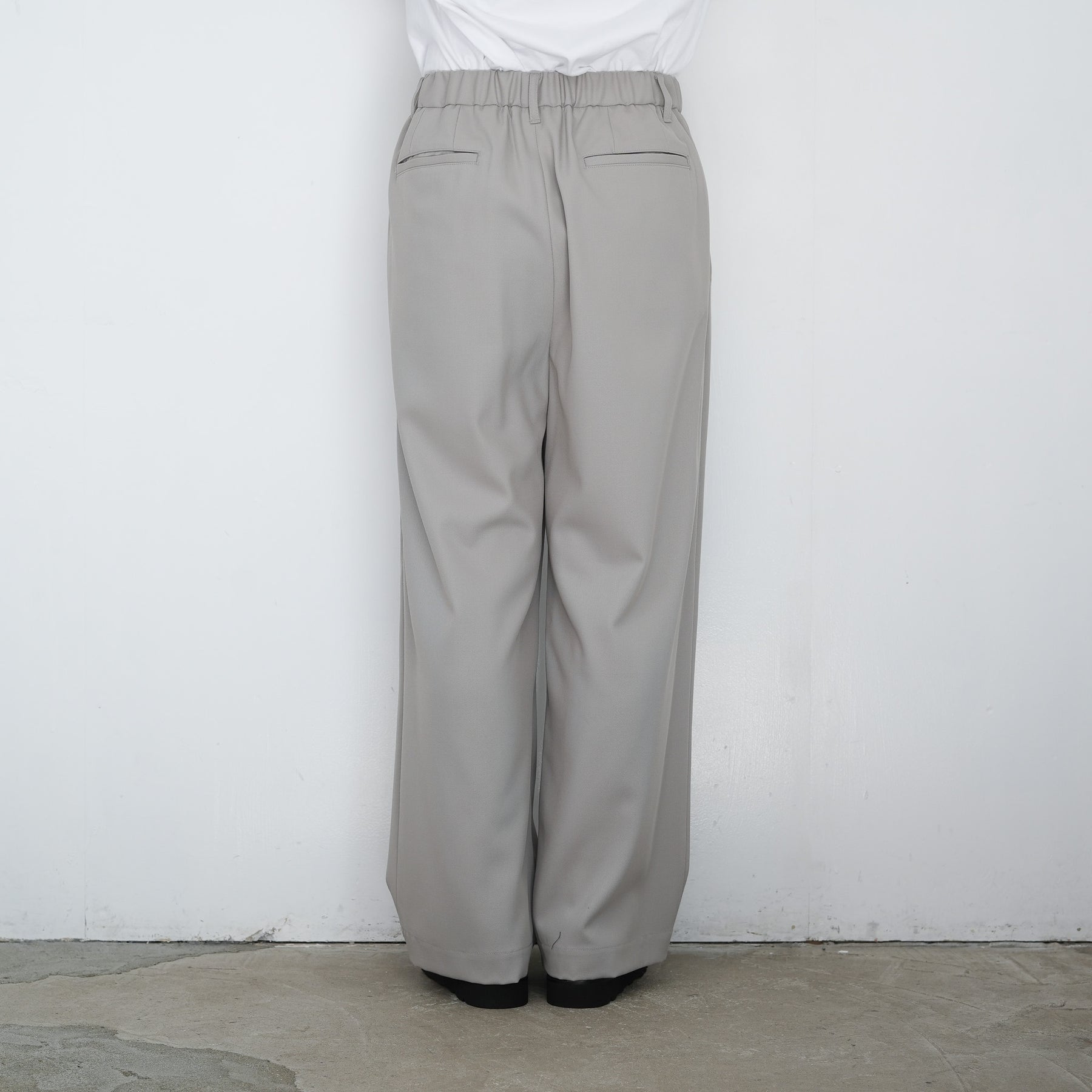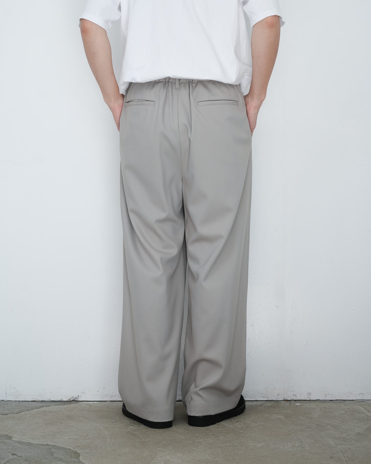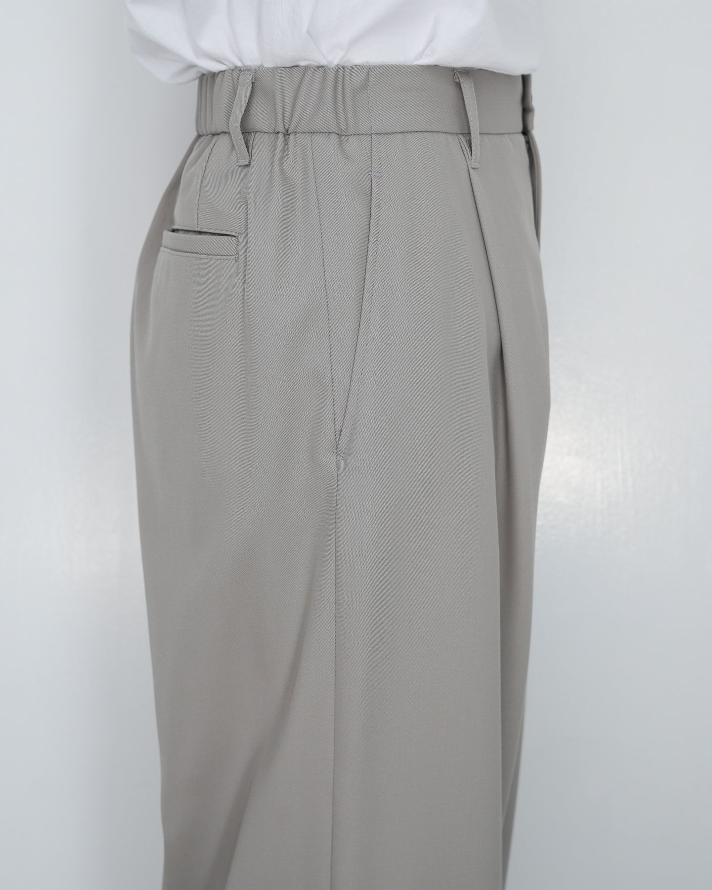 ゆったりとしたテーパードシルエットに、後ろウエストゴムで快適さを加えたトラウザー。ウール本来の風合いと、ナイロンの形態安定性・耐久性を両立させたハイブリッドギャバジンを使用。ドライなタッチと毛羽立ちにくい素材感で、無骨さと洗練を両立したイージーケアな一着。
