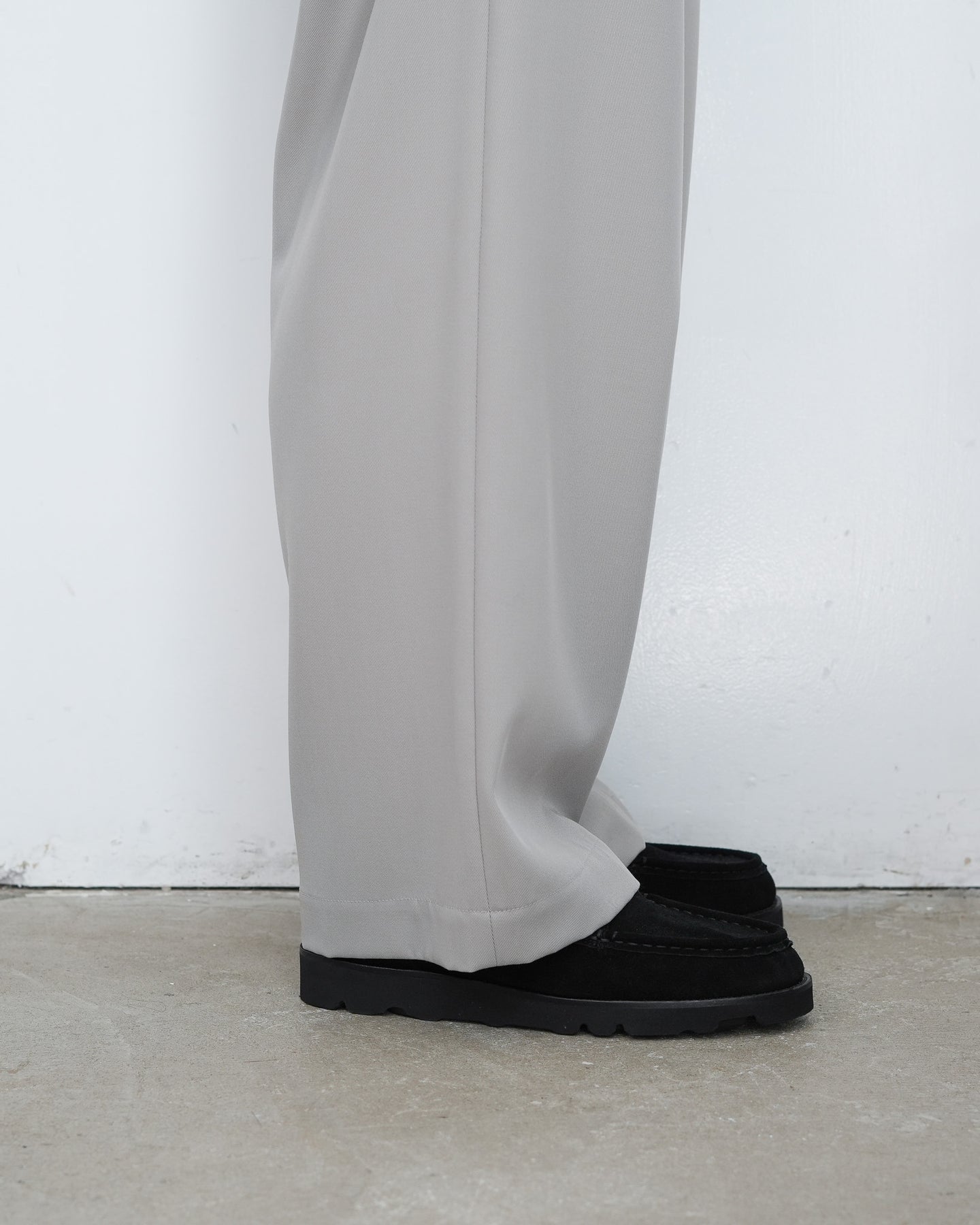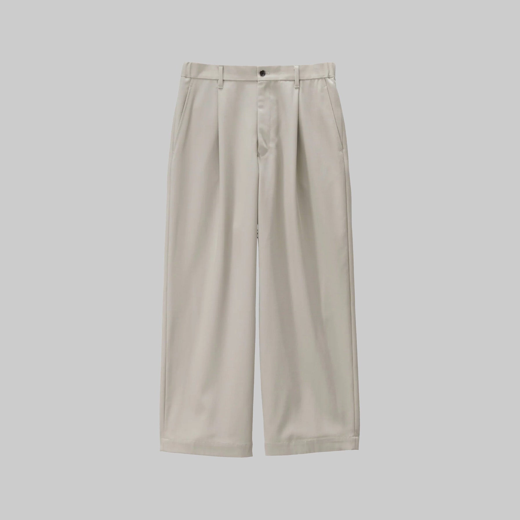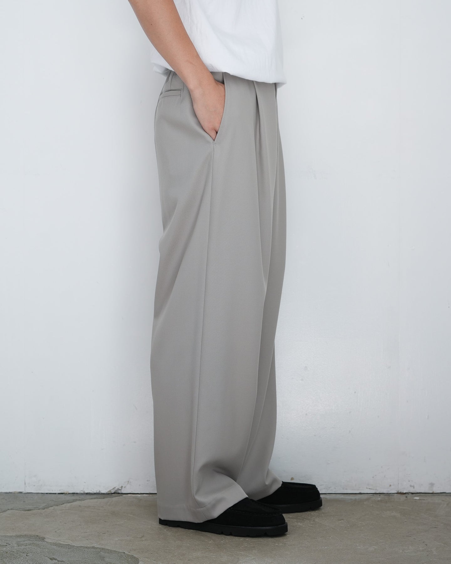 ゆったりとしたテーパードシルエットに、後ろウエストゴムで快適さを加えたトラウザー。ウール本来の風合いと、ナイロンの形態安定性・耐久性を両立させたハイブリッドギャバジンを使用。ドライなタッチと毛羽立ちにくい素材感で、無骨さと洗練を両立したイージーケアな一着。