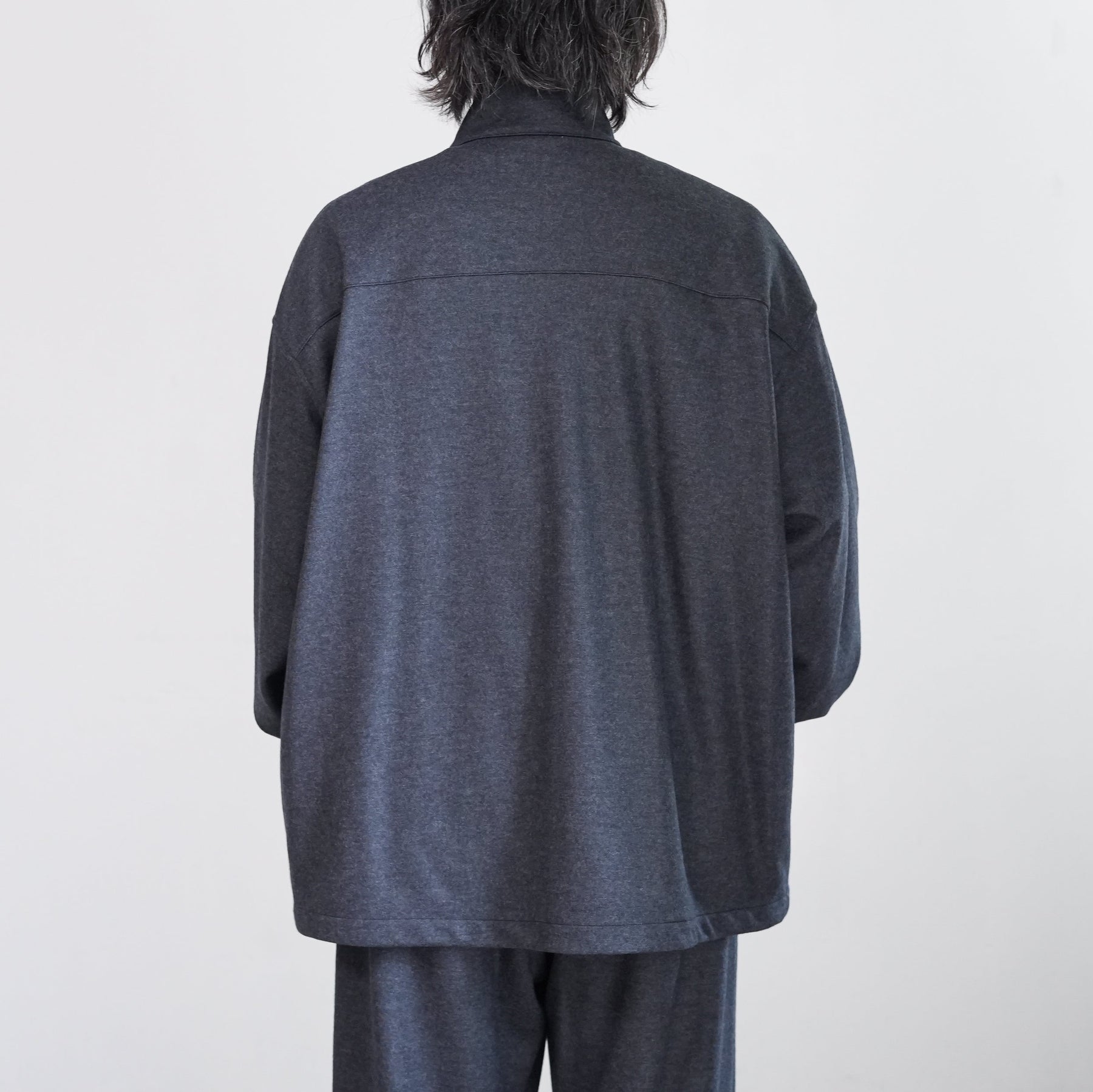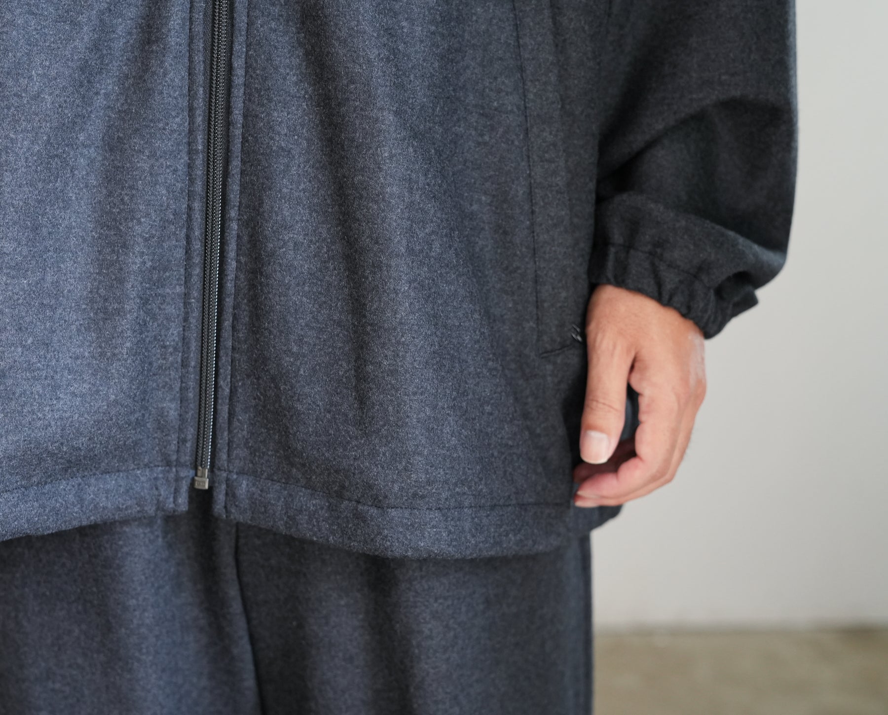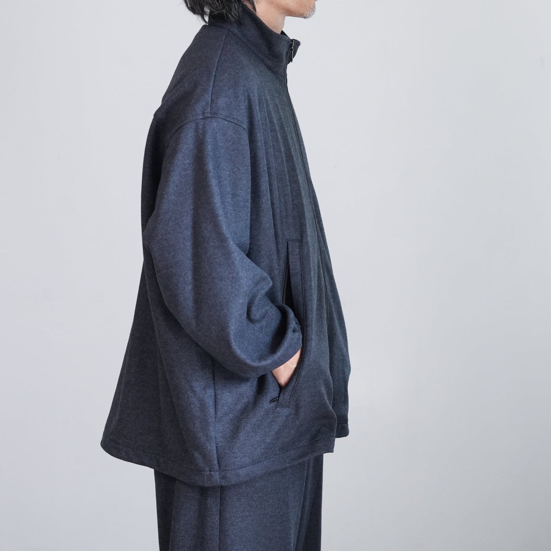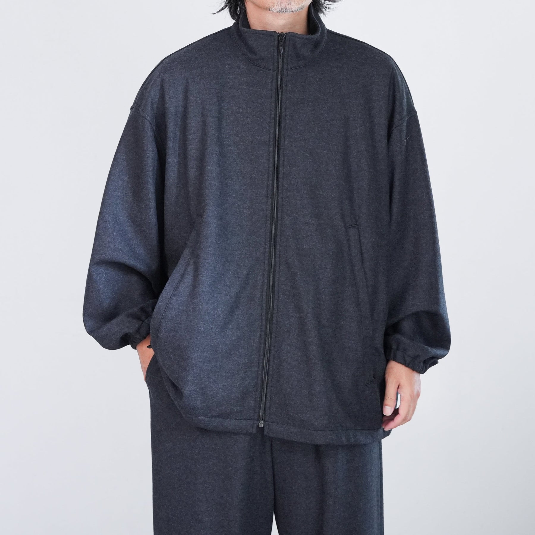 上質なウールで編み上げたスムースを高圧でミルド加工しフランネルのように仕上げた圧縮ウールスムース。ミルド加工と共にスケールオフ加工を行っており、ハンドウォッシャブル可能。ウールらしい上品な光沢感と圧縮することによって生まれるしっかりとしたハリ感、しなやかなドレープが特徴。冬に最適なウォーム感のあるトラックジャケットです。
