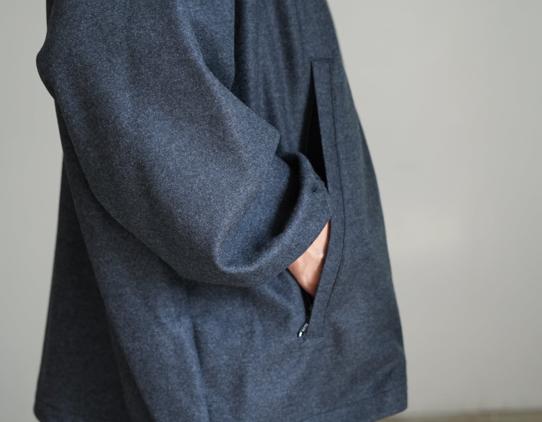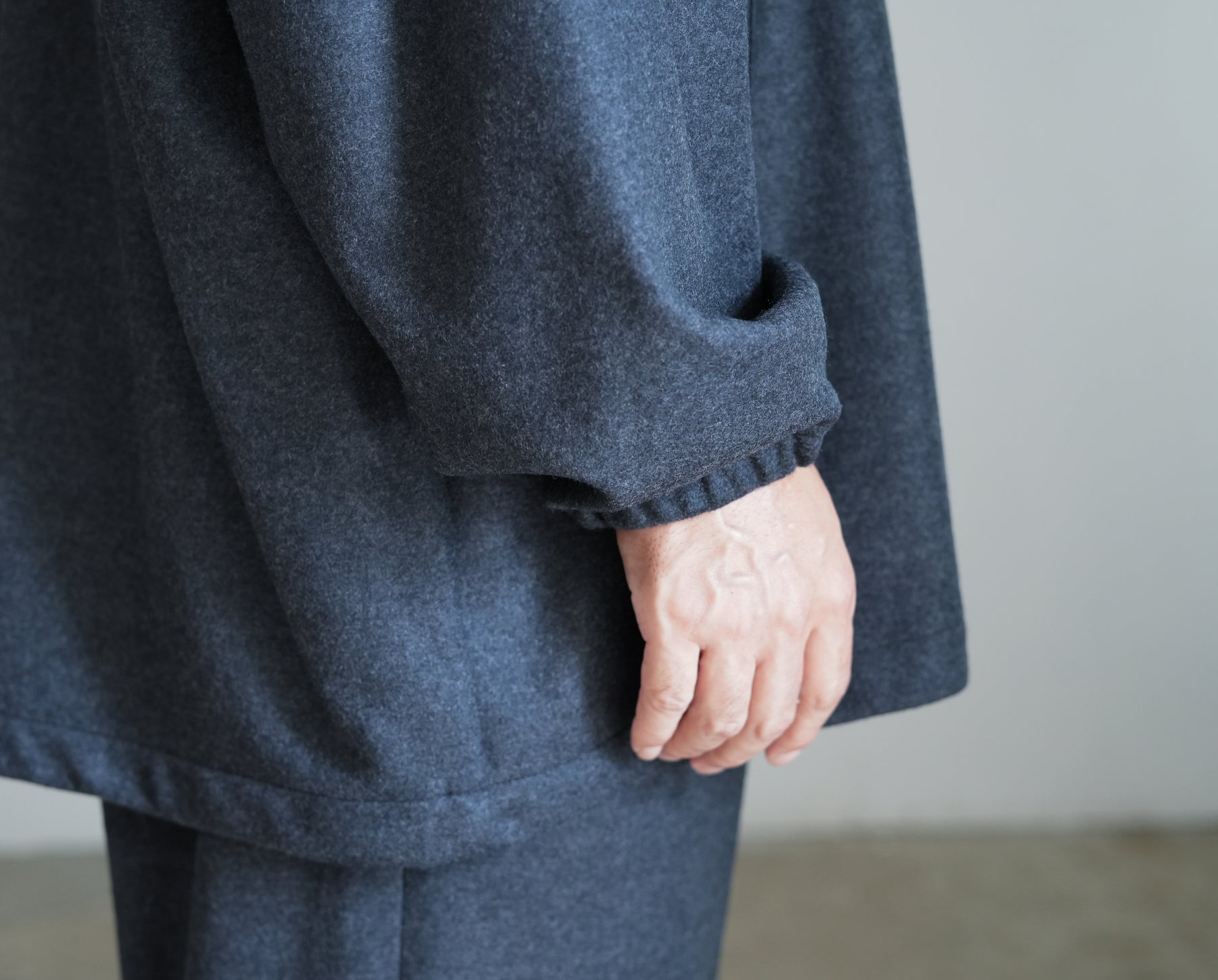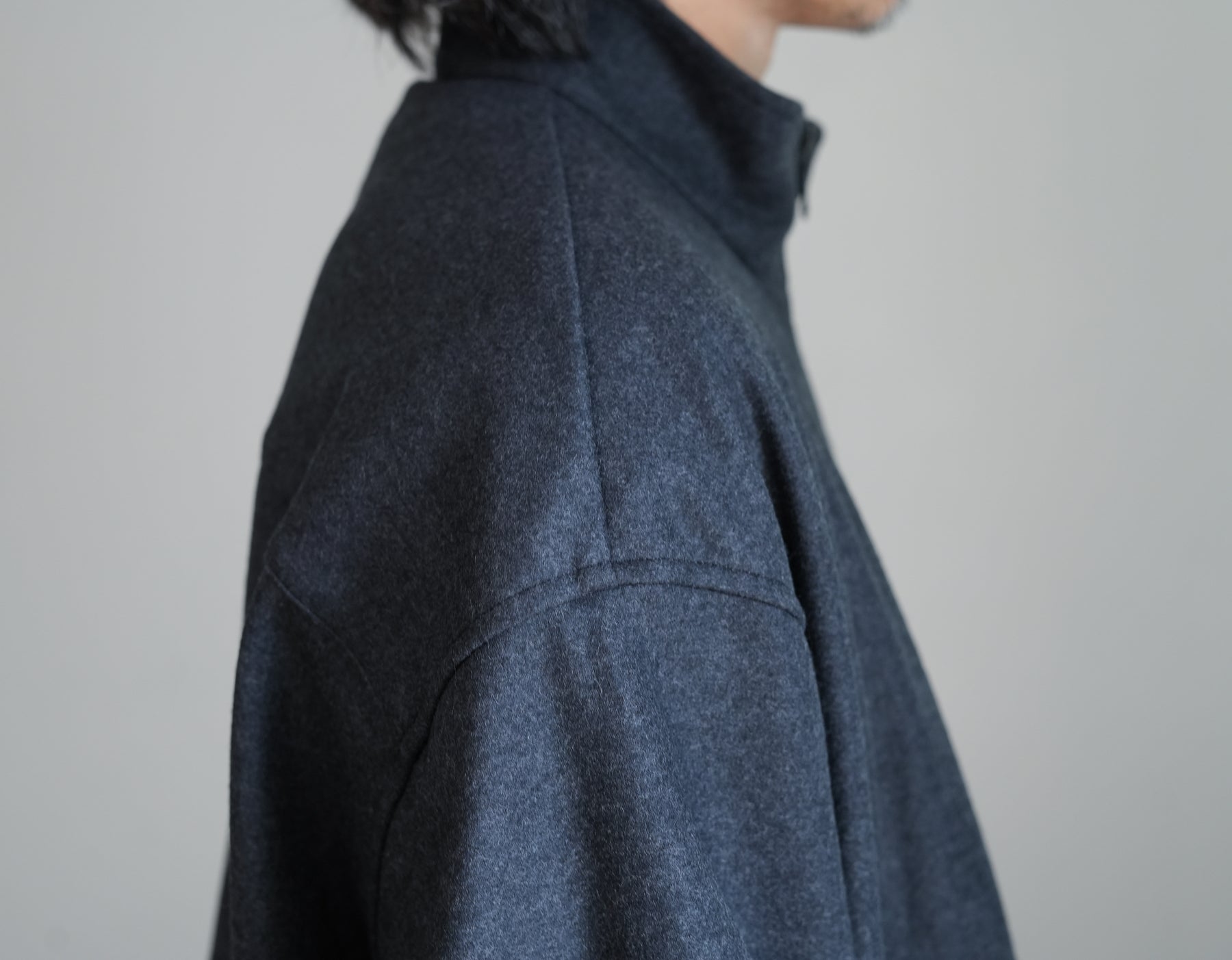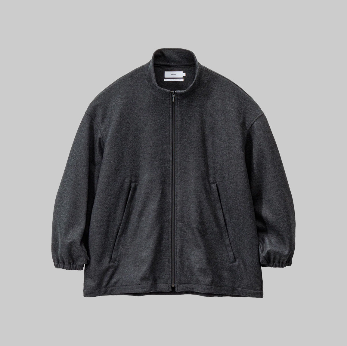 上質なウールで編み上げたスムースを高圧でミルド加工しフランネルのように仕上げた圧縮ウールスムース。ミルド加工と共にスケールオフ加工を行っており、ハンドウォッシャブル可能。ウールらしい上品な光沢感と圧縮することによって生まれるしっかりとしたハリ感、しなやかなドレープが特徴。冬に最適なウォーム感のあるトラックジャケットです。