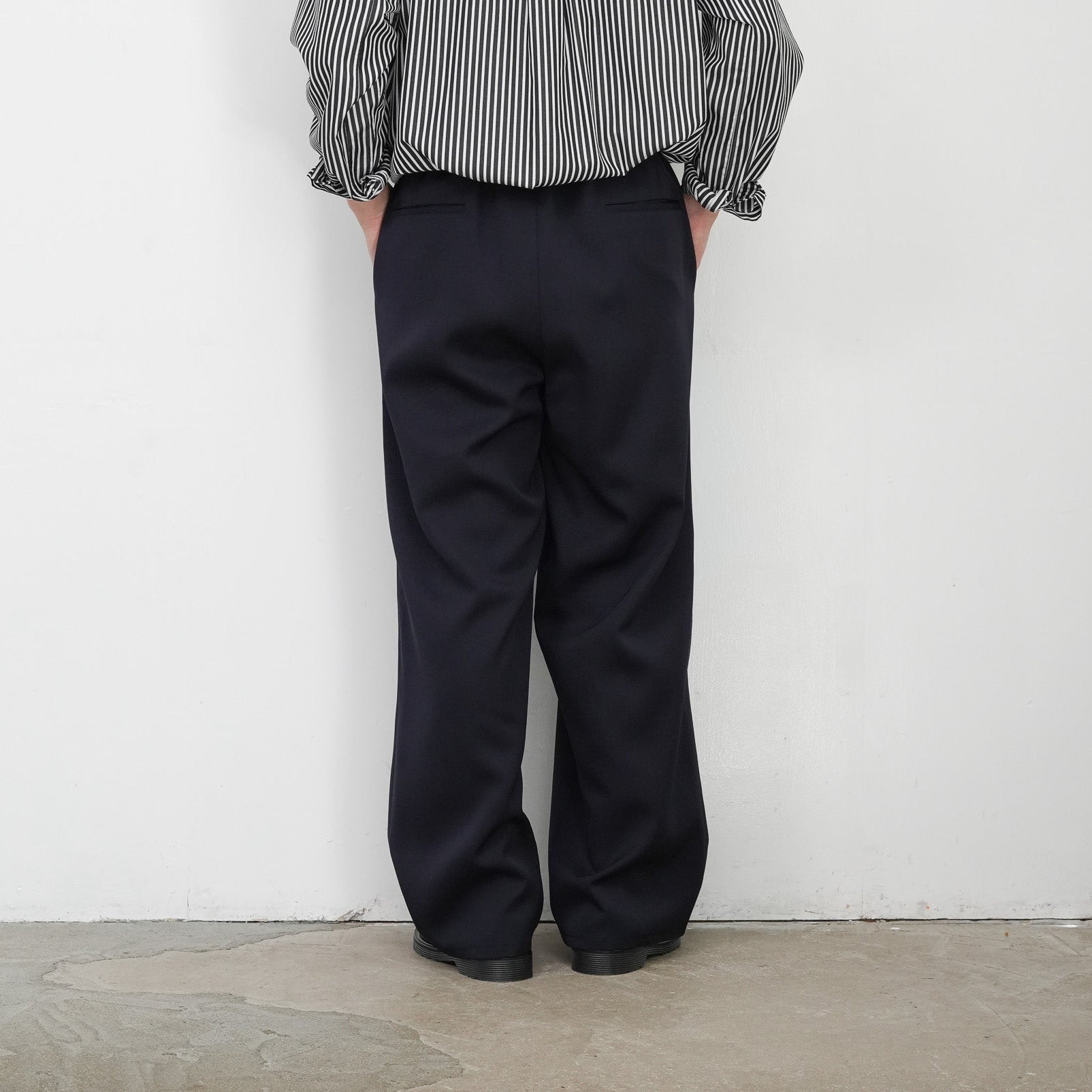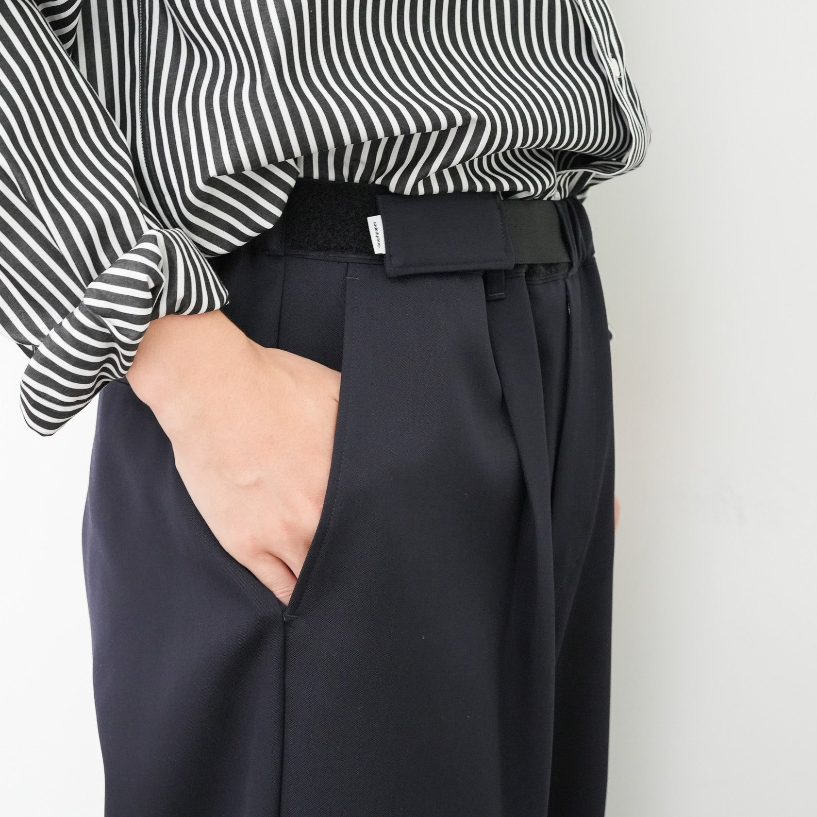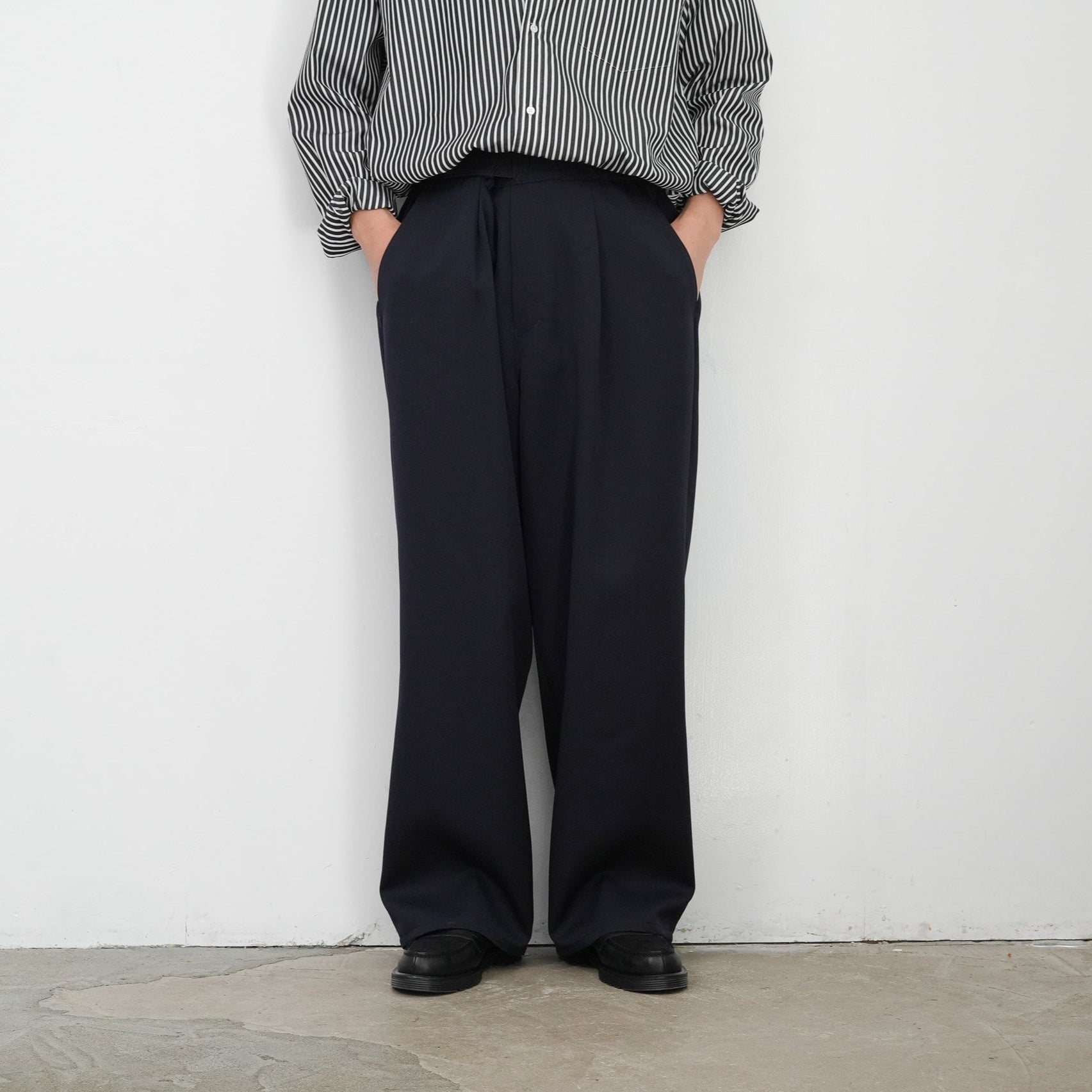 フランスのシェフパンツをべースにしたGraphpaper定番のボリュームのあるワイドパンツ。ウエストのサイズを簡単に調整できてシルエットもアレンジ可能です。縦糸と横糸のバランスに徹底的にこだわり製作したウールギャバジン素材。美しい綾目と程良いハリ感、しなやかなドレープ感が特徴です。特殊な樹脂をウール繊維の内部まで染み込ませることでフィラメントのような光沢とクリアな質感に仕上げています。