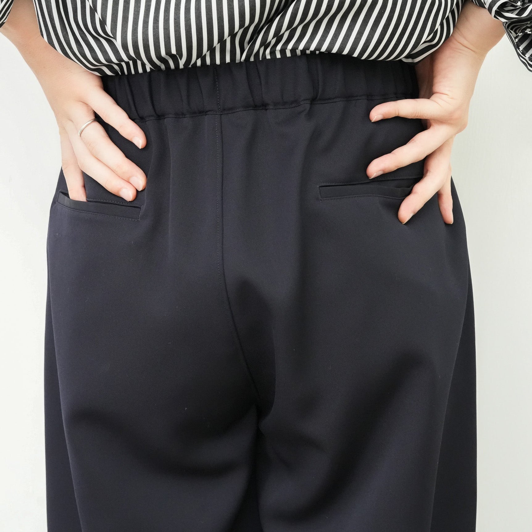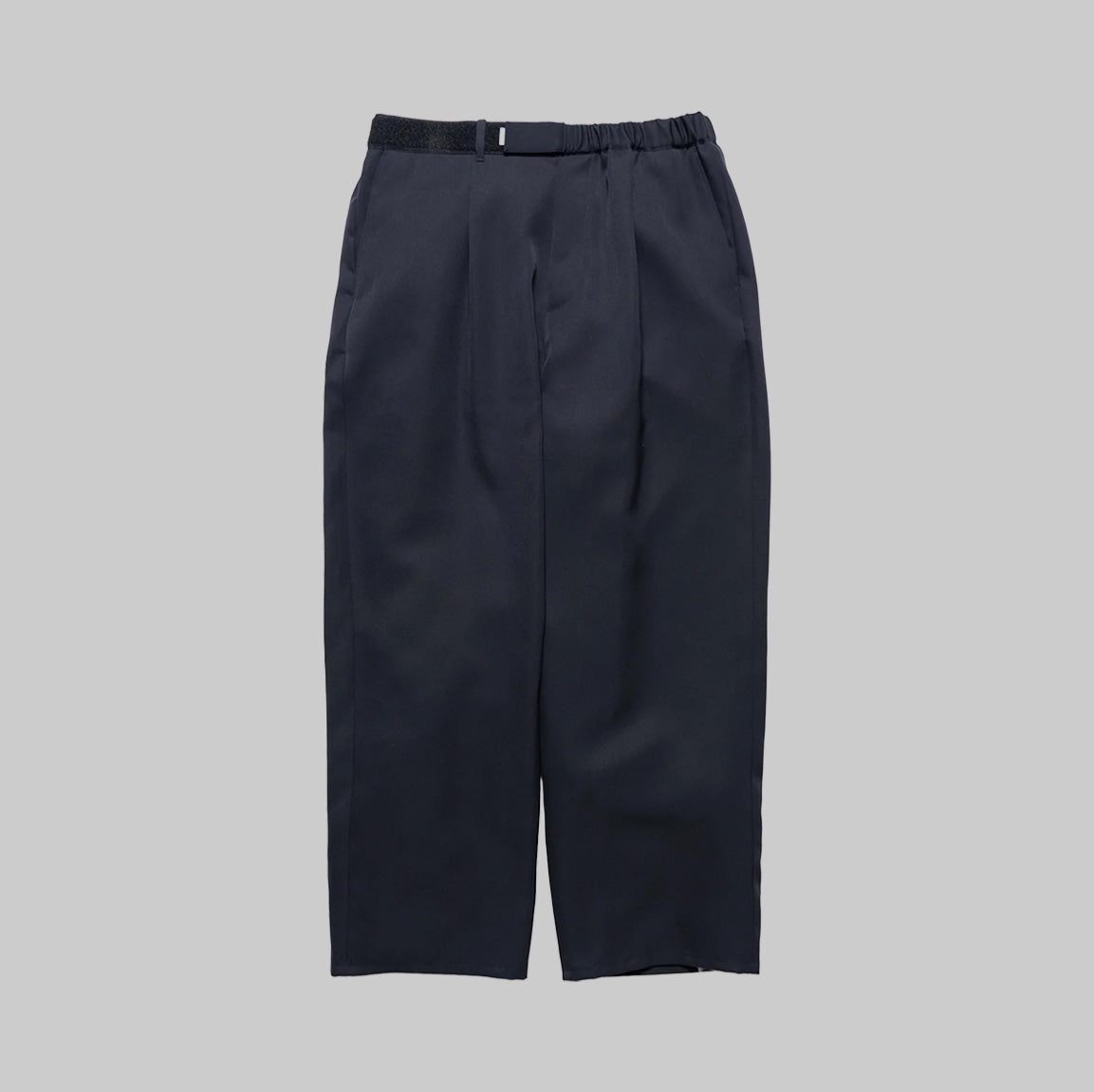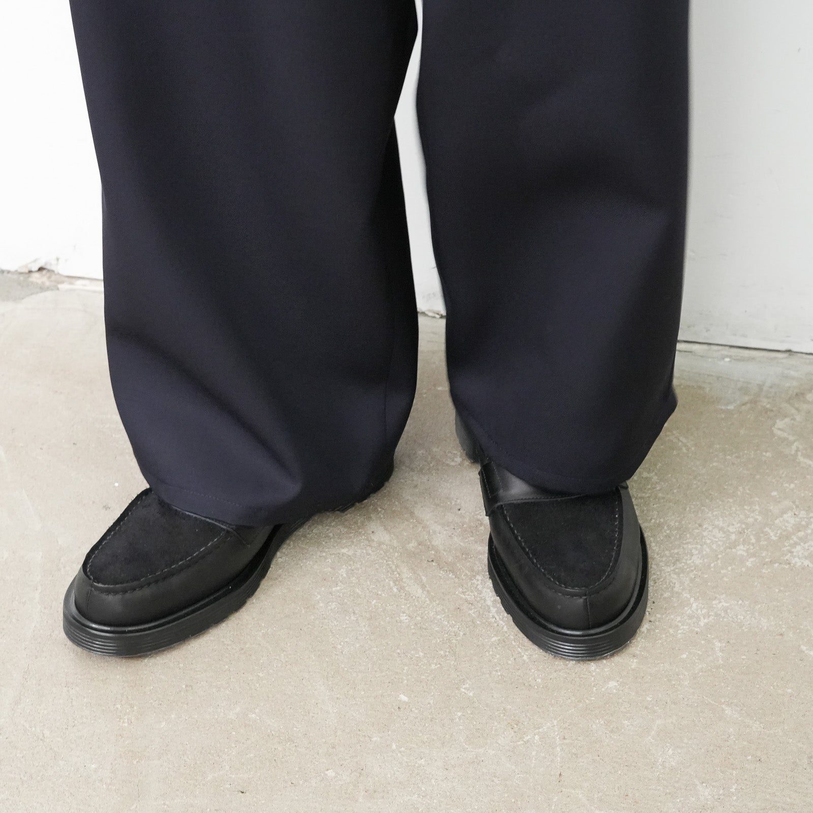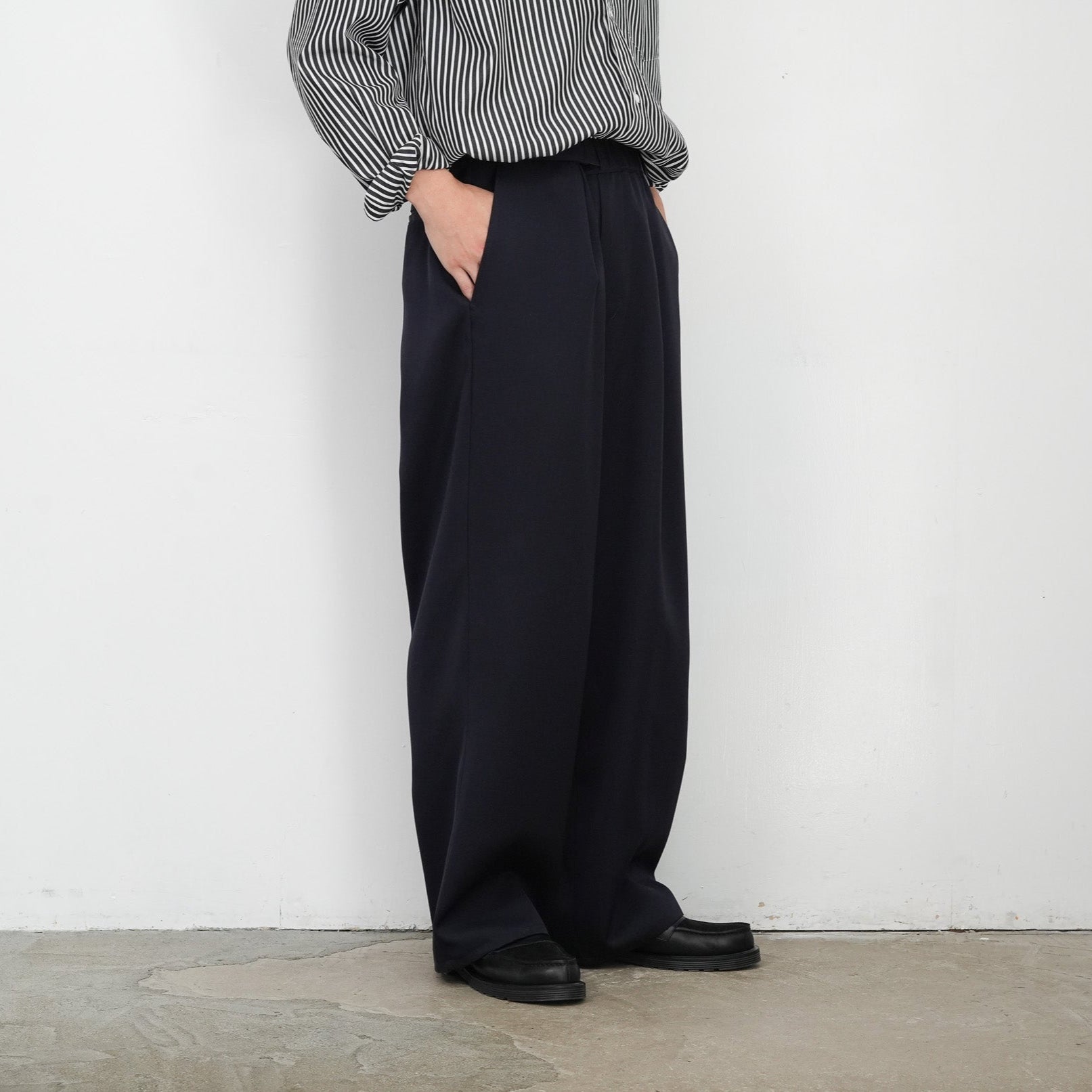 フランスのシェフパンツをべースにしたGraphpaper定番のボリュームのあるワイドパンツ。ウエストのサイズを簡単に調整できてシルエットもアレンジ可能です。縦糸と横糸のバランスに徹底的にこだわり製作したウールギャバジン素材。美しい綾目と程良いハリ感、しなやかなドレープ感が特徴です。特殊な樹脂をウール繊維の内部まで染み込ませることでフィラメントのような光沢とクリアな質感に仕上げています。