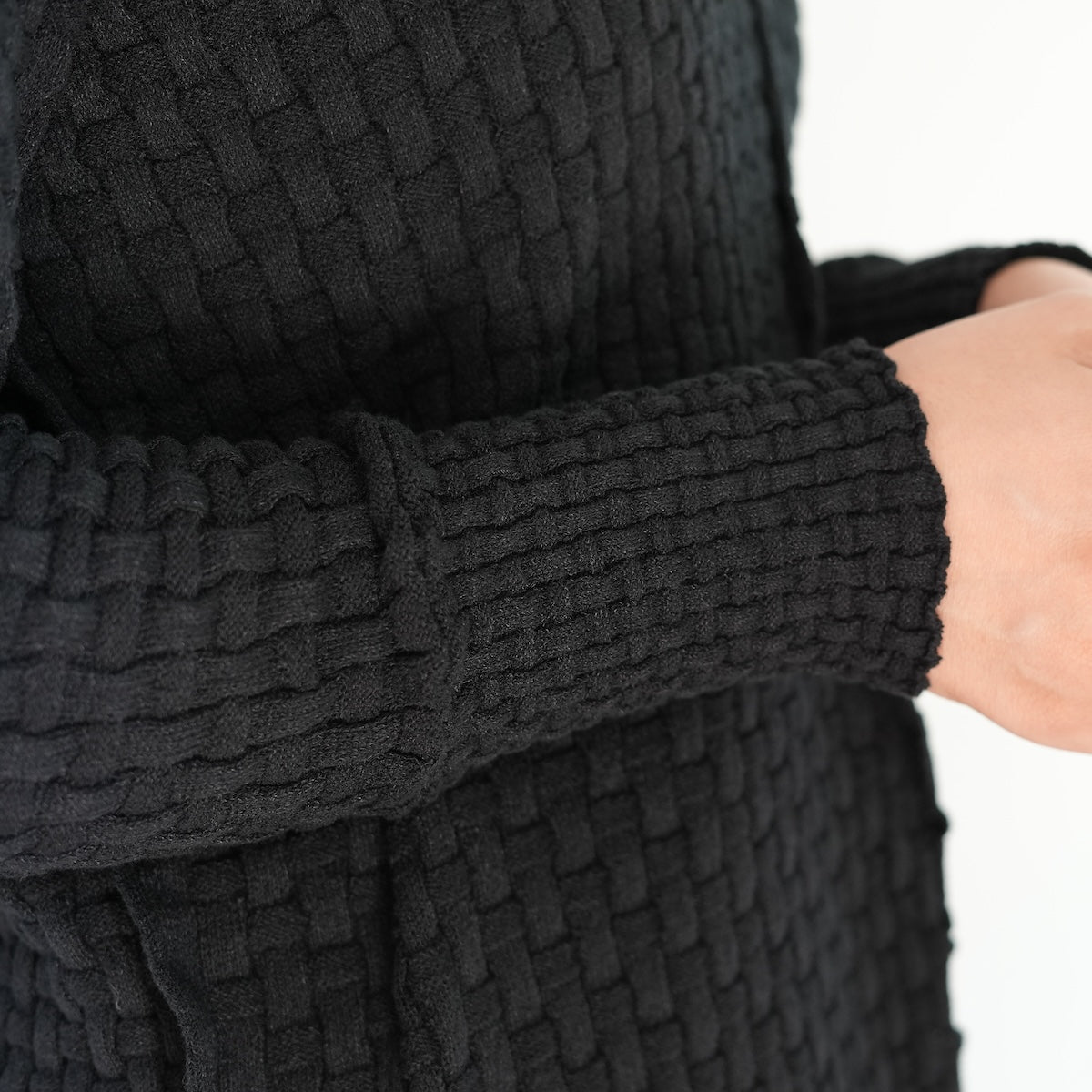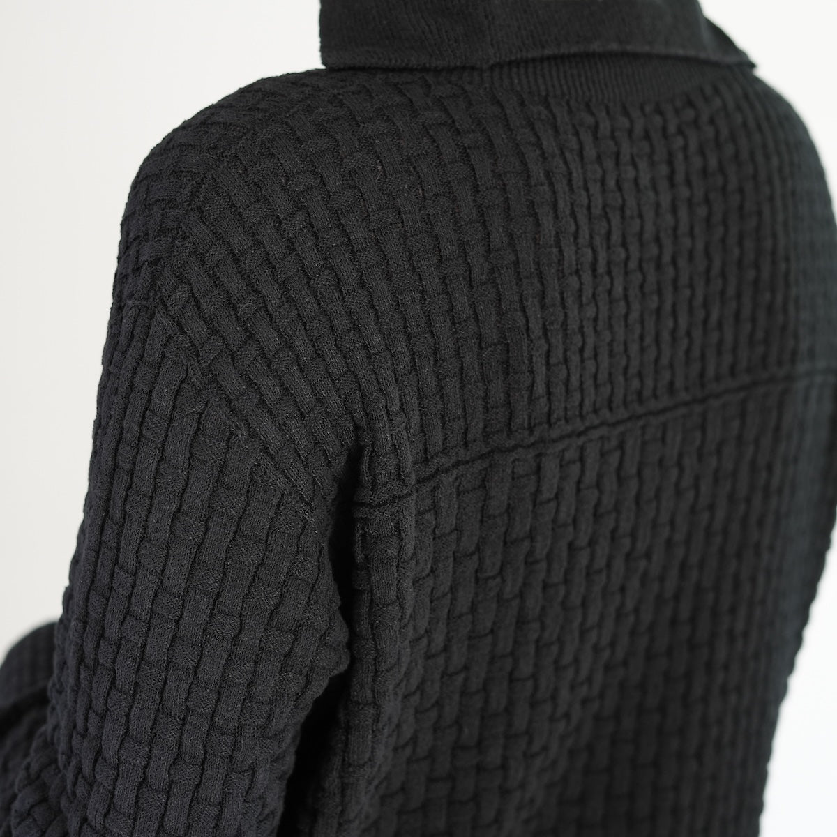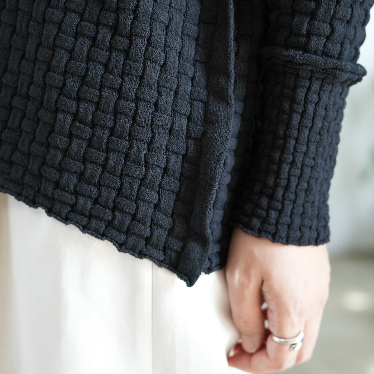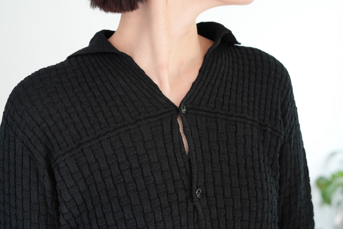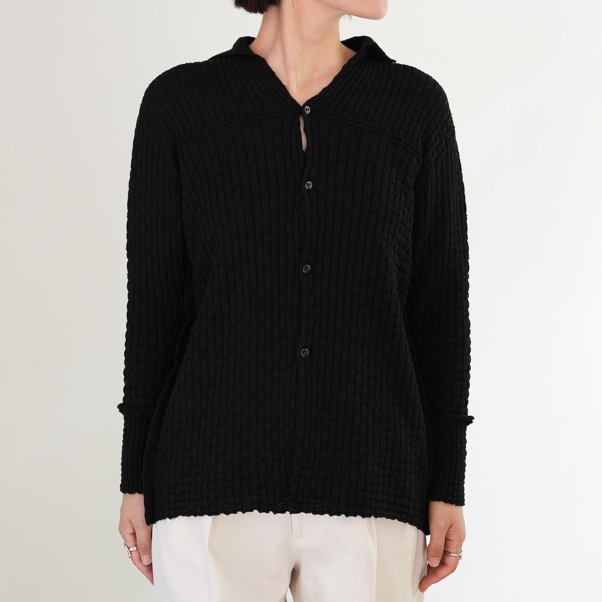 籠模様をイメージした立体的な編み柄をホールガーメント機で編み立てたニットシャツ。