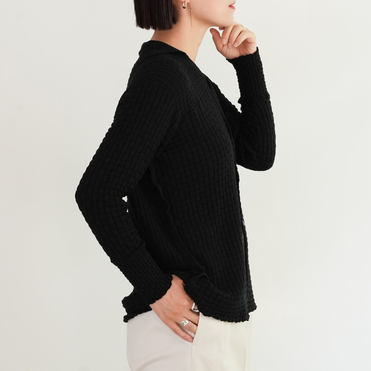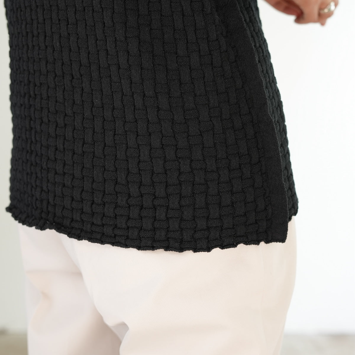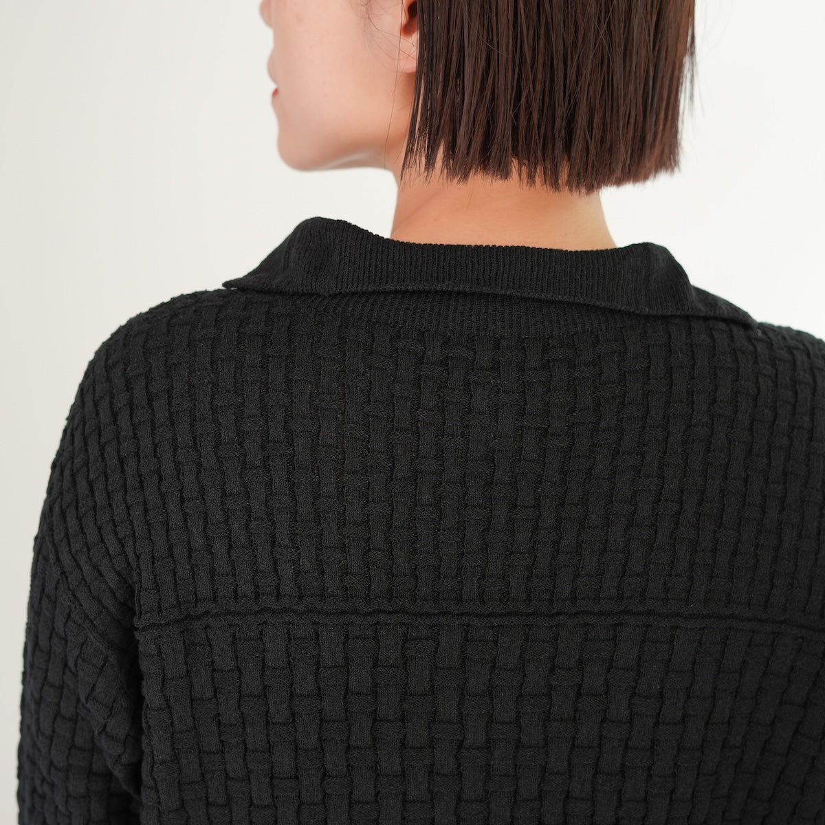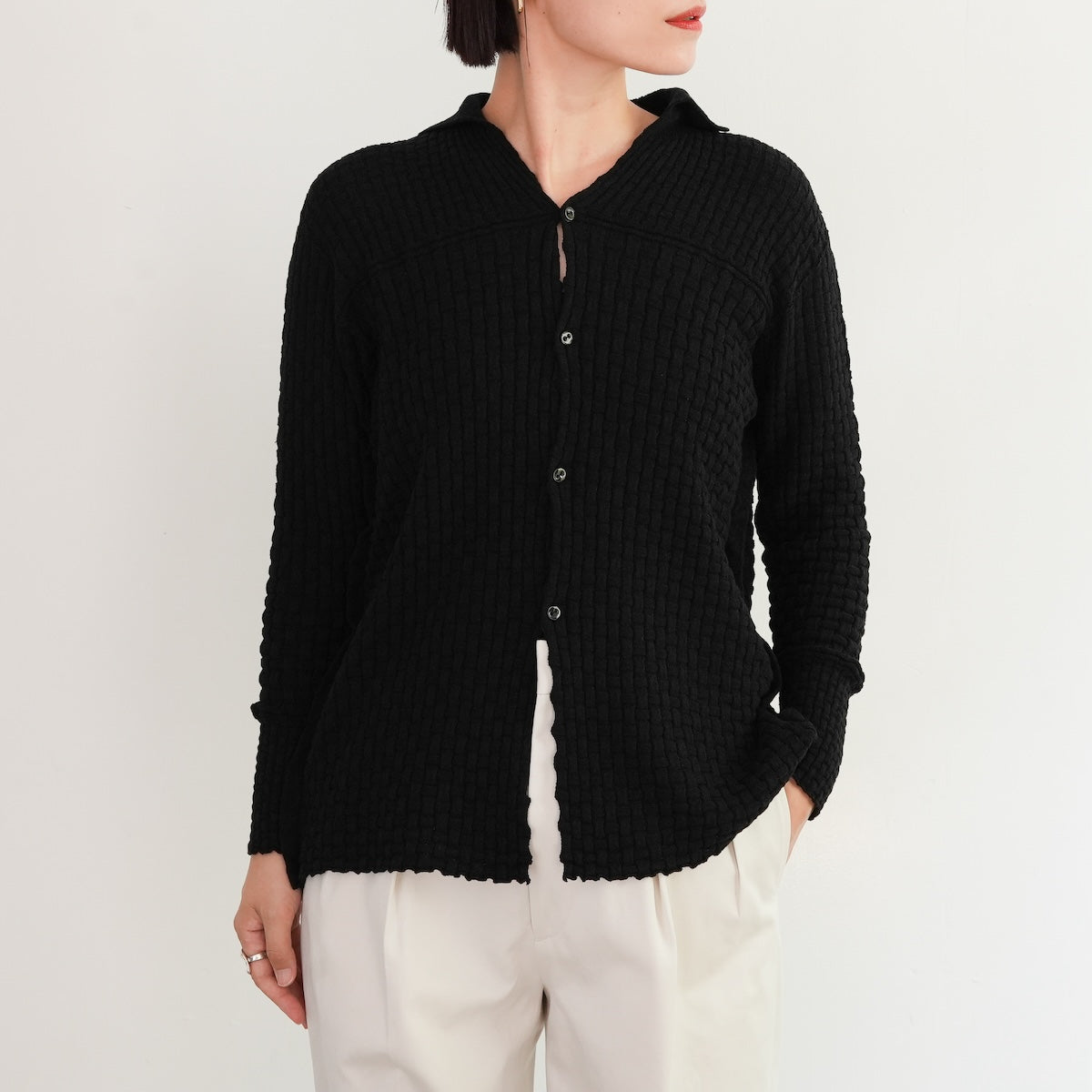 籠模様をイメージした立体的な編み柄をホールガーメント機で編み立てたニットシャツ。