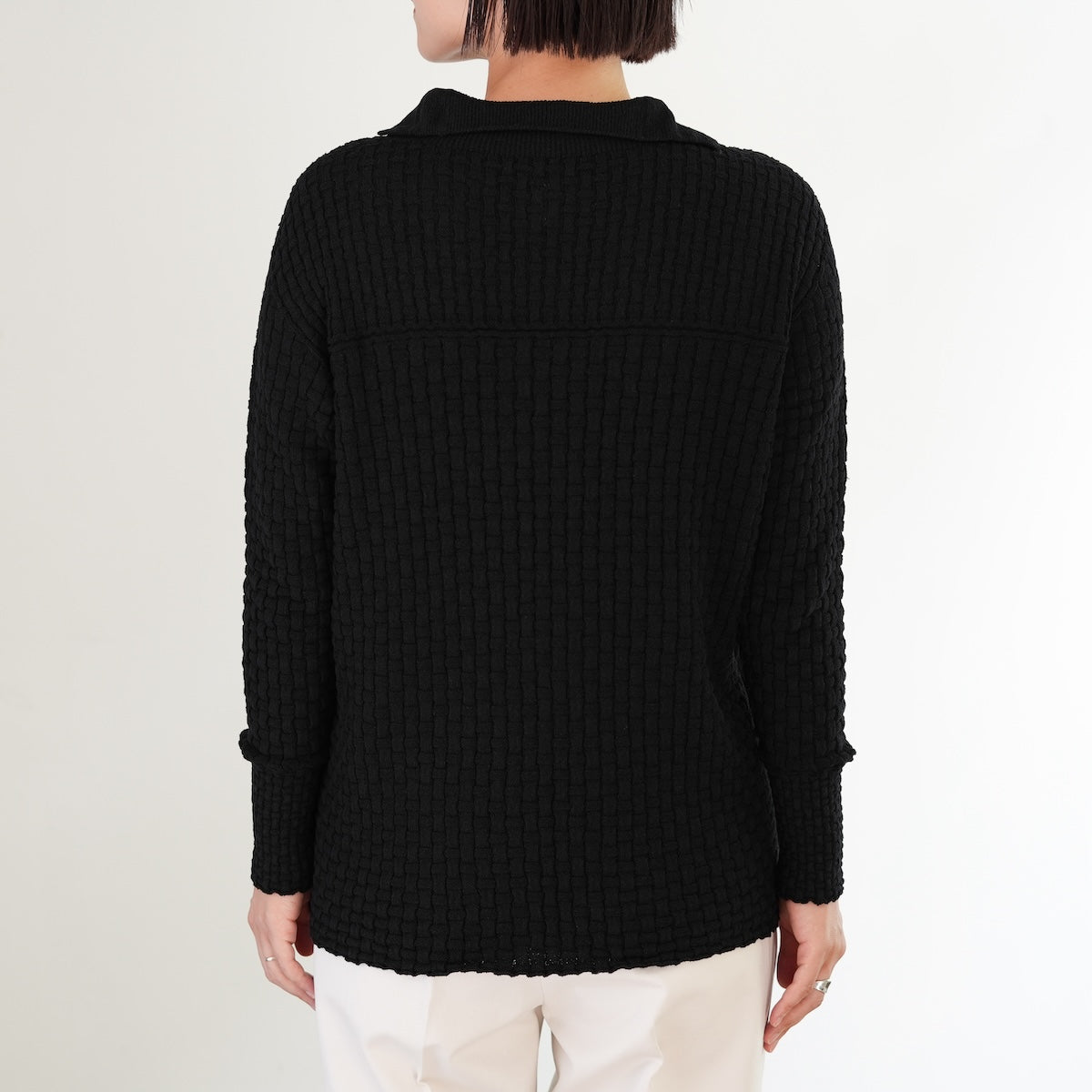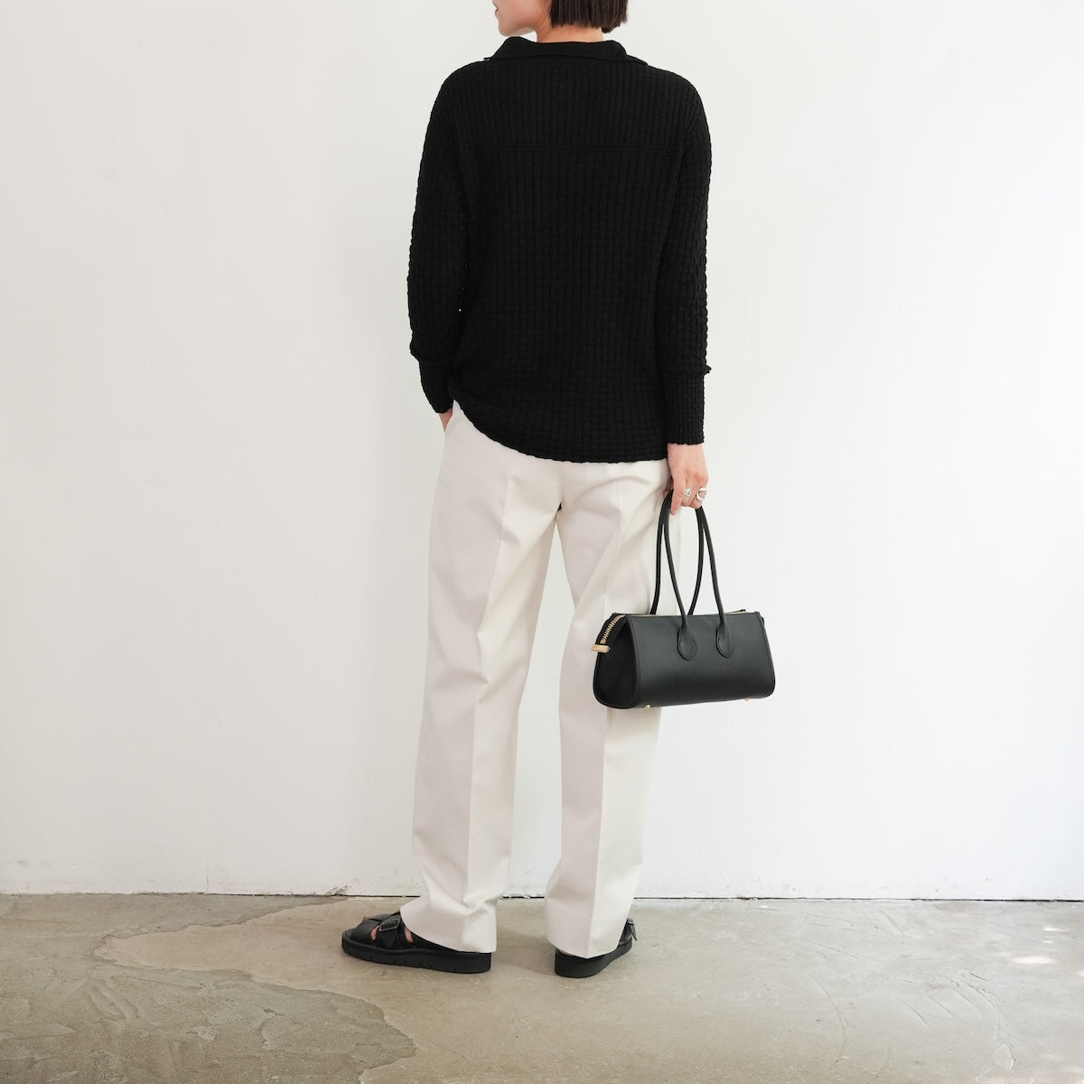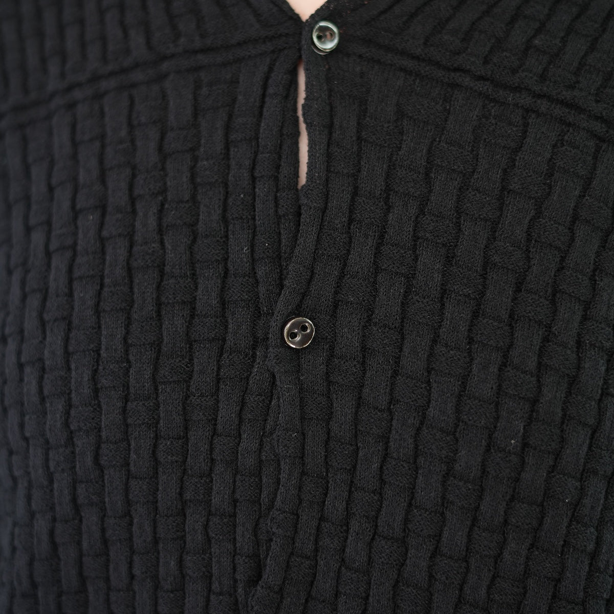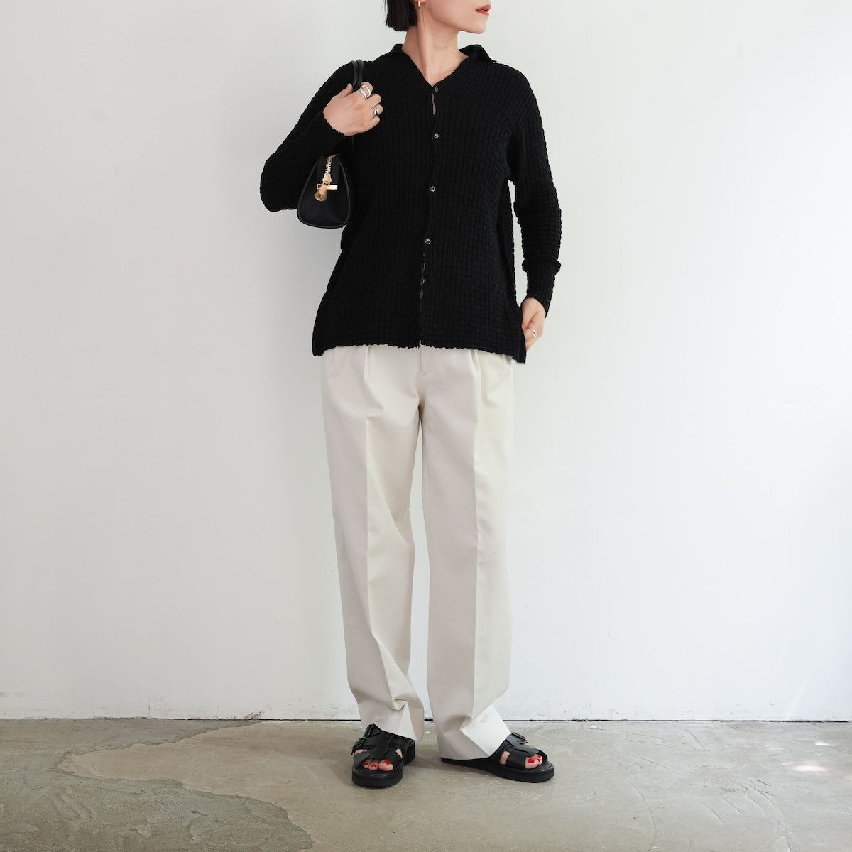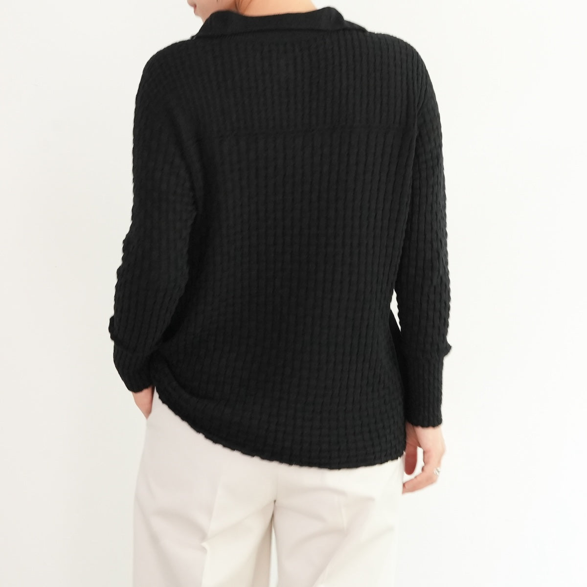 籠模様をイメージした立体的な編み柄をホールガーメント機で編み立てたニットシャツ。