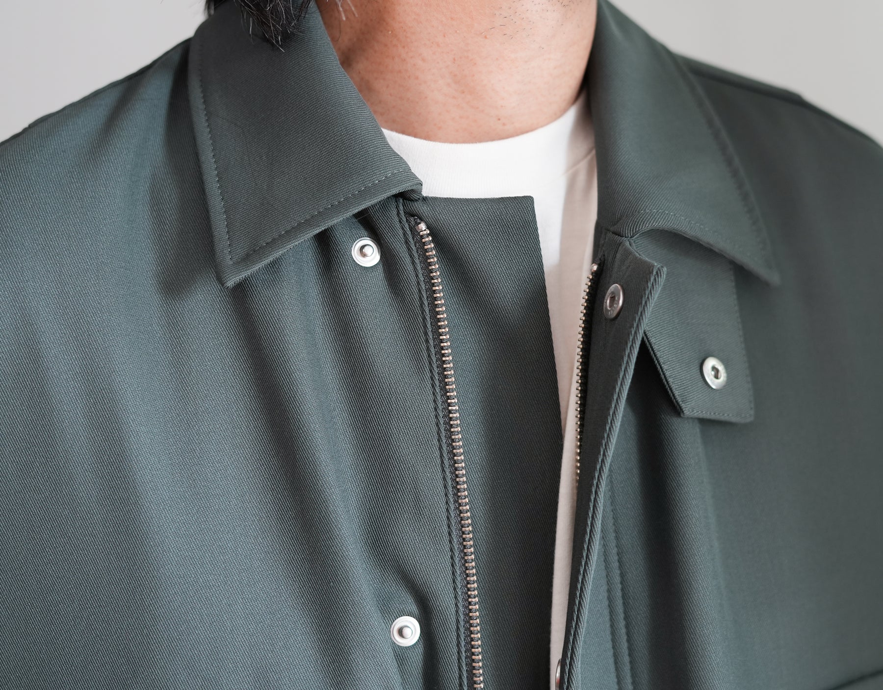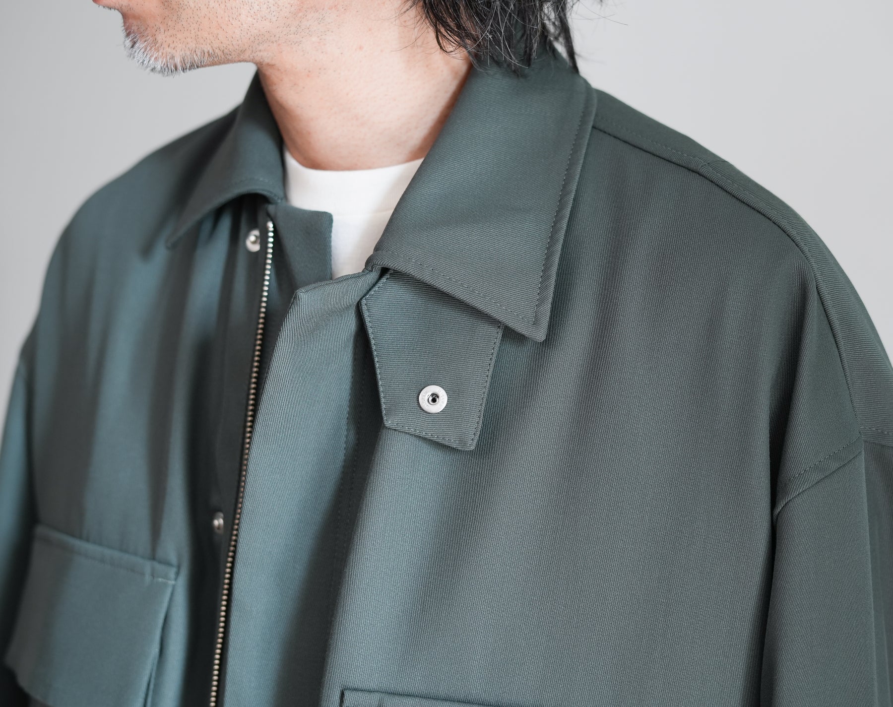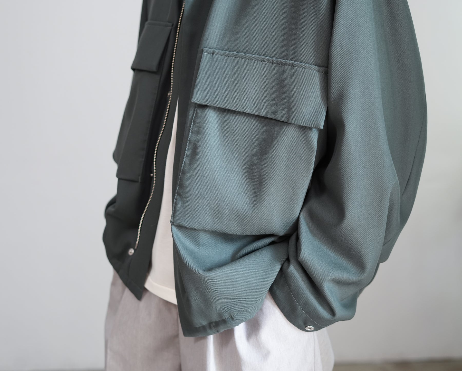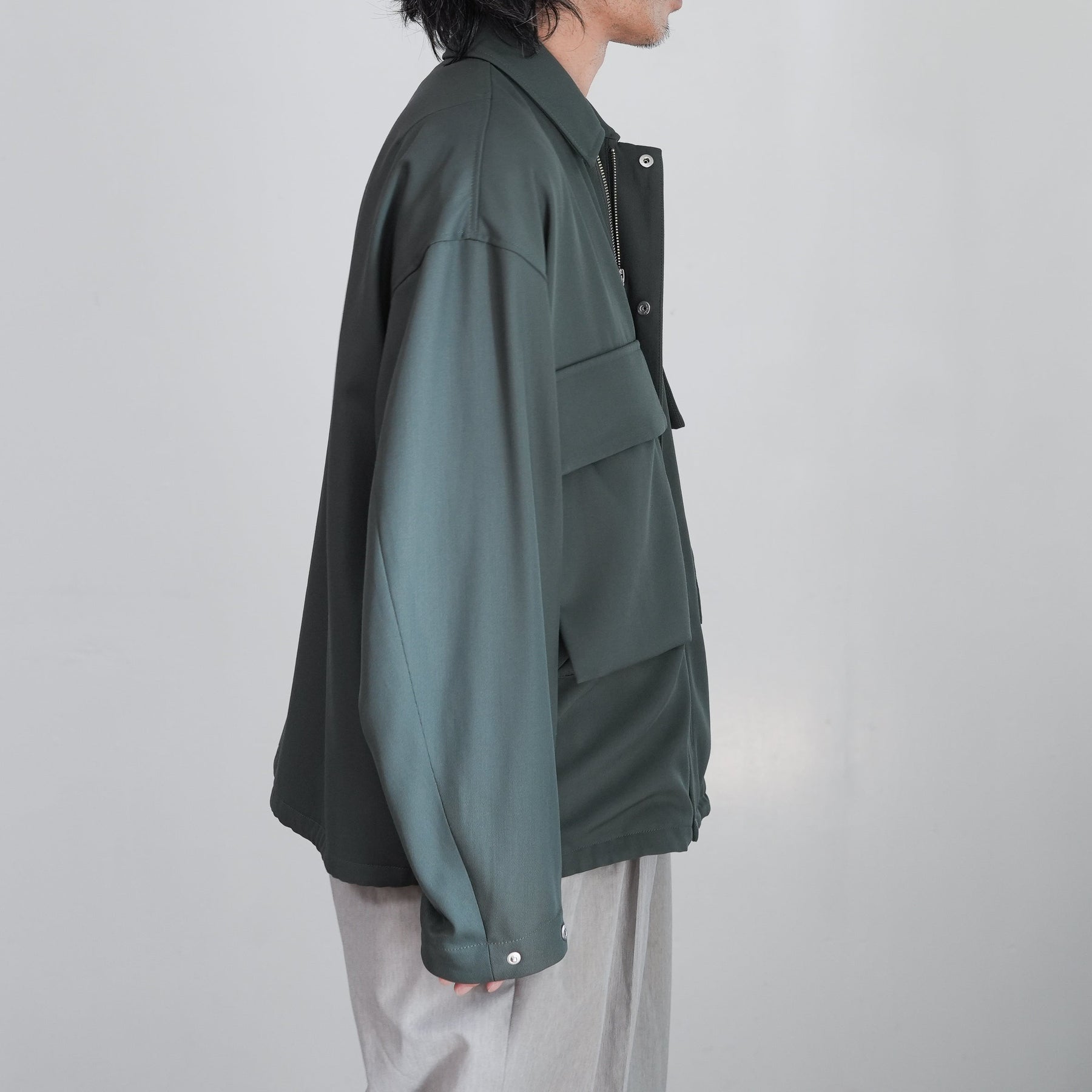 USフィールドブルゾンをベースにした両胸のパッチポケットが印象的なジャケット。ウール本来の風合いと、ナイロンの形態安定性・耐久性を両立させたハイブリッドギャバジンを使用。チンフラップ付きで、衿を立てることで表情に変化を加えられる、機能性とデザイン性を兼ね備えた一着です。