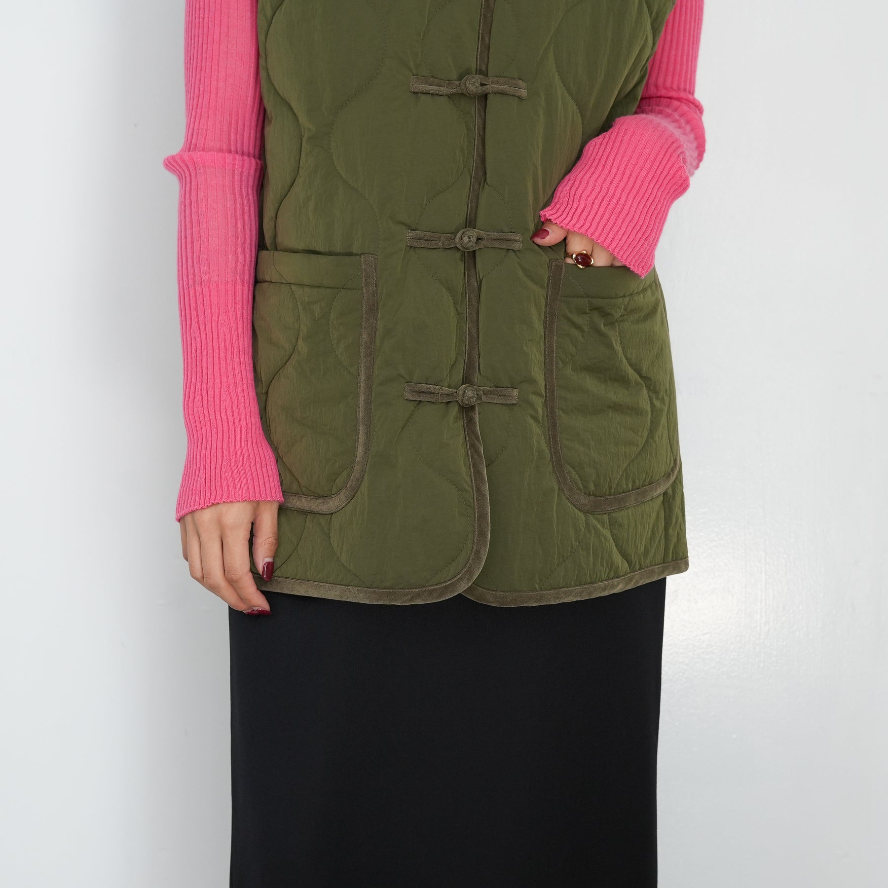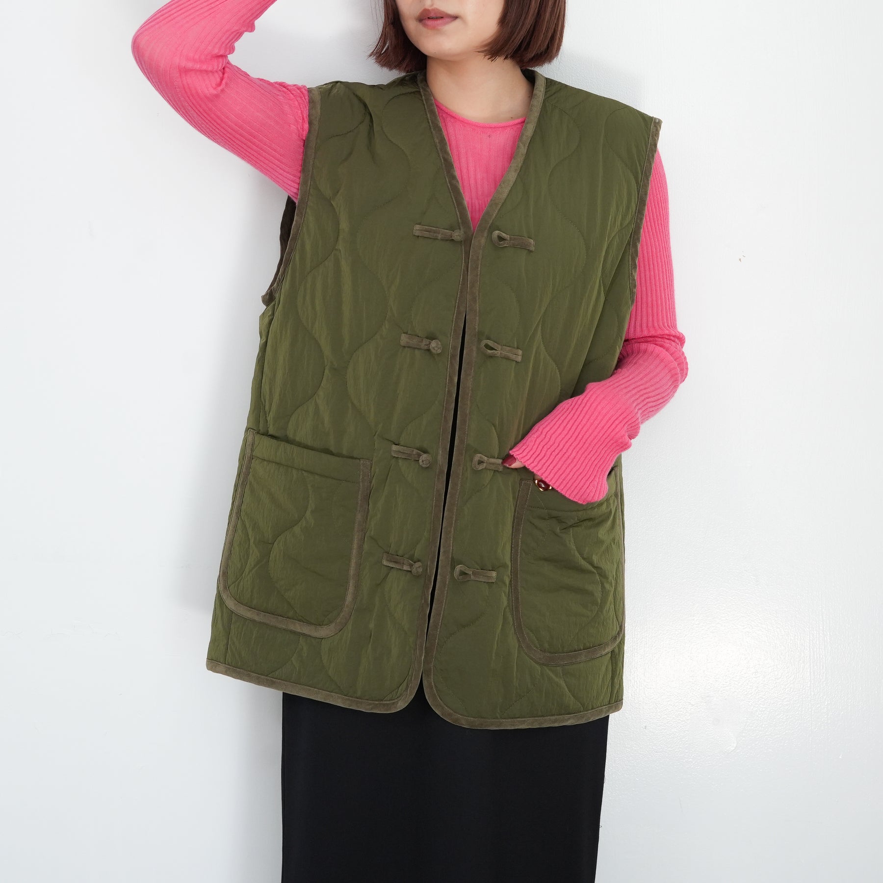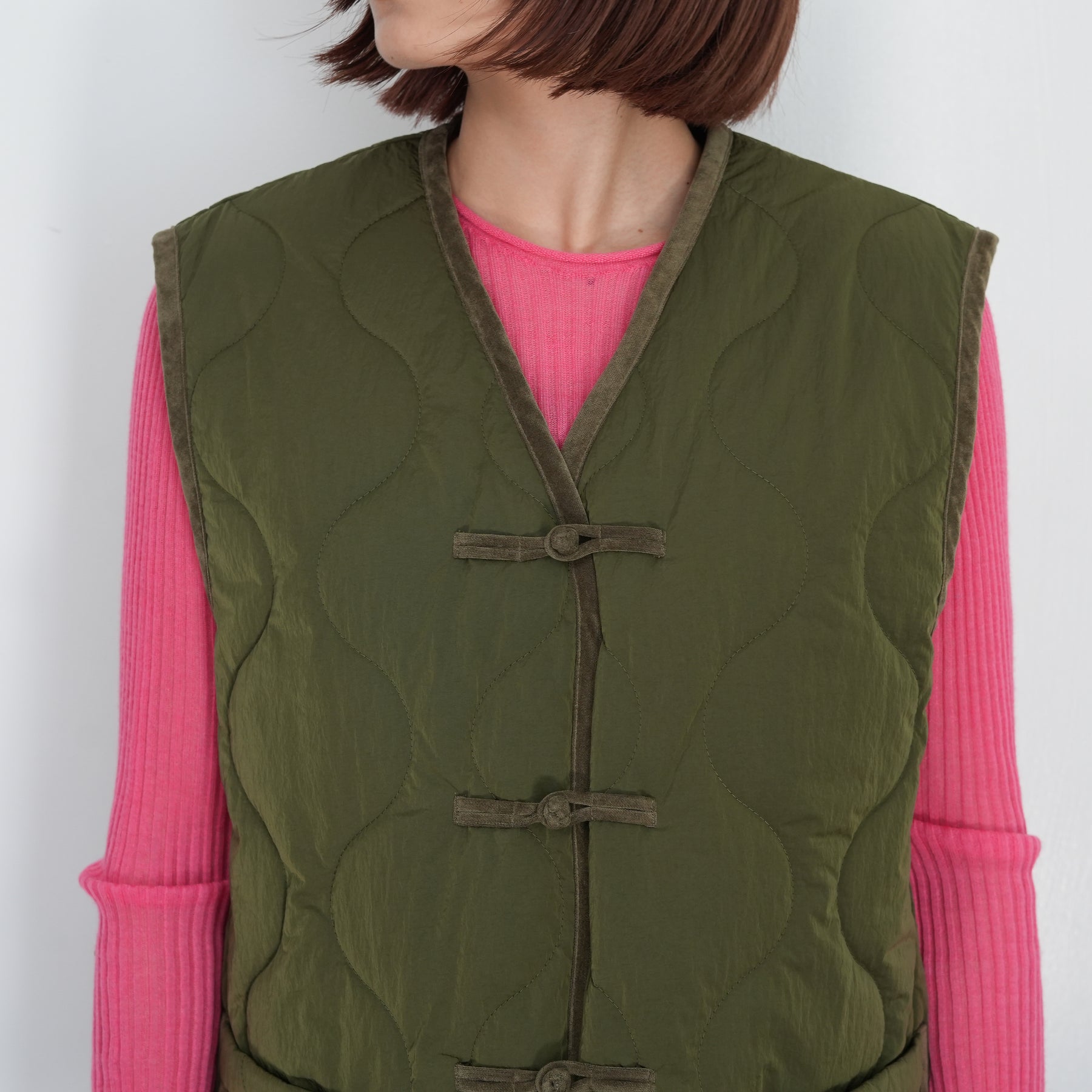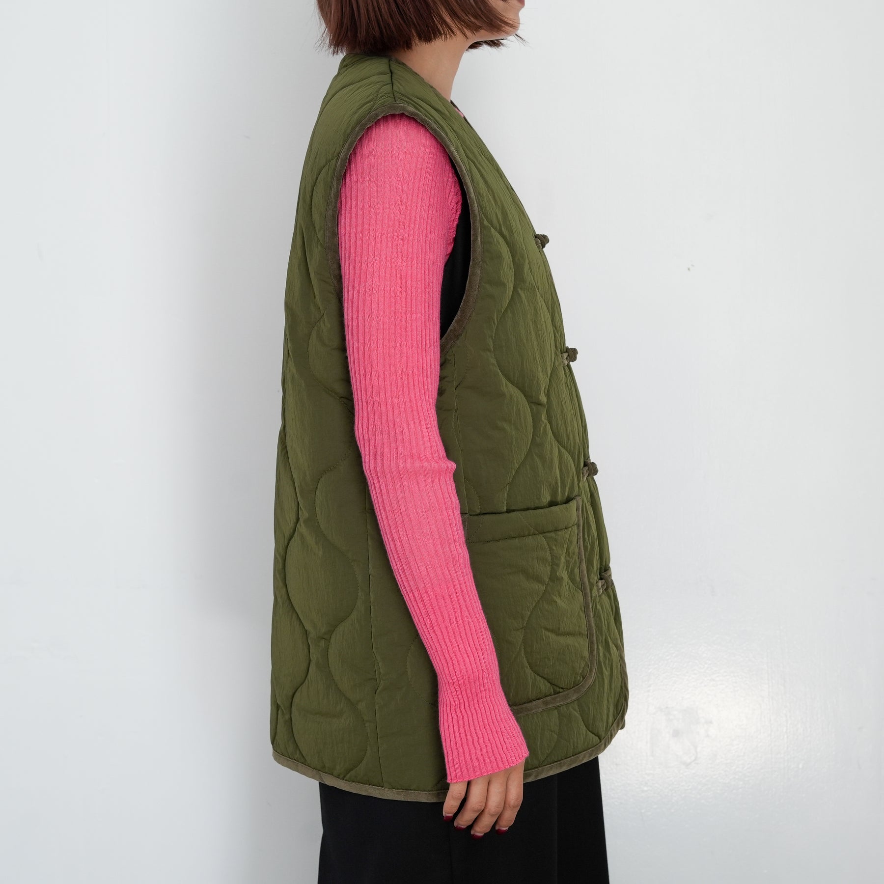 チャイナボタンをポイントにしたキルティングベストです。