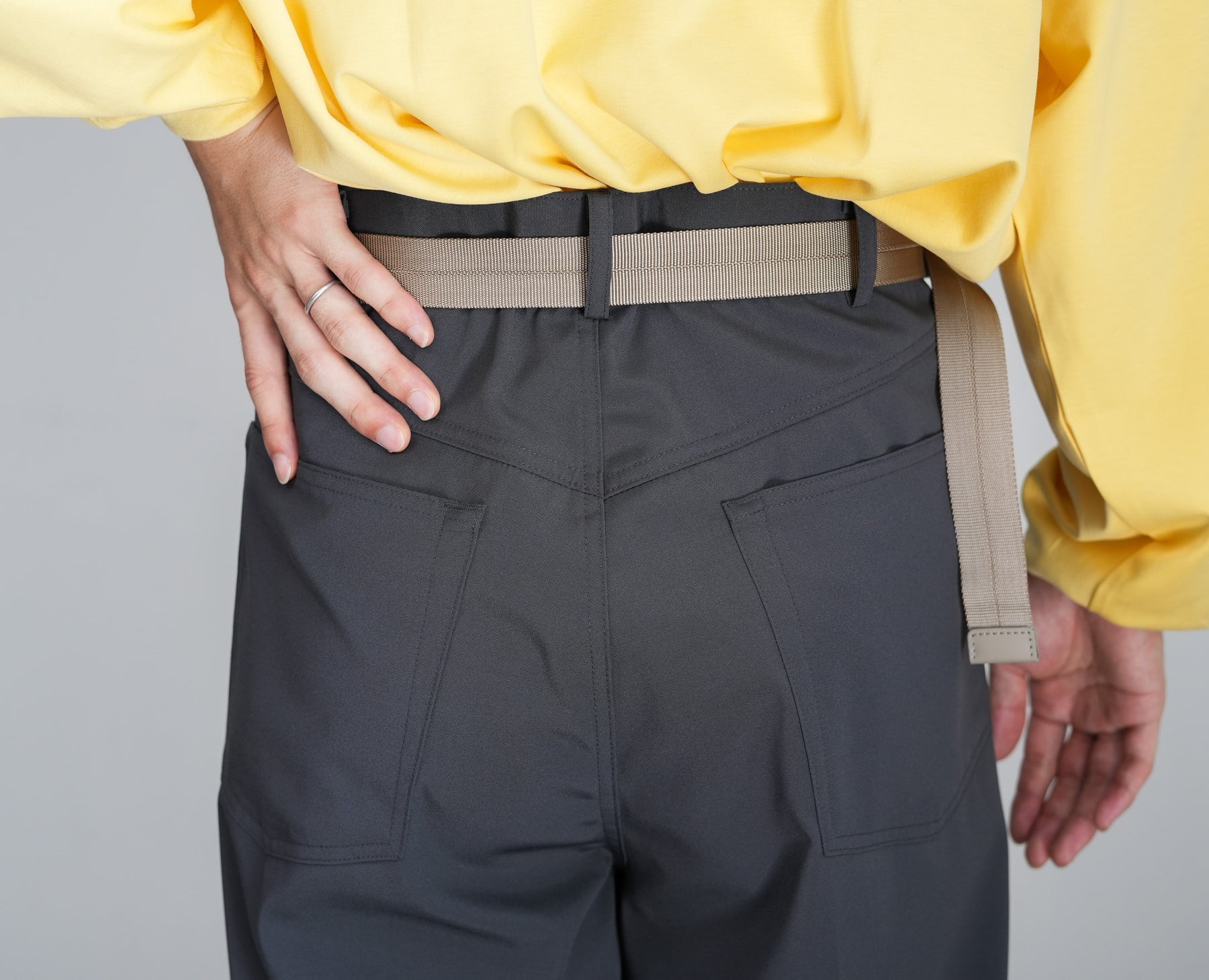 縦糸にはリサイクルのポリエステルフィラメント、横糸にはビスコースの混紡糸を高密度に打ち込んだオックスフォード素材。形態安定性に優れ、センタークリースが映えるスラックスのようなスタイル。反発感があり、シワになりづらい辛いゆったりとしたストレートシルエットのトラウザー。