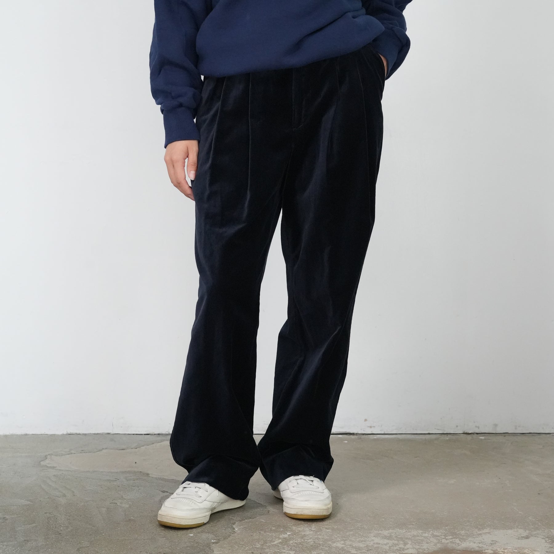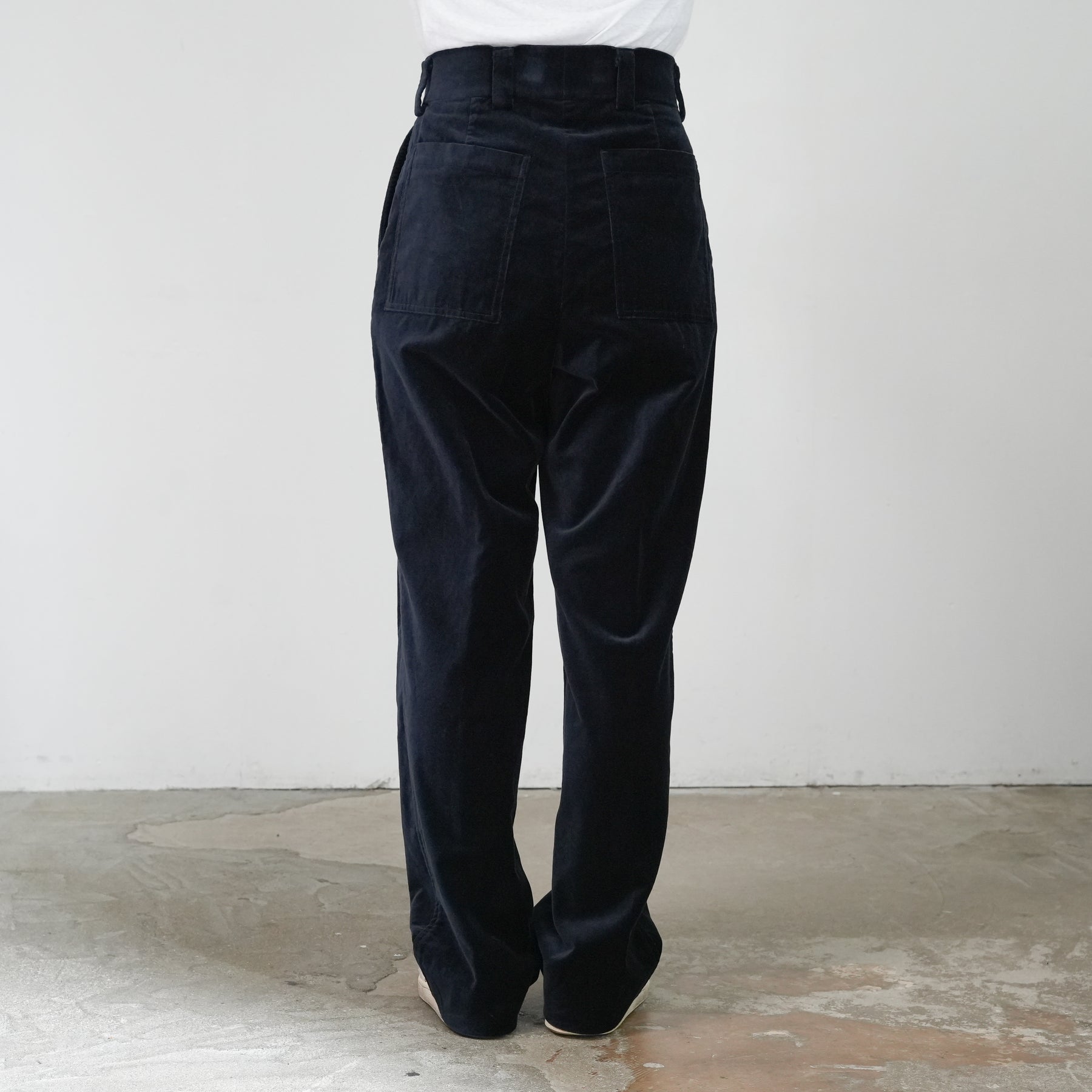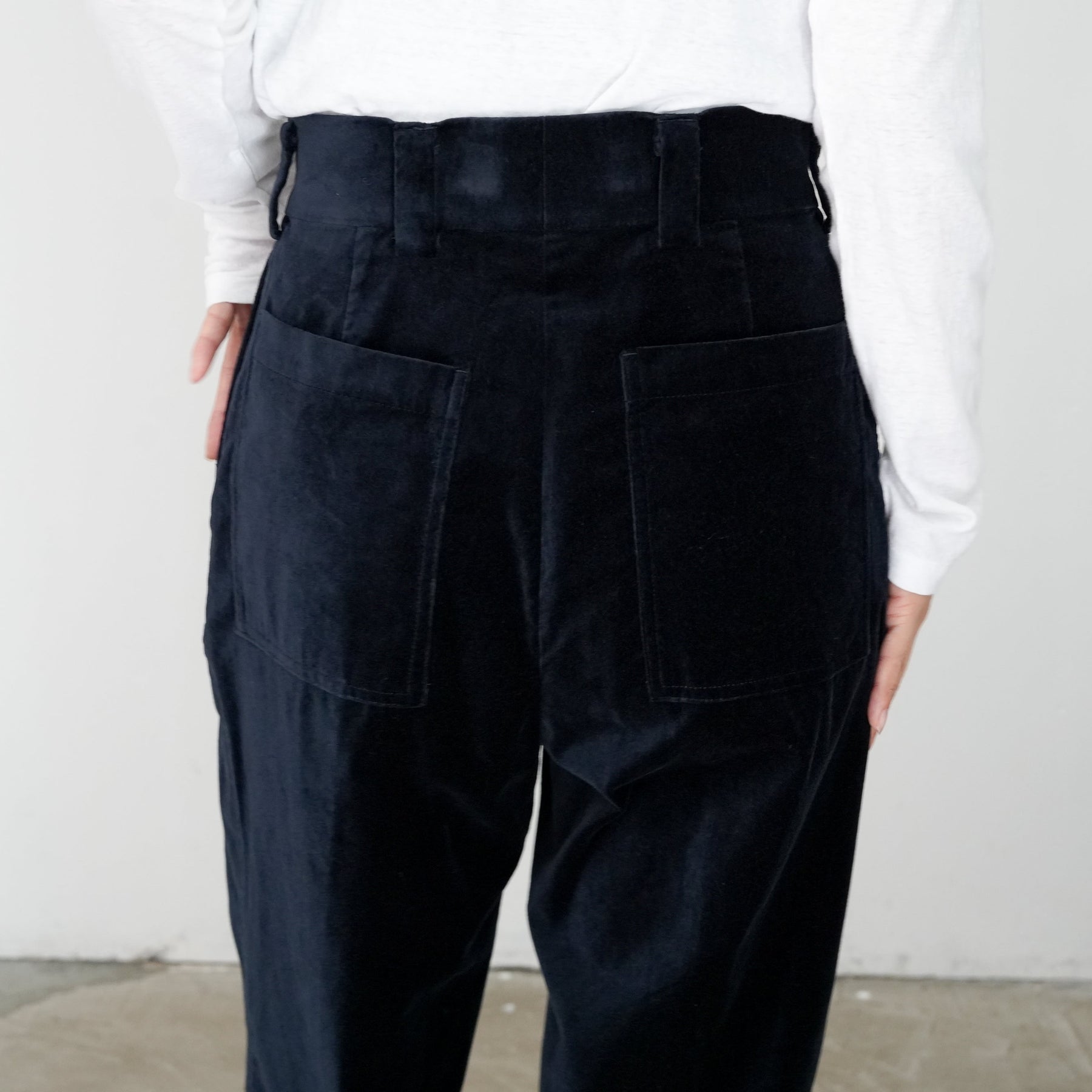 定番のトムボーイパンツをベルベット生地でアップデート。