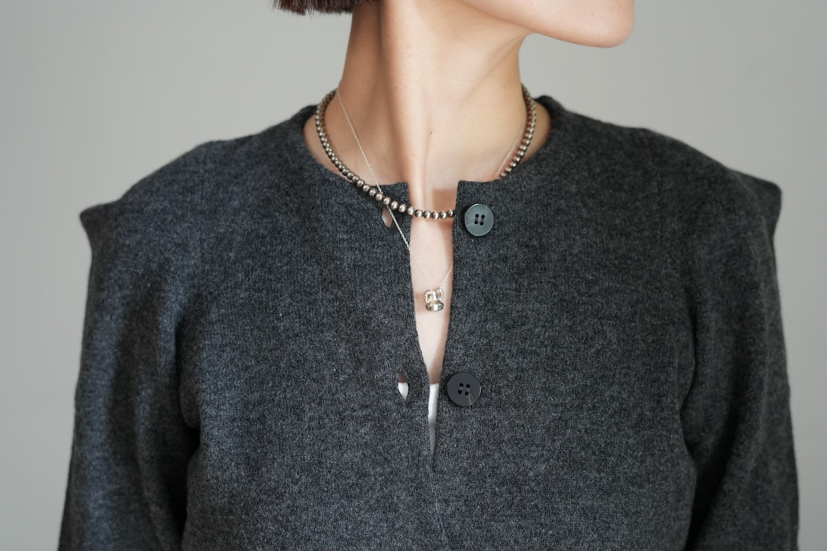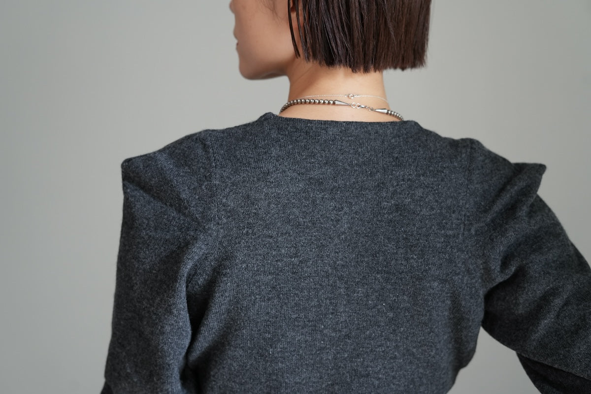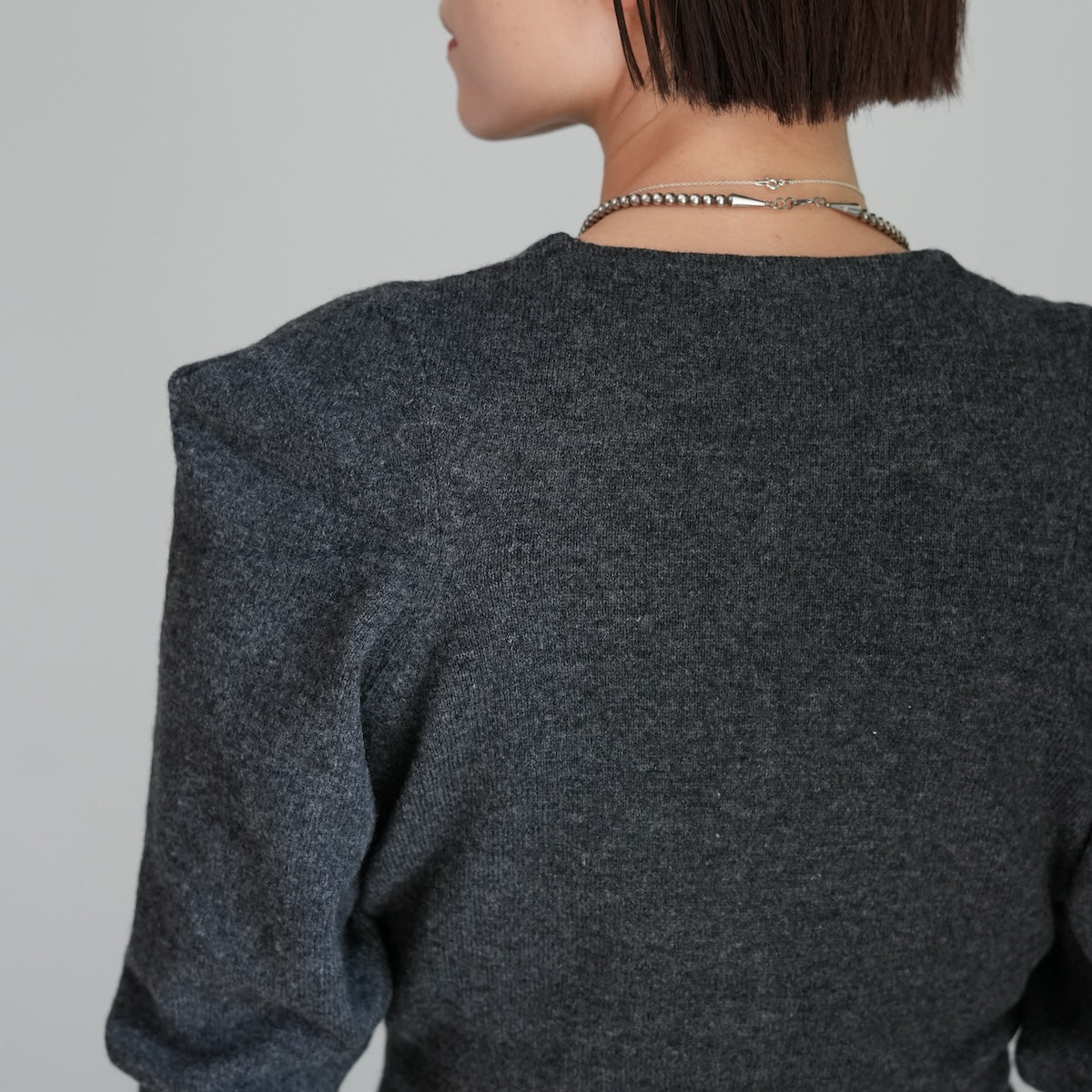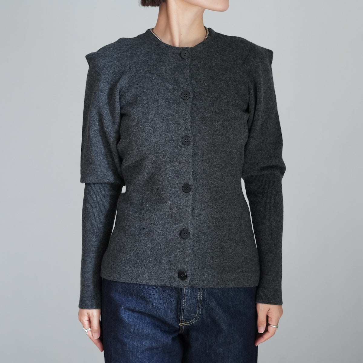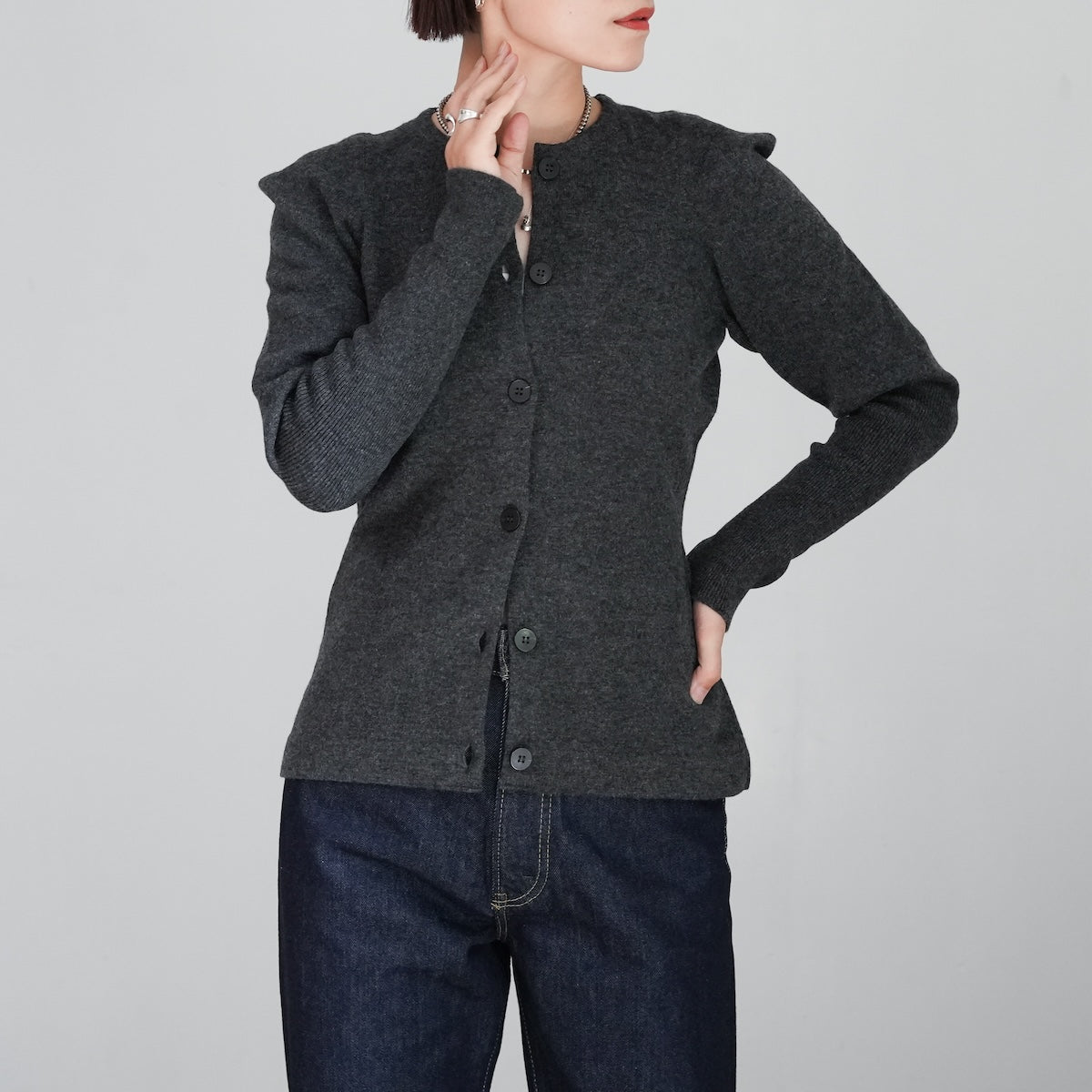 パワーショルダーが特徴的なフォルムのニットカーディガン。