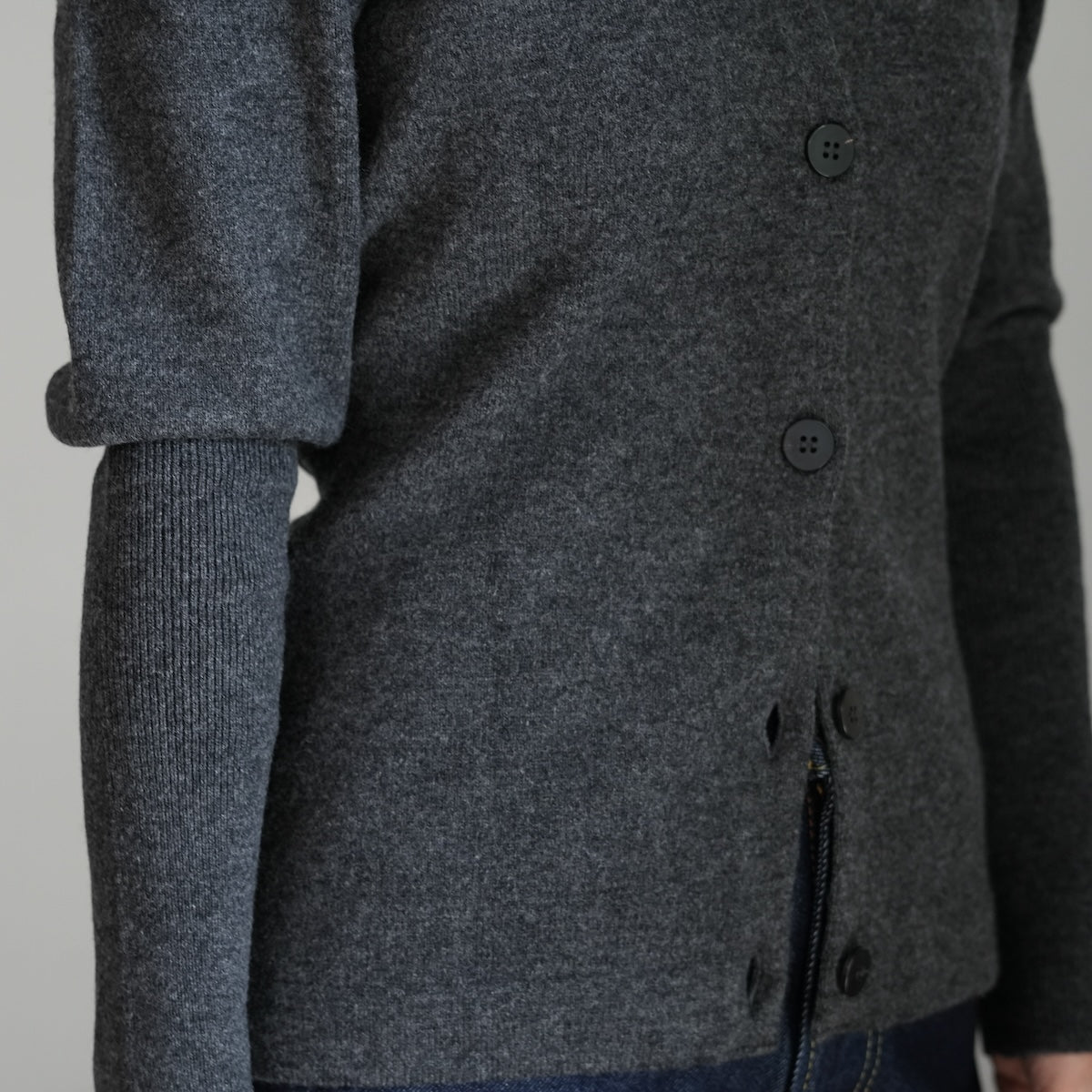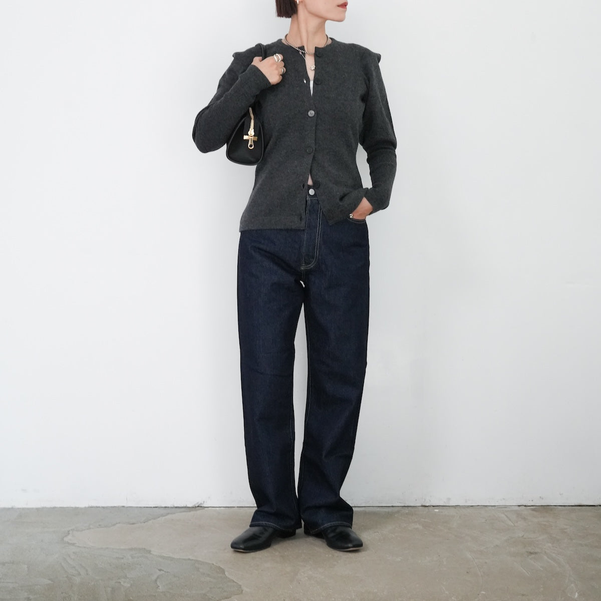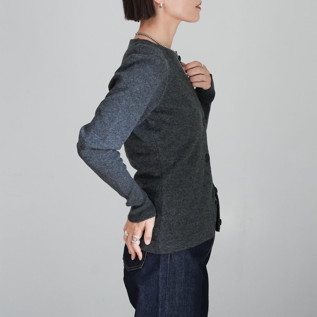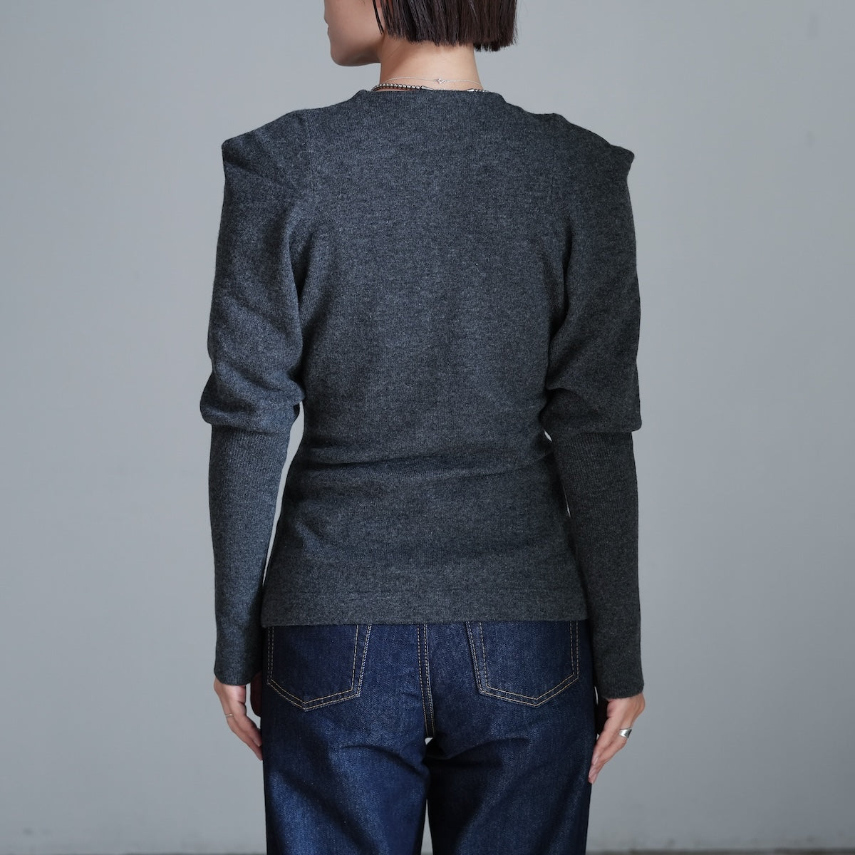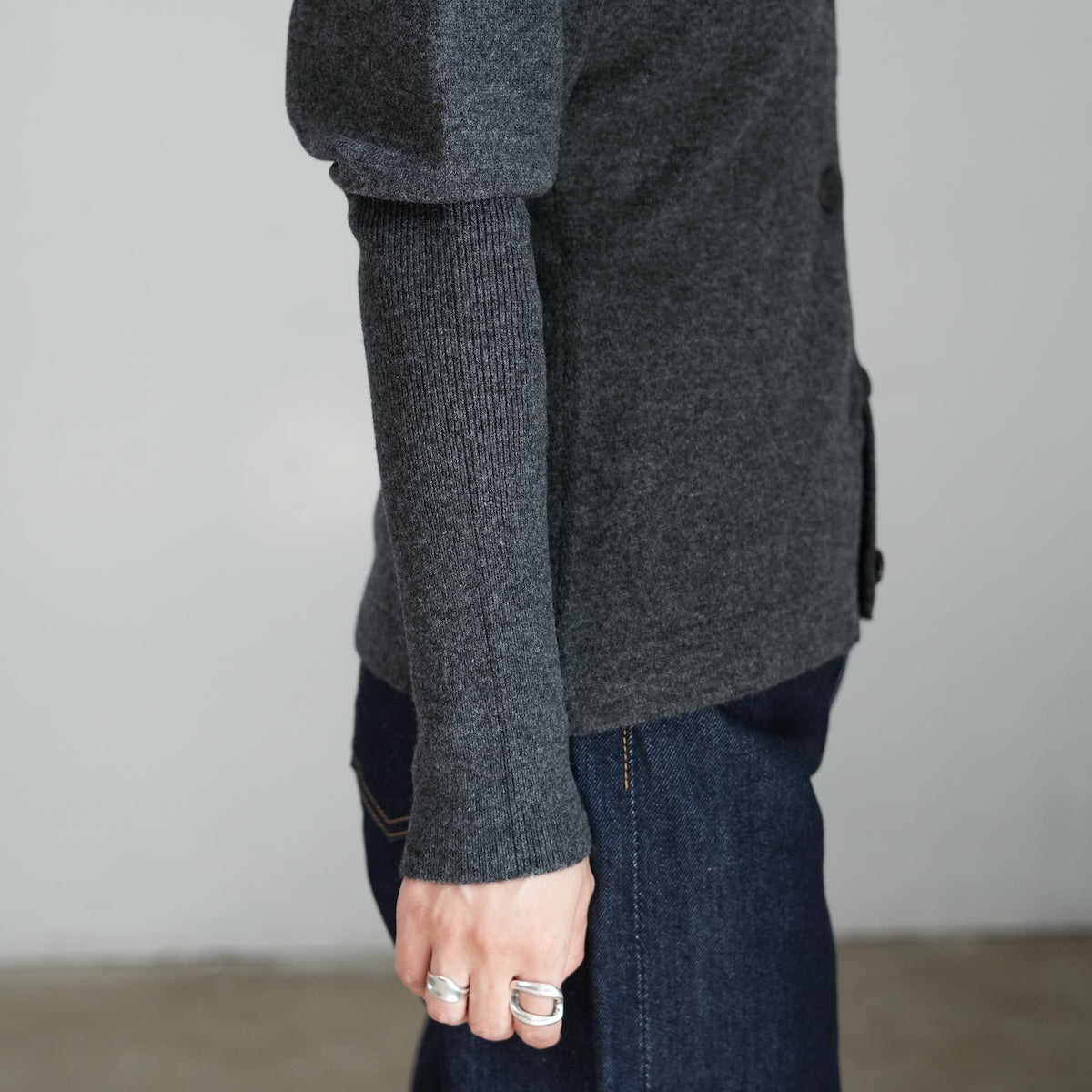 パワーショルダーが特徴的なフォルムのニットカーディガン。