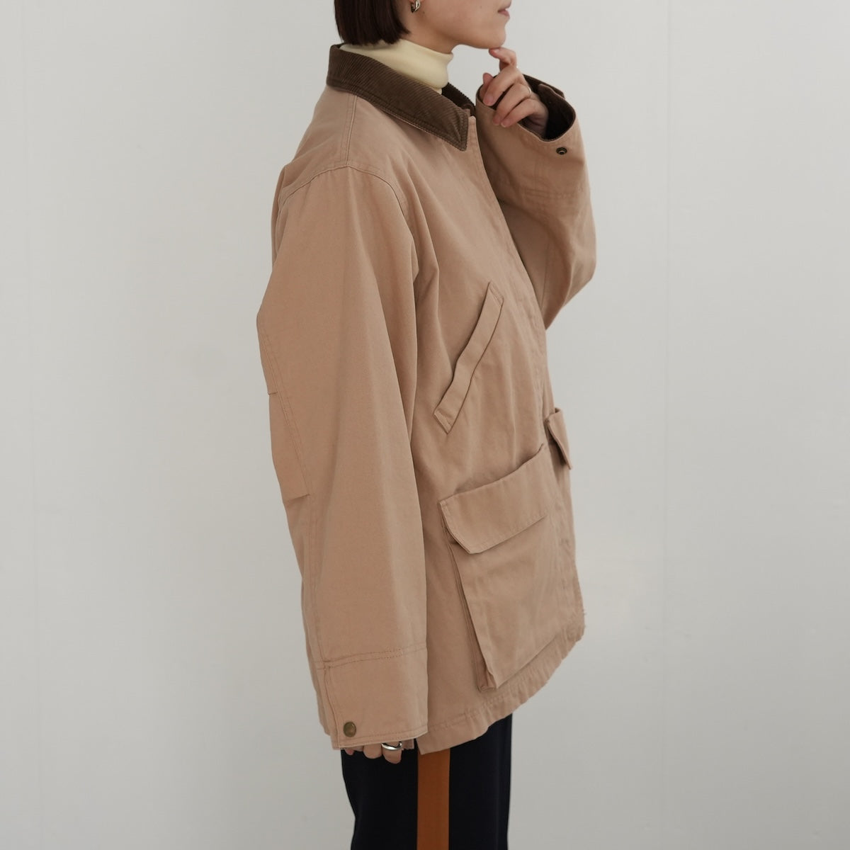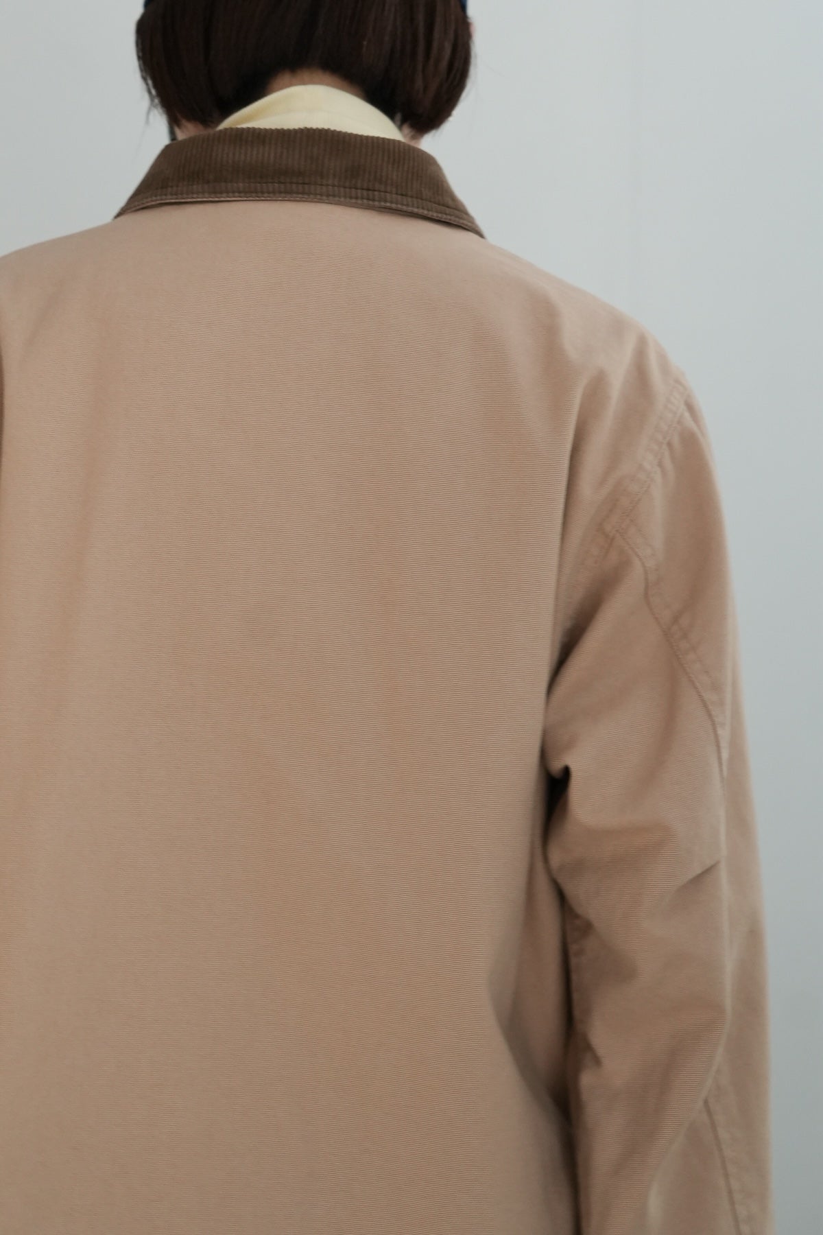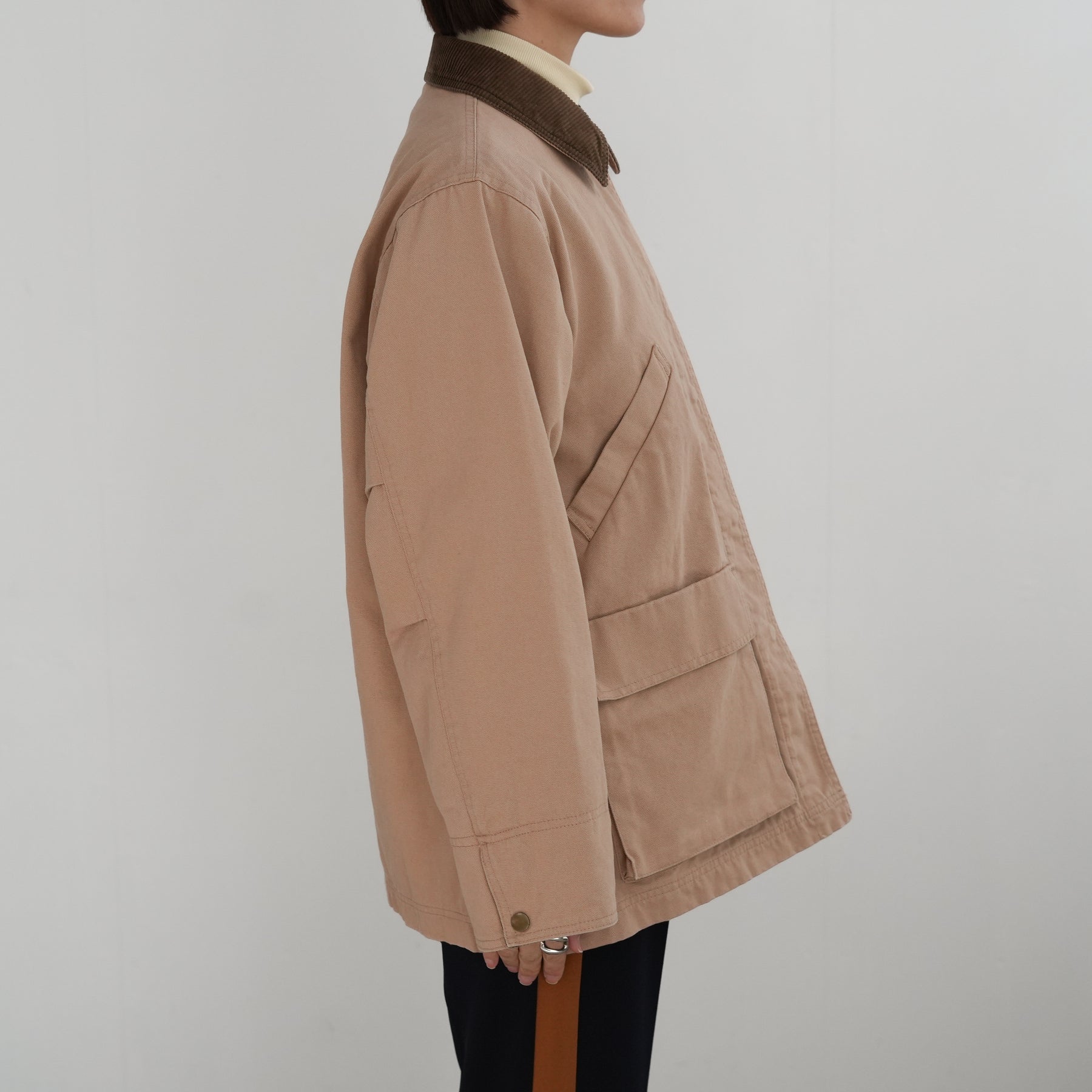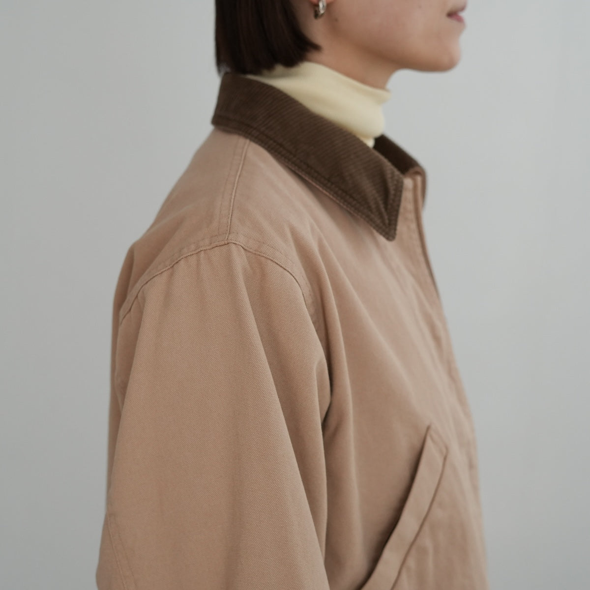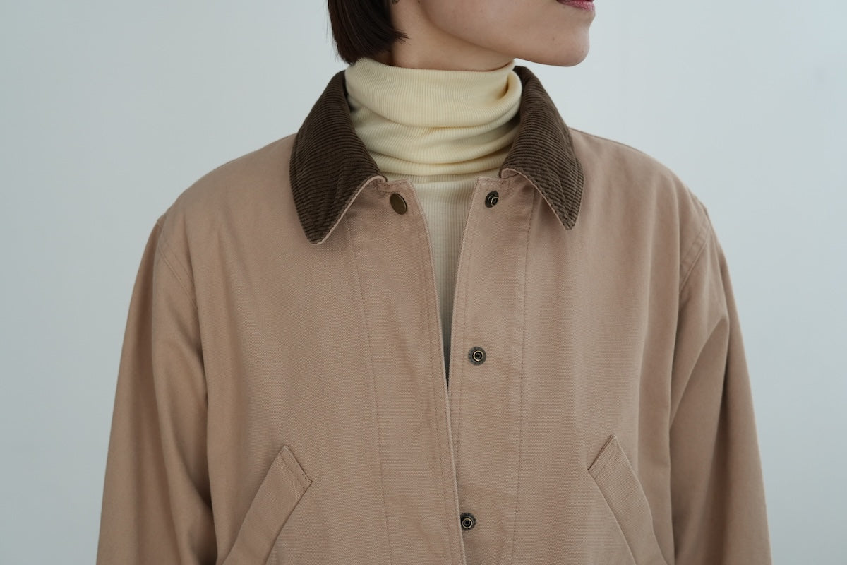 衿と袖口にコーデュロイを効かせたディテールで、個性が際立つカバーオール。