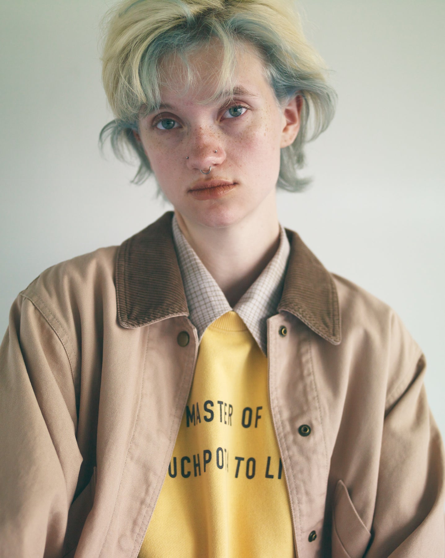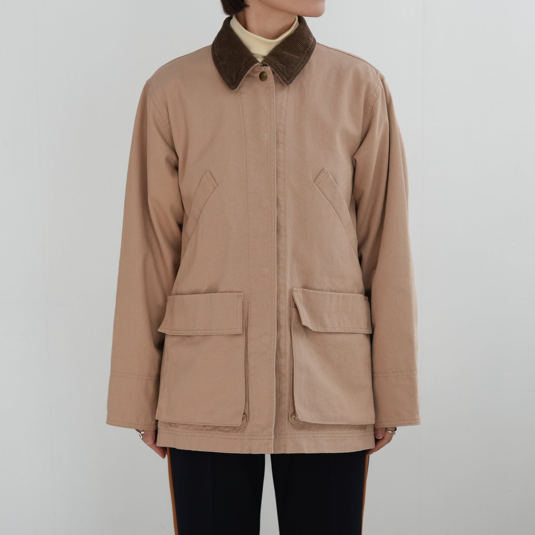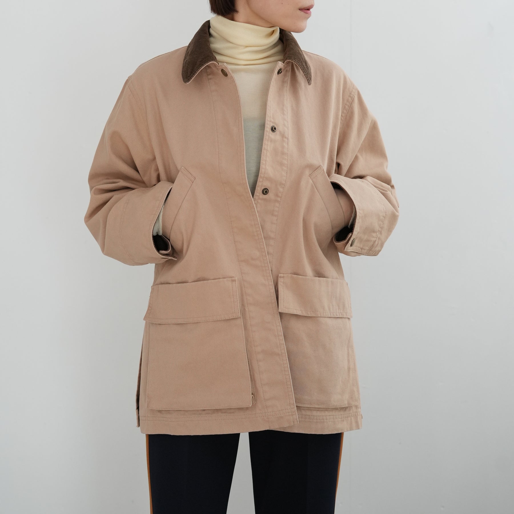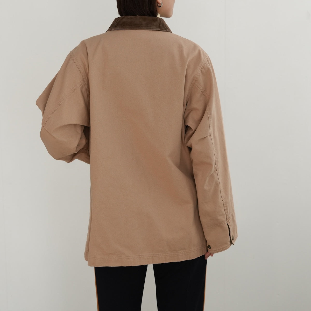 衿と袖口にコーデュロイを効かせたディテールで、個性が際立つカバーオール。
